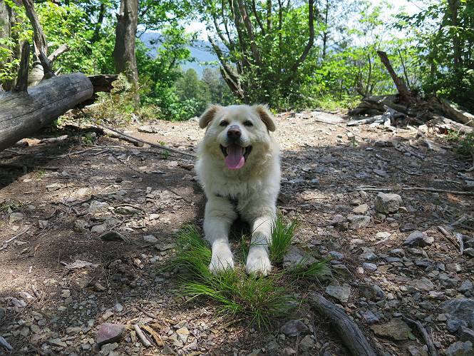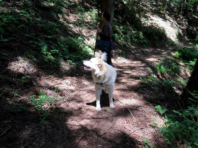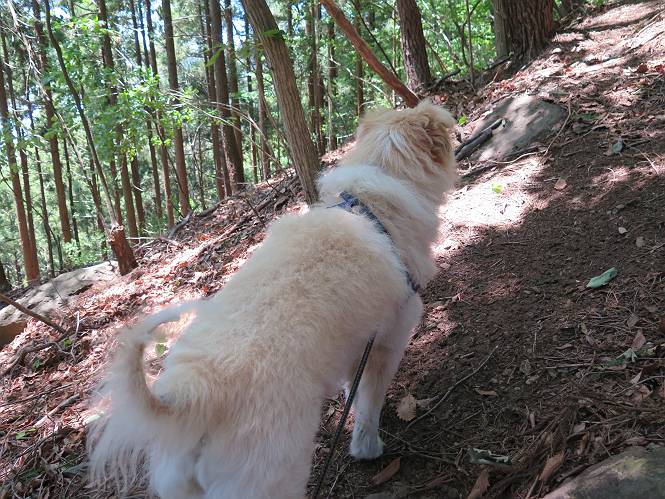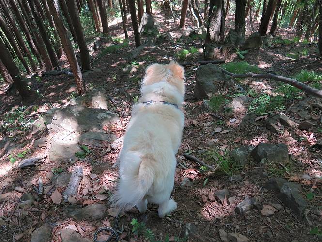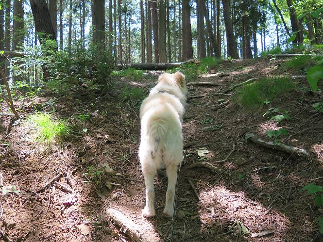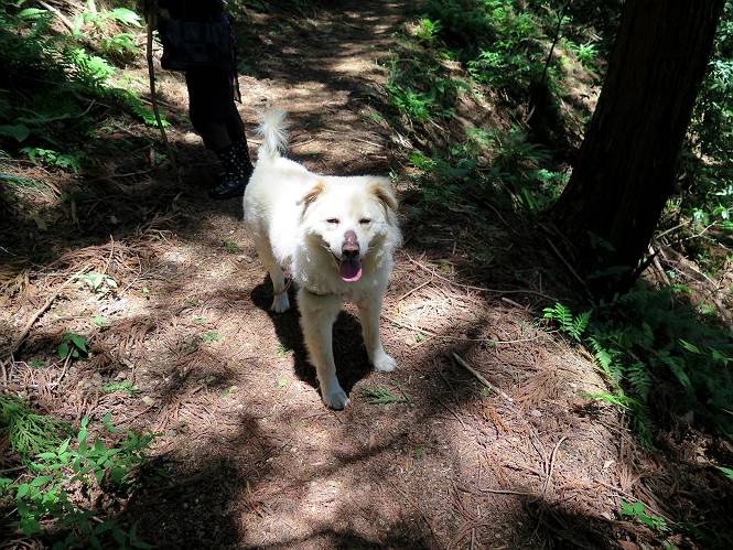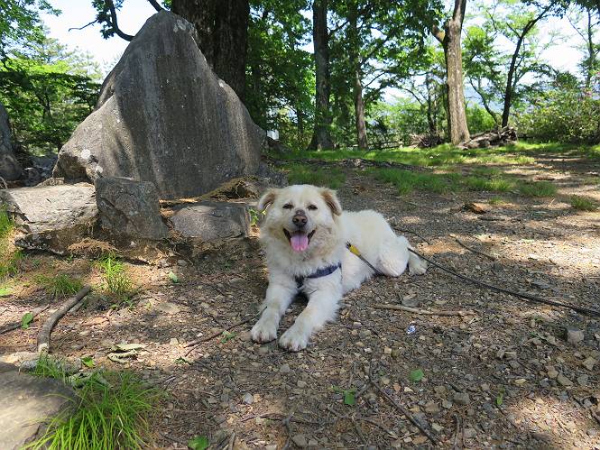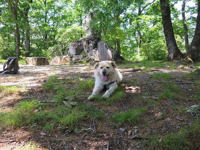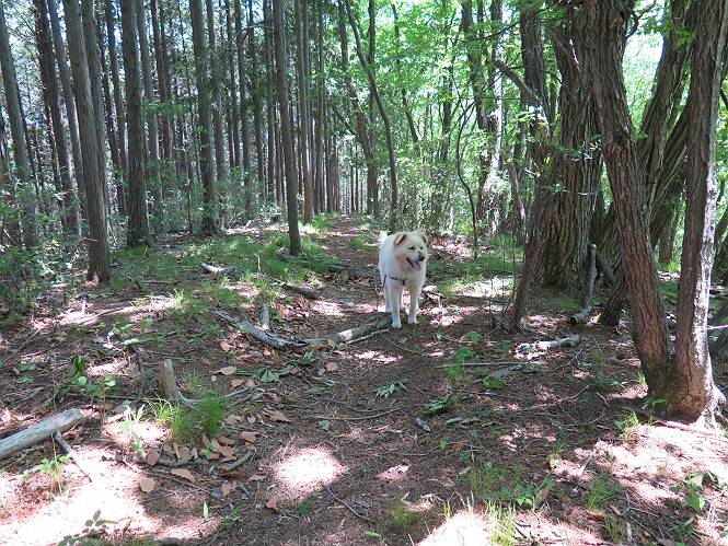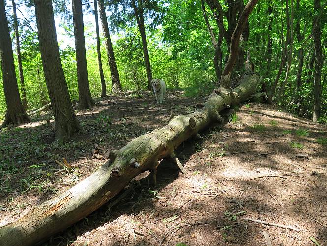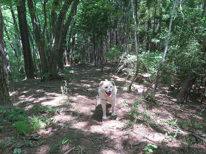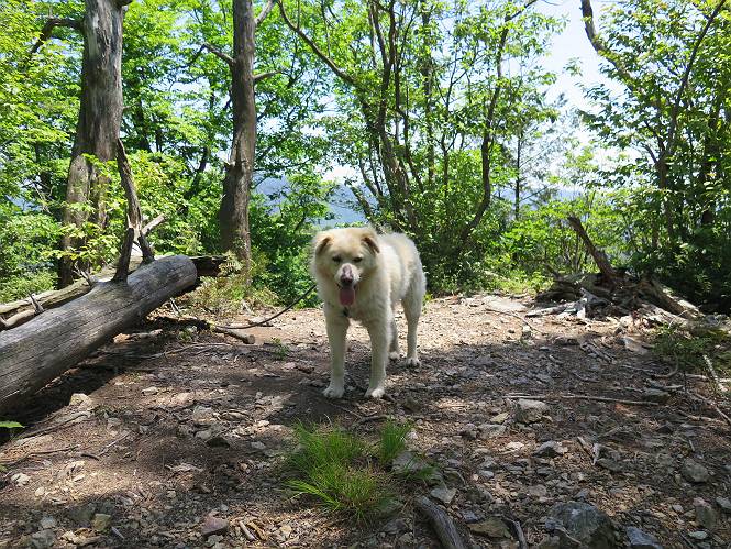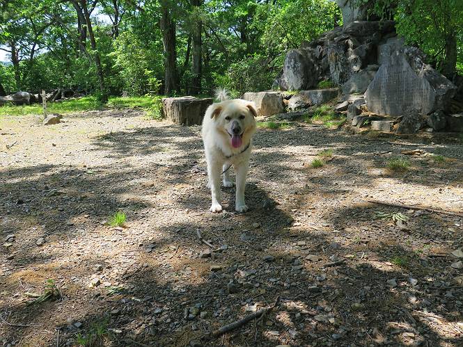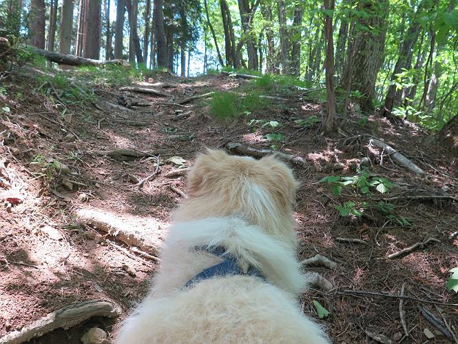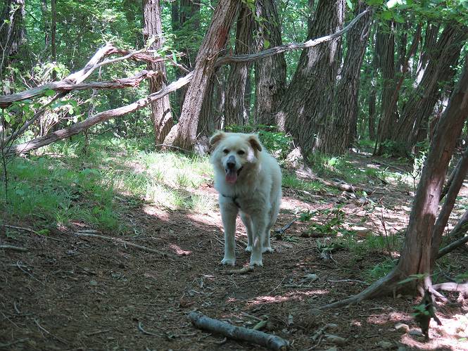 | 平成二十七年五月十四日 Before 写真集目次へ Next 「いい天気だし、もったいないなあ、忠治、お山で散歩してくるか」、「うれしいな、ワン」、でも今朝は1時間半も歩いたんです。荷物を積んで、車に乗って、まず桐生市へ、市内を抜けると柄杓山の看板を左に、ちょっと進みました。すると、止まって、「桜の城山を見損なったので、上まで行ってみようか」、とUターンして奥へ、奥へと走って、駐車場に着きました。 案内図を見て道を確かめました。 駐車場の周りには、シャガが点々と咲いてました。 さあ、出発です、今日はお母さんも一緒です。 遊歩道の入口にも地図がありました。山の名称が向こうの案内板と違う、って言ってました。 ここから細い山道になりました、ぼくが先頭、後ろにお父さん、お母さんです。 日なたは、日差しが強く、暑いですよ、 「お母さん、何が見えるん?」、「お花を見ていたんだって、ルイヨウボタンがあったそうです」 ここで道が分かれているようです、どっちへ行くのかな。 上の方へ行くことにしました。 あまり歩いてない道だね。 急坂になりました、お父さんは滑って歩きにくいようです。お母さんと大分離れてしまいました。 緩やかな道になりました、お母さんは見えなくなってしまいました。 このくらいな坂道ならいいのですが、・・・ また、急坂になりました。 この坂、どこまで続くのだろう。 「山頂は、まだ?」、 「もうちょっとだってさ」 もうちょっと、って長いねぇ。 あと、ちょっとだ、ガンバロウ やれやれ、着いたのかな。 あそこが山頂だ。 山頂、到着です。 疲れました。 お水とオヤツをもらって、 おやすみしてます。 ところが、お父さんは、「忠治、変だなあ、この先にピークがあるぞ」、っていうのです。 茂みをぬけて見えない山頂へと進みます。 あまり下らず、一登りして山頂にでました。 今度は、本当の山頂かな? 山頂には、桐生市基準点No.108と支柱が埋めてありました。でも山頂の標識などありませんでした。 ぼくは、お休み中です。 すると、「この先に二つピークがあるぞ、おかしいなあ。もしかして主稜線の近くまで来てしまったのでは?」、と言うのです。そして、「もう、戻ろう」、と言いました。 さっき、休んだ場所へ、 倒木を乗り越えて、 途中まで急坂を下ると、お母さんが待ってました。 一緒に下って、 間違った分岐点に出て、正しい道を歩いて、 城山山頂に到着しました。 柄杓山の碑 、 三角点がありました。 南側は桜の木の緑につつまれ、オオムラサキというツツジが咲いてました。 ぼく、つかれちゃったよ。 木陰で、風が少しあって、涼しいです。 山頂を回り込んで下り、 遊歩道から、 ![]() 林道に出て、 途中で沢の冷たい水を頂いて、 車に戻りました、ああ、楽しかった、満足、満足です。 Before 写真集目次へ Next |