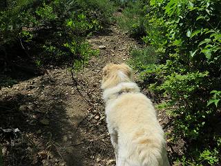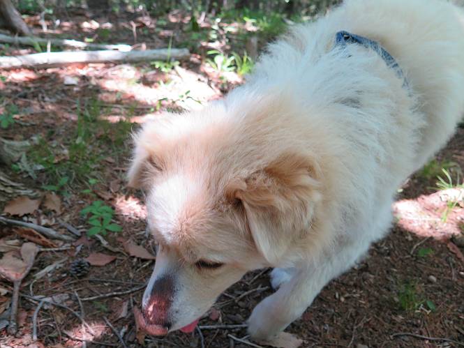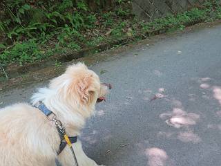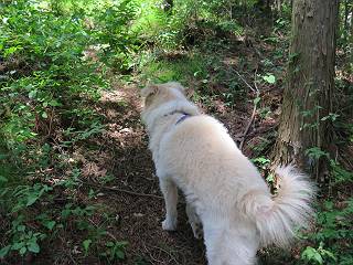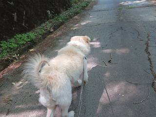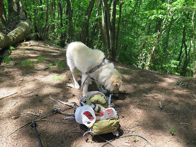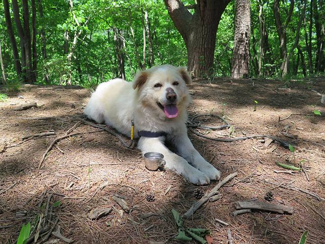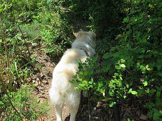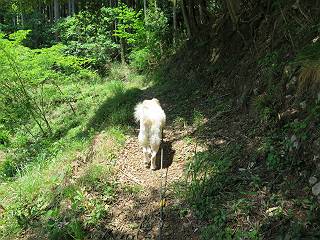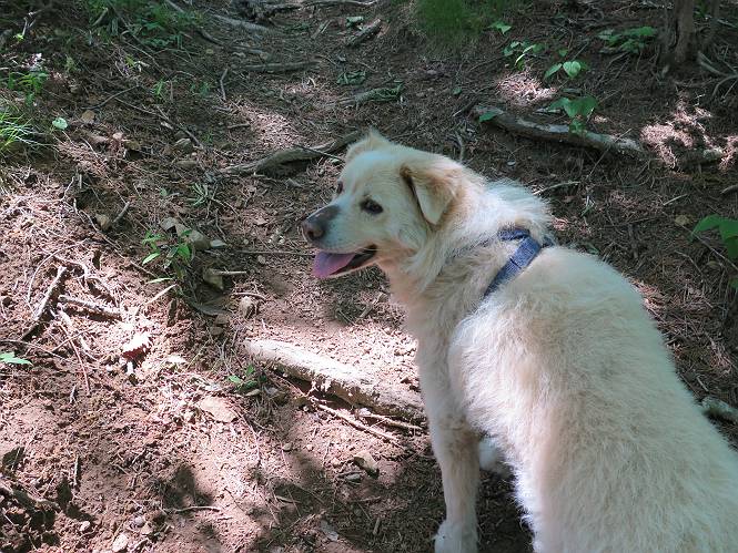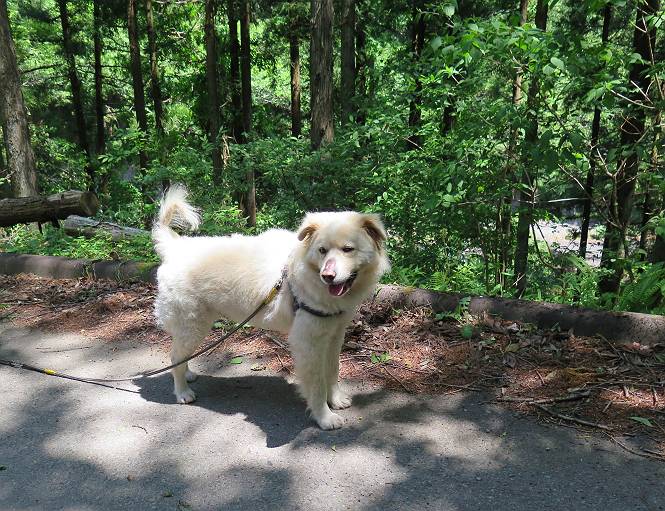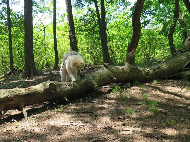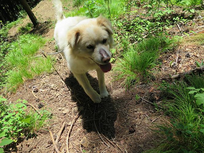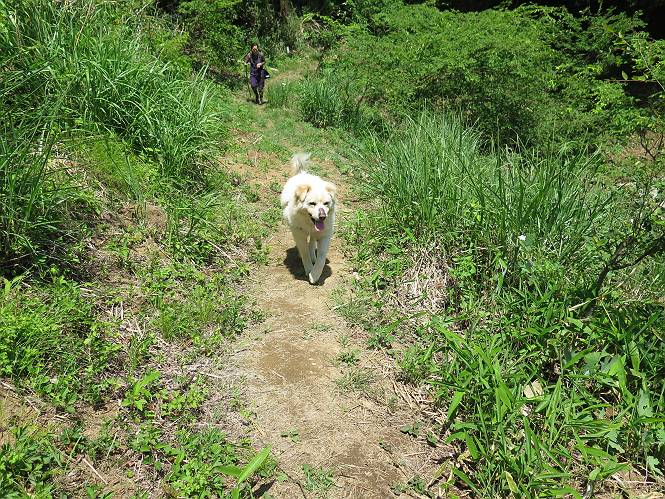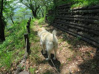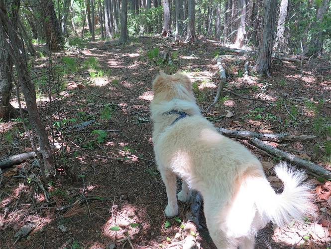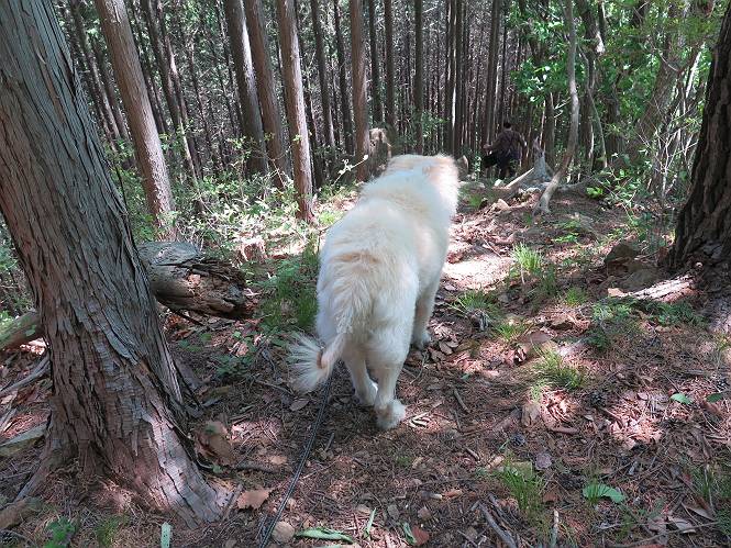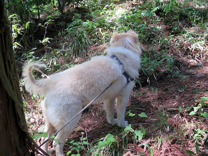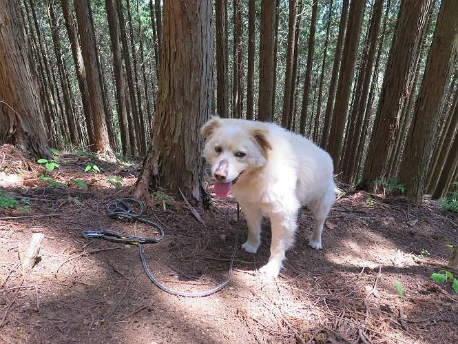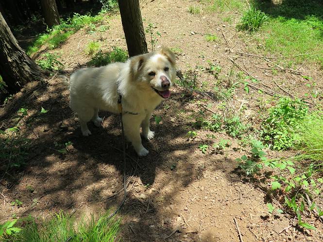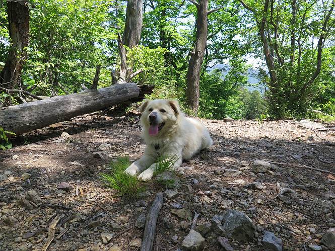 | 平成二十七年五月十四日 Before 写真集目次へ Next 「いい天気だし、もったいないなあ、忠治、お山で散歩してくるか」、「うれしいな、ワン」、でも今朝は1時間半も歩いたんです。荷物を積んで、車に乗って、まず桐生市へ、市内を抜けると柄杓山の看板を左に、ちょっと進みました。すると、止まって、「桜の城山を見損なったので、上まで行ってみようか」、とUターンして奥へ、奥へと走って、駐車場に着きました。 案内図を見て道を確かめました。 駐車場の周りには、シャガが点々と咲いてました。 さあ、出発です、今日はお母さんも一緒です。 遊歩道の入口にも地図がありました。山の名称が向こうの案内板と違う、って言ってました。 ここから細い山道になりました、ぼくが先頭、後ろにお父さん、お母さんです。 日なたは、日差しが強く、暑いですよ、 「お母さん、何が見えるん?」、「お花を見ていたんだって、ルイヨウボタンがあったそうです」 ここで道が分かれているようです、どっちへ行くのかな。 上の方へ行くことにしました。 あまり歩いてない道だね。 急坂になりました、お父さんは滑って歩きにくいようです。お母さんと大分離れてしまいました。 緩やかな道になりました、お母さんは見えなくなってしまいました。 このくらいな坂道ならいいのですが、・・・ また、急坂になりました。 この坂、どこまで続くのだろう。 「山頂は、まだ?」、 「もうちょっとだってさ」 もうちょっと、って長いねぇ。 あと、ちょっとだ、ガンバロウ やれやれ、着いたのかな。 あそこが山頂だ。 山頂、到着です。 疲れました。 お水とオヤツをもらって、 おやすみしてます。 ところが、お父さんは、「忠治、変だなあ、この先にピークがあるぞ」、っていうのです。 茂みをぬけて見えない山頂へと進みます。 あまり下らず、一登りして山頂にでました。 今度は、本当の山頂かな? 山頂には、桐生市基準点No.108と支柱が埋めてありました。でも山頂の標識などありませんでした。 ぼくは、お休み中です。 すると、「この先に二つピークがあるぞ、おかしいなあ。もしかして主稜線の近くまで来てしまったのでは?」、と言うのです。そして、「もう、戻ろう」、と言いました。 さっき、休んだ場所へ、 倒木を乗り越えて、 途中まで急坂を下ると、お母さんが待ってました。 一緒に下って、 間違った分岐点に出て、正しい道を歩いて、 城山山頂に到着しました。 柄杓山の碑 、 三角点がありました。 南側は桜の木の緑につつまれ、オオムラサキというツツジが咲いてました。 ぼく、つかれちゃったよ。 木陰で、風が少しあって、涼しいです。 山頂を回り込んで下り、 遊歩道から、 ![]() 林道に出て、 途中で沢の冷たい水を頂いて、 車に戻りました、ああ、楽しかった、満足、満足です。 Before 写真集目次へ Next |