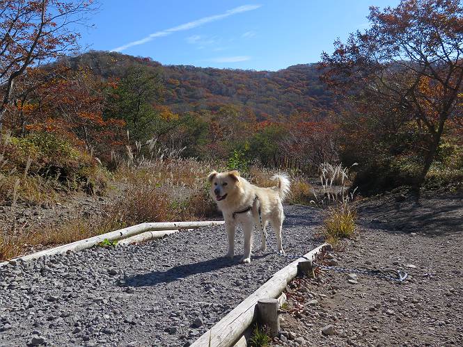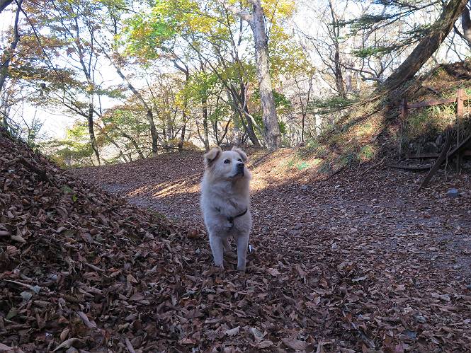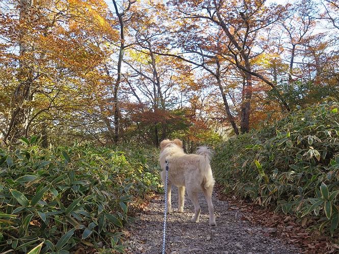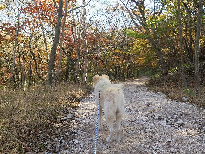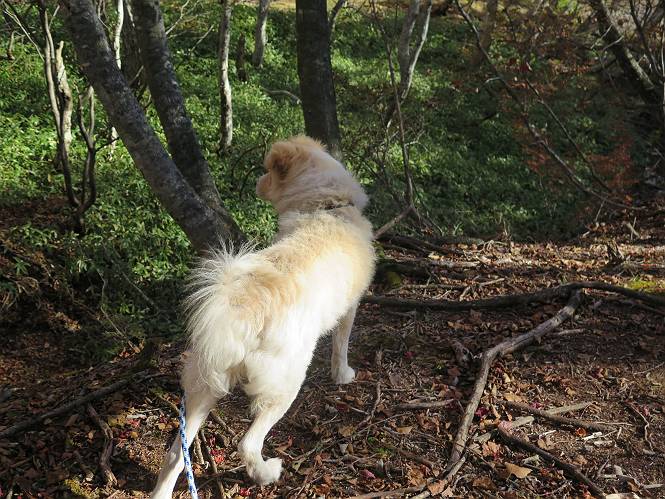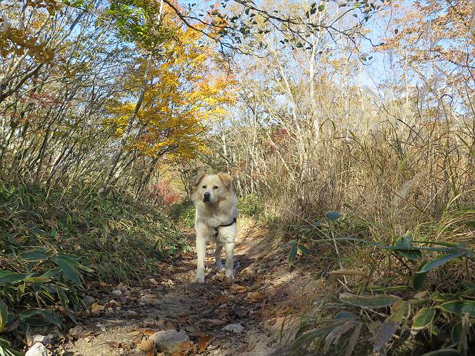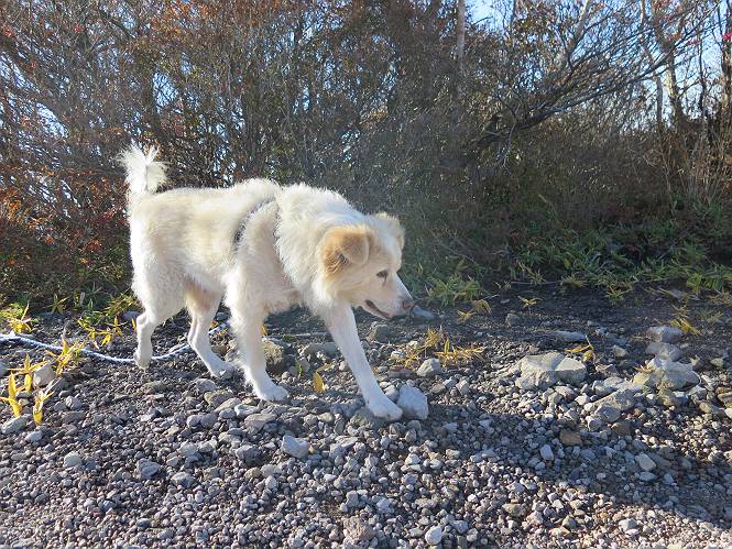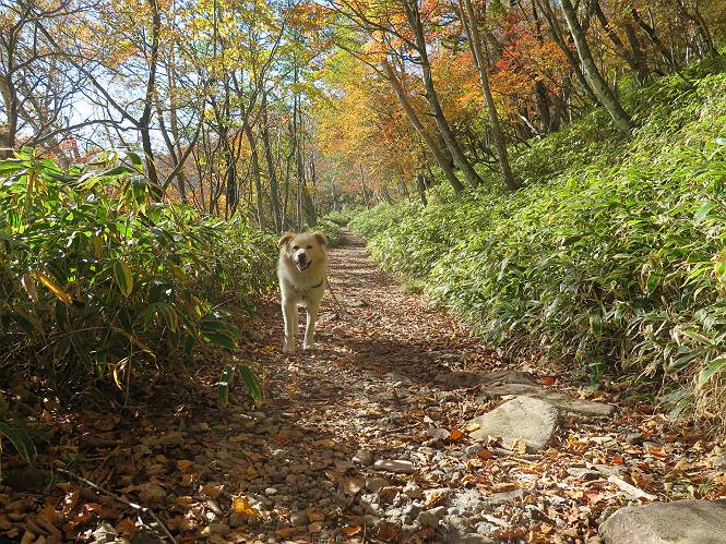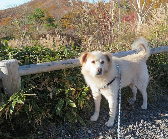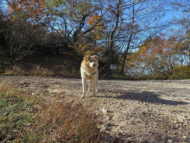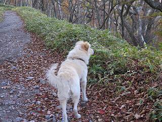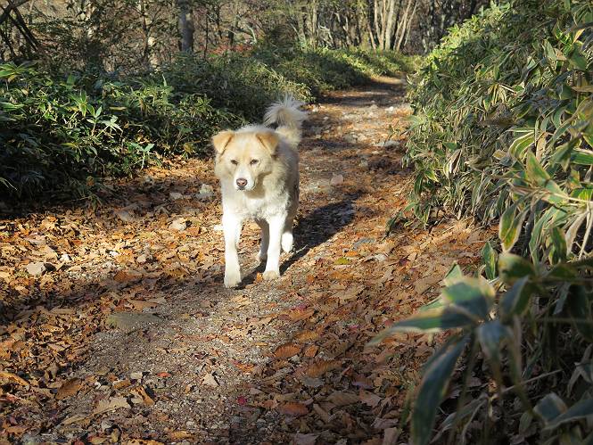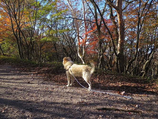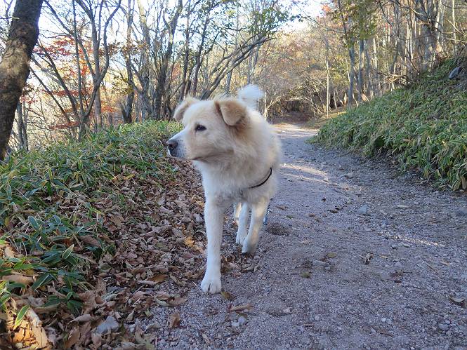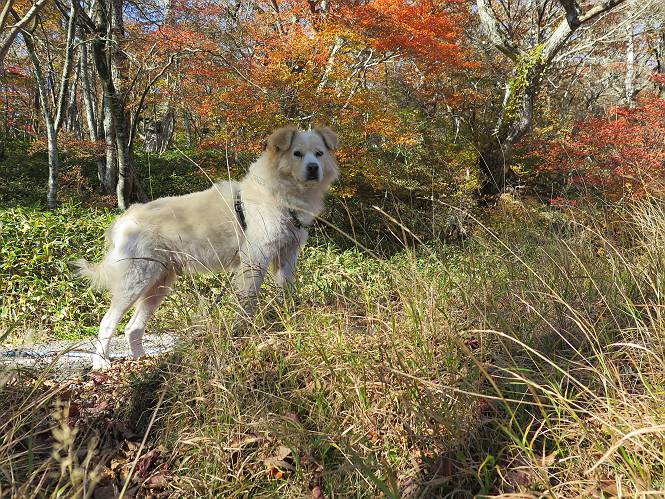 | 平成二十七年十月十五日 Before 写真集目次へ Next 足を怪我して2ケ月過ぎました。朝夕の散歩は普通に歩けてますが、時々ビッコをひいて、「まだ、だなあ」、と言われて、山には行ってませんでした。今日は、一番l簡単そうな、赤城の長七郎山に連れてってもらえることになりました。うれしくて、うれしくて、「ワン、ワン」吠えてしまいました。 赤城山は紅葉真っ盛り、7時前ですが、いっぱい車が停まってました。ここは小沼の駐車場ですが、20台ほどです。出発です、右回りで一周します。 しばらくぶりで、少し緊張するなあ。 小沼の南の浅香嶺、紅葉がきれいですね。カメラを構えた人が、沢山いますよ。 ぼくのすぐ前にもいます。わざわざ逆光で撮っているんですって。 赤城の山が見えるところに出ました。 右が駒ヶ岳、左が黒檜山です。 左は大沼のまわりです、紅葉がきれいですね。 奥に見えるのは、武尊山ですって。 一番左はアンテナが沢山立っている地蔵岳です。 みんな、何を撮っているんだろうね。 ここから長七郎山に上がって行きます。林道のような道をしばらく歩きます。 道に沿って、赤、黄、橙、色んな色、キレーイ。 真っ赤なカエデです。 お父さんは、写真ばかり撮っていて、なかなか進みません。 今日は、ゆっくりと、ぼくの足慣らし、だってさ。 おやおや、緑と黄色、これもいいね。 黄葉の始まりだって。 ふーん、そういうことか。 「忠治、ゆっくり、そんなに早く歩くな!」、 こんなに良い道だものね。 あれっ、行き止まり?、と思ったら道が狭くなるんだ。 北寄りに、山並が見えました、皇海山と袈裟丸山だそうです。 「石ころ、根っこ、気をつけるんだぞ」 今度は、草と笹の間を歩いてます。 ロープの外は崖になっているそうです。 笹の道を抜けたかと思ったら、 続きがありました。 その先は、長七郎山の山頂のようです。 長七郎山山頂到着です。 姿勢を正して、黒檜山を入れてもう一枚。 黒檜山山の東に、日光白根山と皇海山が見えてます、大きくして撮りました。 長ーい休憩をして、おやつ」と水を頂きました。後ろは地蔵岳です。 地蔵岳の左には荒山、となり奥に浅間山が見えてます。 東側はススキが茂っていて見えません。 そろそろ、下るんですって。 「忠治、ゆっくりだぞ」 ちょっと下ると、平で広い場所に出ました。 隅の方を回ってます。 別に意味はないのです、遊んでいるだけです。 ガレた場所を通って、また広い場所に出ました。 また、細い道になるようです。 紅葉した木が出てきました。 この木もカエデかな?、と言ってました。 ここで、山はお終いですって、あとは林道歩きだそうです。 きれいだな。 ちょっと降りてみたいなあ。 ちょっとだけ、林の中を歩きました。 危ない場所はありませんでした。 紅葉のトンネルを通って、 少し、進みますと、 小沼尻に出ました 小沼尻から見た黒檜山です。 こちらは、地蔵岳です。 湖畔の道沿いにはずーと紅葉が続いてました。 紅葉を入れてぼくも撮ってもらいました。 こんなポーズ、いいでしょう。 お父さんが、「小沼周辺の紅葉が、一番いいかな」、って言ってました。 きれいだったね、後ろの山が歩いてきた長七郎山です。 道路に出ました。 「忠治、端を歩け!」 駐車場に戻りました。 おやつをもらって、「忠治、車に乗った!」 「ぼく、嫌だよ、まだ帰りたくないよ」 そんなわけで、2ケ月ぶり、一番簡単な長七郎山を時間をかけて、ゆっくり、足場の良い場所を選びながら歩きました。この調子なら、簡単な山を何度か繰り返せば、・・・・・、と言ってました、良かった。 Before 写真集目次へ Next |