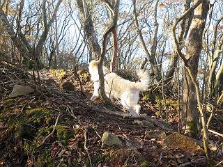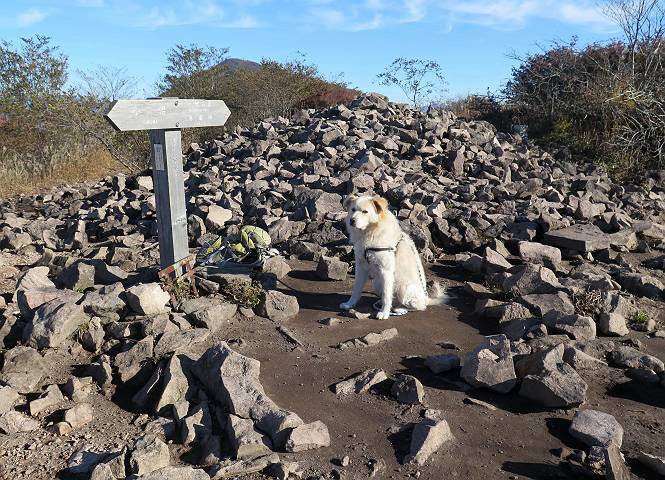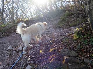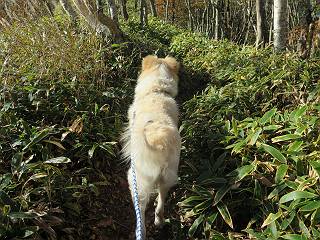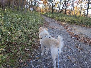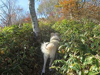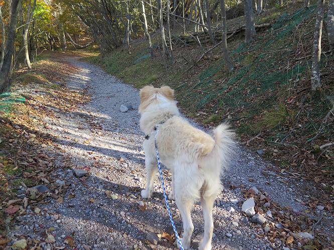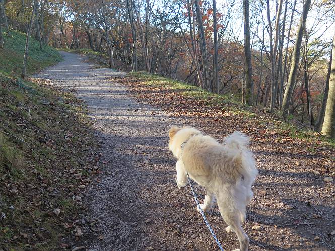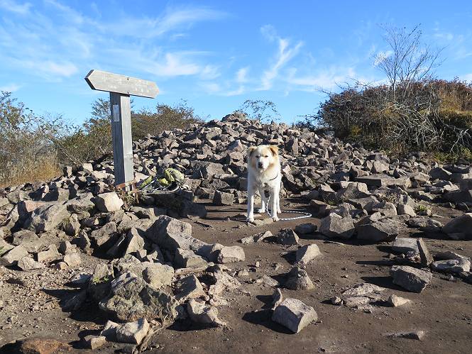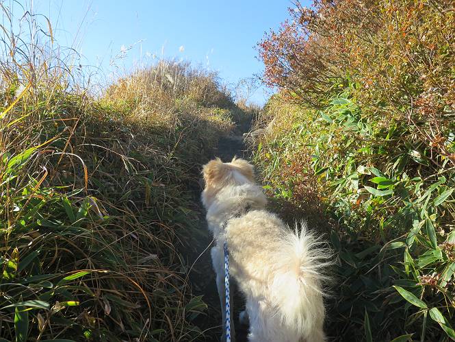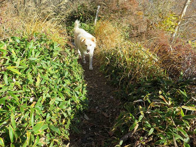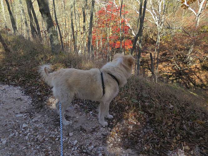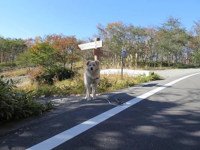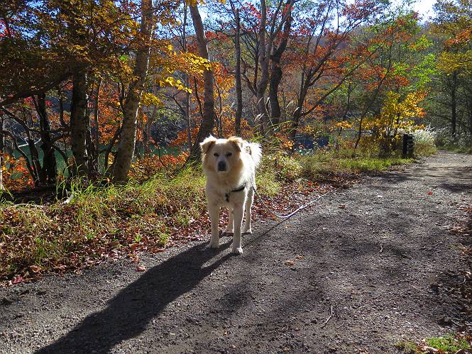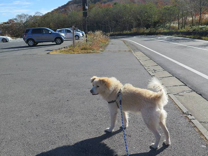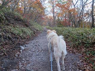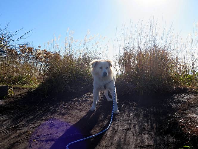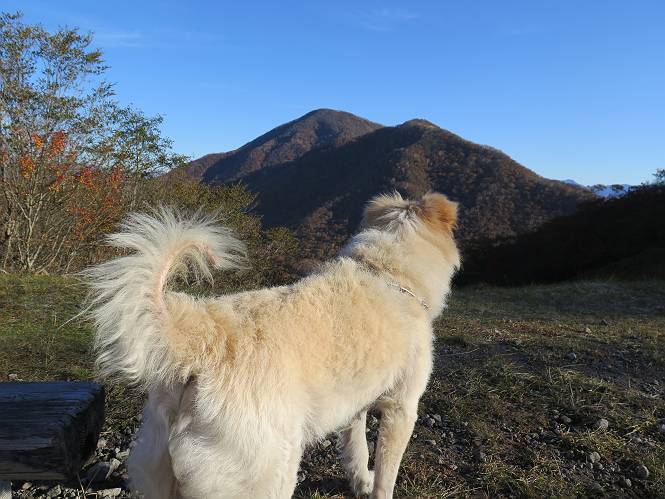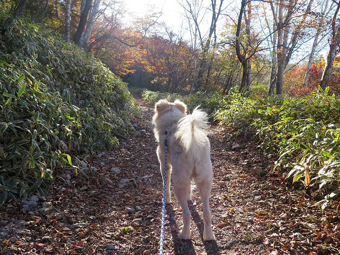 | 平成二十七年十月十五日 Before 写真集目次へ Next 足を怪我して2ケ月過ぎました。朝夕の散歩は普通に歩けてますが、時々ビッコをひいて、「まだ、だなあ」、と言われて、山には行ってませんでした。今日は、一番l簡単そうな、赤城の長七郎山に連れてってもらえることになりました。うれしくて、うれしくて、「ワン、ワン」吠えてしまいました。 赤城山は紅葉真っ盛り、7時前ですが、いっぱい車が停まってました。ここは小沼の駐車場ですが、20台ほどです。出発です、右回りで一周します。 しばらくぶりで、少し緊張するなあ。 小沼の南の浅香嶺、紅葉がきれいですね。カメラを構えた人が、沢山いますよ。 ぼくのすぐ前にもいます。わざわざ逆光で撮っているんですって。 赤城の山が見えるところに出ました。 右が駒ヶ岳、左が黒檜山です。 左は大沼のまわりです、紅葉がきれいですね。 奥に見えるのは、武尊山ですって。 一番左はアンテナが沢山立っている地蔵岳です。 みんな、何を撮っているんだろうね。 ここから長七郎山に上がって行きます。林道のような道をしばらく歩きます。 道に沿って、赤、黄、橙、色んな色、キレーイ。 真っ赤なカエデです。 お父さんは、写真ばかり撮っていて、なかなか進みません。 今日は、ゆっくりと、ぼくの足慣らし、だってさ。 おやおや、緑と黄色、これもいいね。 黄葉の始まりだって。 ふーん、そういうことか。 「忠治、ゆっくり、そんなに早く歩くな!」、 こんなに良い道だものね。 あれっ、行き止まり?、と思ったら道が狭くなるんだ。 北寄りに、山並が見えました、皇海山と袈裟丸山だそうです。 「石ころ、根っこ、気をつけるんだぞ」 今度は、草と笹の間を歩いてます。 ロープの外は崖になっているそうです。 笹の道を抜けたかと思ったら、 続きがありました。 その先は、長七郎山の山頂のようです。 長七郎山山頂到着です。 姿勢を正して、黒檜山を入れてもう一枚。 黒檜山山の東に、日光白根山と皇海山が見えてます、大きくして撮りました。 長ーい休憩をして、おやつ」と水を頂きました。後ろは地蔵岳です。 地蔵岳の左には荒山、となり奥に浅間山が見えてます。 東側はススキが茂っていて見えません。 そろそろ、下るんですって。 「忠治、ゆっくりだぞ」 ちょっと下ると、平で広い場所に出ました。 隅の方を回ってます。 別に意味はないのです、遊んでいるだけです。 ガレた場所を通って、また広い場所に出ました。 また、細い道になるようです。 紅葉した木が出てきました。 この木もカエデかな?、と言ってました。 ここで、山はお終いですって、あとは林道歩きだそうです。 きれいだな。 ちょっと降りてみたいなあ。 ちょっとだけ、林の中を歩きました。 危ない場所はありませんでした。 紅葉のトンネルを通って、 少し、進みますと、 小沼尻に出ました 小沼尻から見た黒檜山です。 こちらは、地蔵岳です。 湖畔の道沿いにはずーと紅葉が続いてました。 紅葉を入れてぼくも撮ってもらいました。 こんなポーズ、いいでしょう。 お父さんが、「小沼周辺の紅葉が、一番いいかな」、って言ってました。 きれいだったね、後ろの山が歩いてきた長七郎山です。 道路に出ました。 「忠治、端を歩け!」 駐車場に戻りました。 おやつをもらって、「忠治、車に乗った!」 「ぼく、嫌だよ、まだ帰りたくないよ」 そんなわけで、2ケ月ぶり、一番簡単な長七郎山を時間をかけて、ゆっくり、足場の良い場所を選びながら歩きました。この調子なら、簡単な山を何度か繰り返せば、・・・・・、と言ってました、良かった。 Before 写真集目次へ Next |