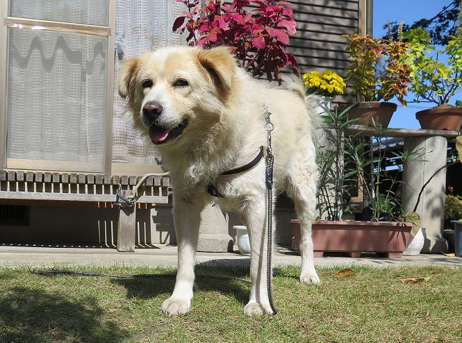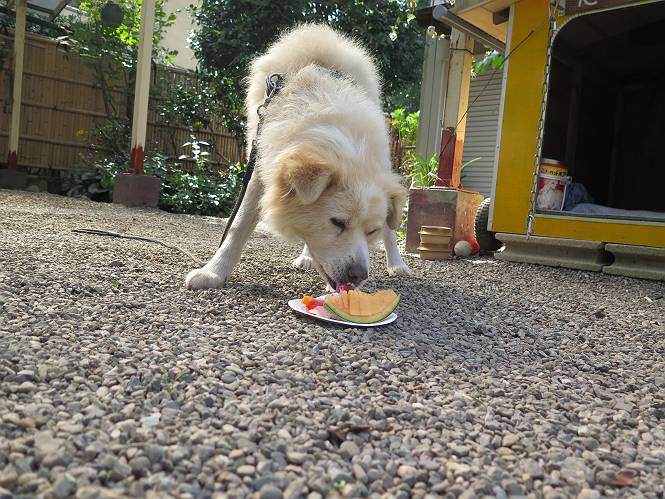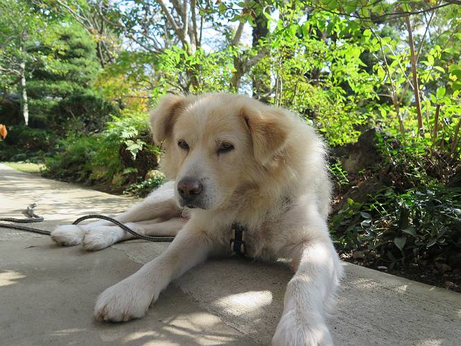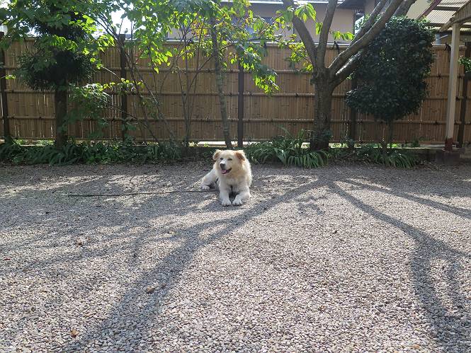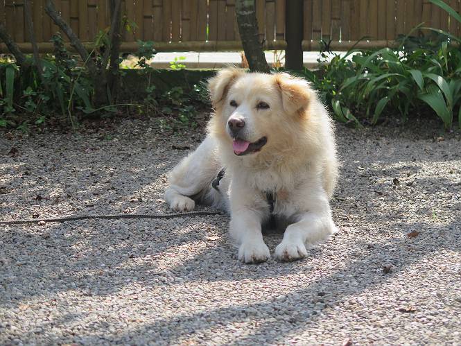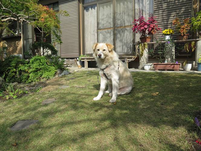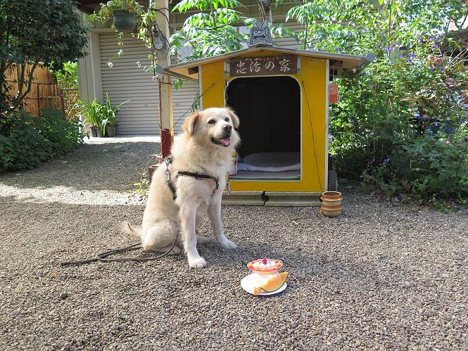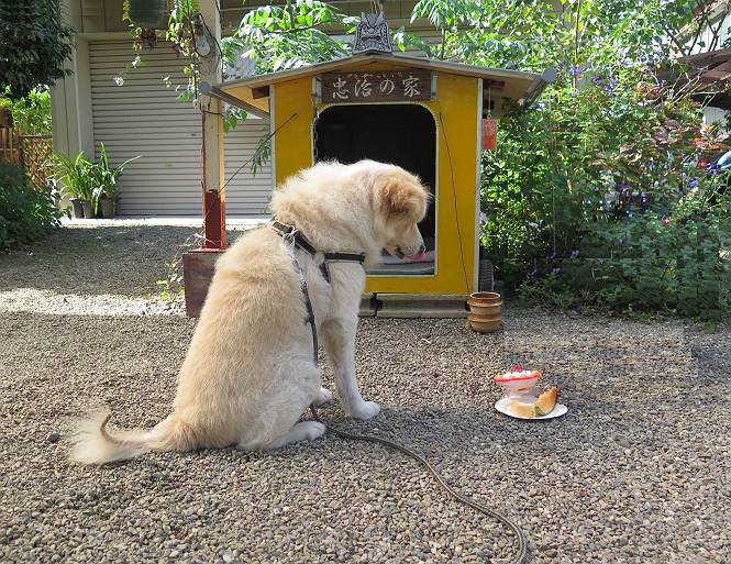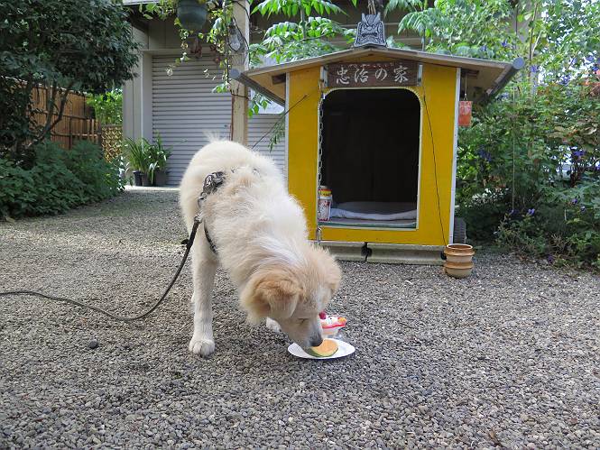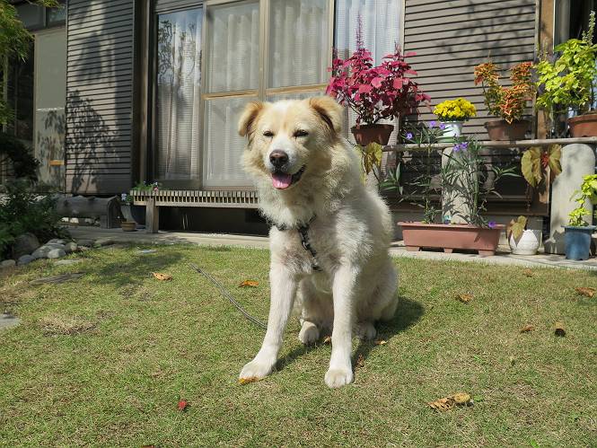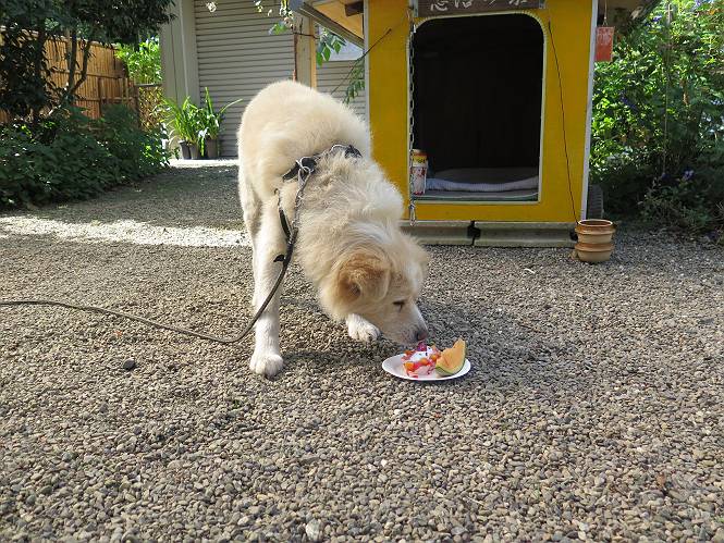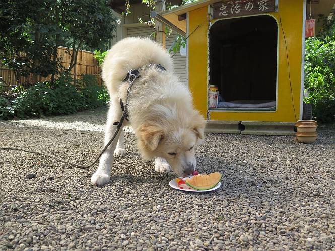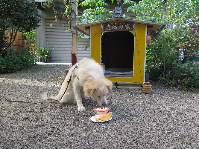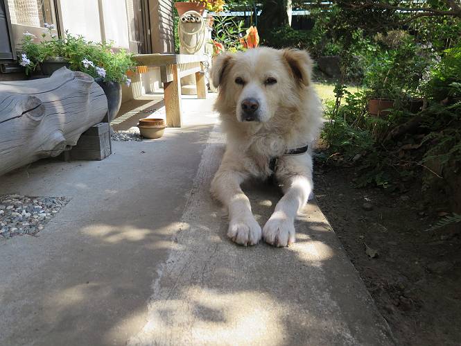 平成二十七年十月十八日 Before 写真集目次へ Next 足の怪我もだいぶ良くなって一安心だ、って言ってました。赤城山から3日目、今日はお父さんもお母さんも家にいるので、一日早い誕生日を祝ってもらいました。 下の5枚は、15日に赤城山から戻った時の写真です。 木陰で一休みしました。 夕方は、いつも通り散歩もしてきました。 おやつも頂きましたが、夕飯は普通に頂きます。 お山へ、時々行くか?、って言ってましたので楽しみです。斜面、とかゴロゴロした石のある道とか、歩き方は普通だって言ってました。 そして今日は、一日早い誕生日のお祝いをしてもらいました。 お母さんが買い物に行ってます。ぼくは庭を行ったり来たり、 まだかな、早く来ないかなあ。 陽が出てきて、暑くて、木陰で待ってます。 「あっ、お母さんが帰ってきた」 「おいしいケーキかな」 おいしそうだ、ケーキとメロンとタマゴの寿司です。 「まだ、?」、「良し!、食べていいよ」 ケーキから食べようかな、 最初に寿司を頂いて、 次はケーキだね、 小さく、ナイフを入れてもらいました。 おいしいな、凍っていて冷たいんだよ。 誕生日っていいねえ。 でもね、ちょっと怪我をしちゃったけれど、この1年健康で過ごせた、ご褒美だってさ。 ぼく、10歳になっちゃったんだよ、最近では老犬なんて言われるのですが、お留守番はきちんとやっているし、若いワンちゃんに会えば、吠えてやるんさ。体の毛が少なくなっちゃったり、あちこちに黒いシミのようなものができたりしてますが、毎日、いっぱい食べて、元気いっぱい動き回ってます。 時々、ぼくのホームページ見てね。 Before 写真集目次へ Next |