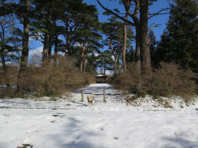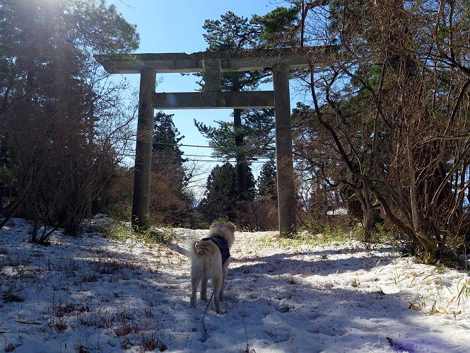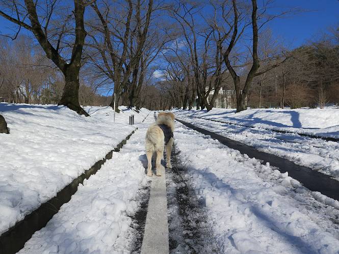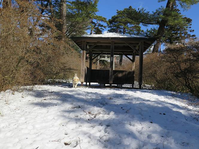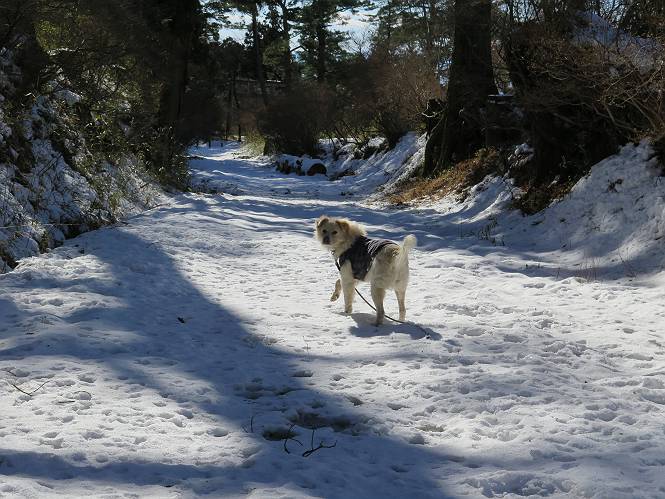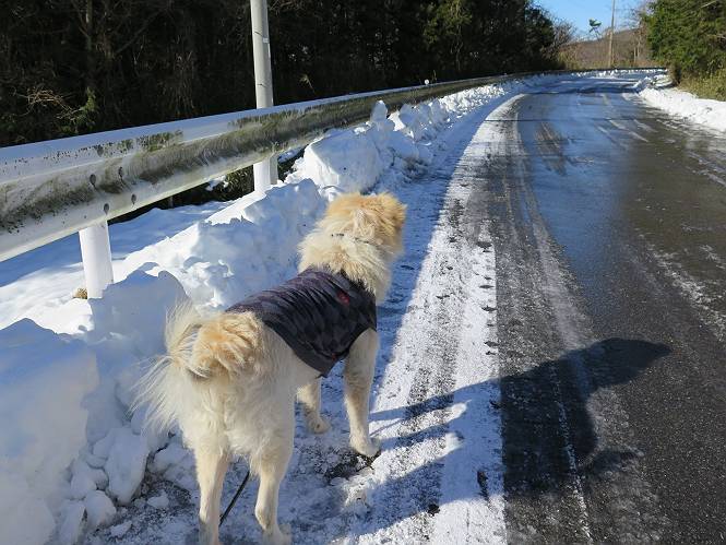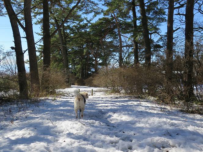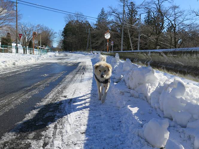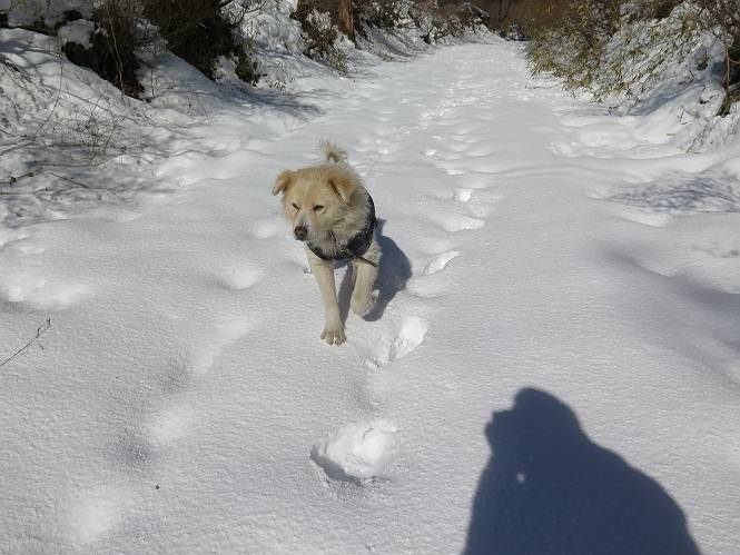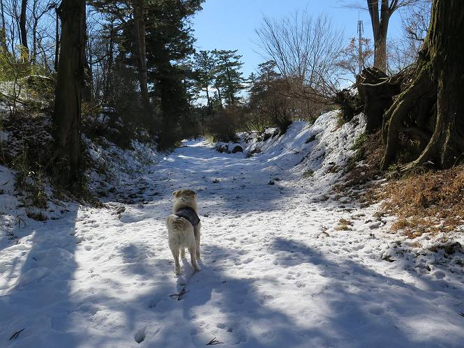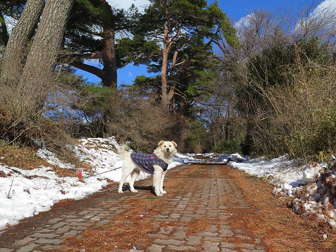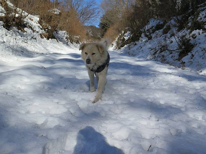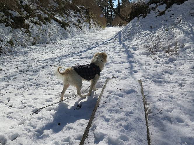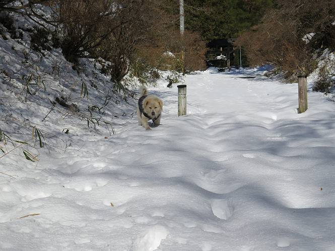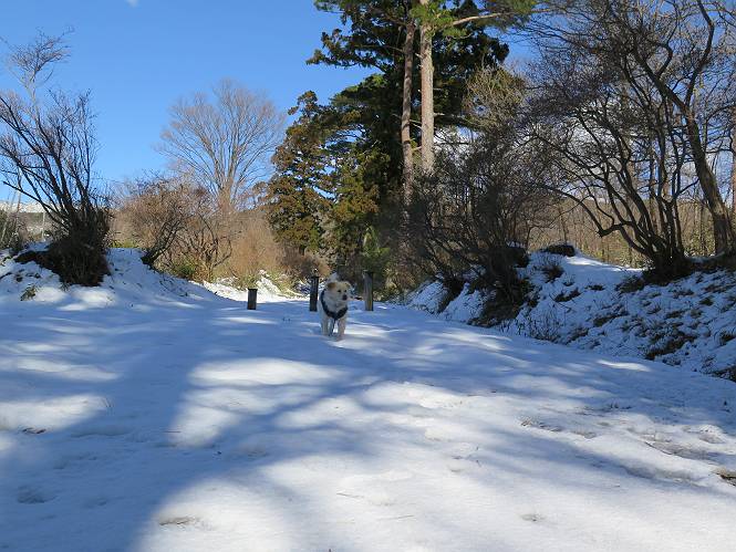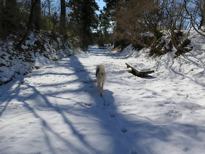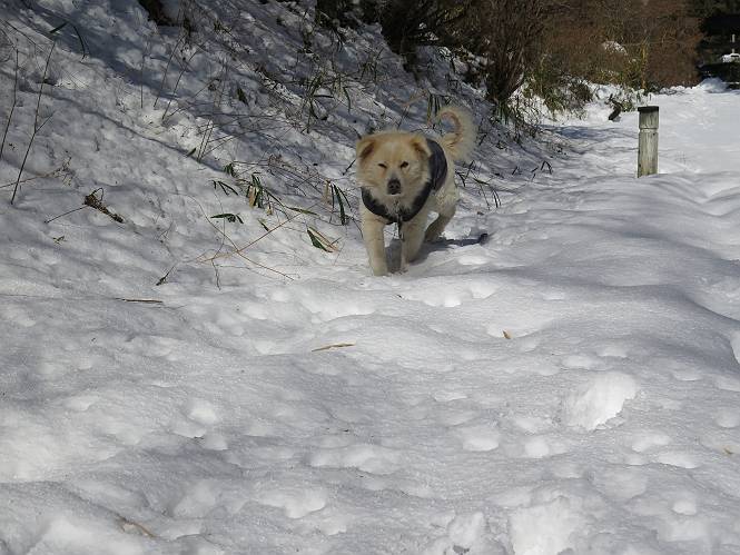 | 平成二十八年一月十九日 Before 写真集目次へ Next 昨日の雪は、ぼくん家の辺は少ししか降りませんでしたが、ちょっと車で走ると沢山降ってました。でも、みぞれが降っていて遊べなかったので、今日は赤城山の裾野まで雪遊びに連れてってもらいました。前橋市の千本桜を出発し、空っ風街道に出て西に進み、信号手前から左に入り、松並木を南下して三夜沢交差点まで、遊びながら歩いてきました。 千本桜の駐車場で準備をして、さあ、出発です。道は、緩やかな上りです。 すぐ隣にグランドがあります、ここでちょっと道草します、楽しいね。 こんな感じで桜並木がずーっと続いてます。誰も入ってないかと思ったら、タイヤの跡はあるし、道の反対側では草刈りをしていました。 ここは、グランドの奥、みやぎ千本桜の森、って所だそうです。 広々した雪の原ってところかな。 雪の感触、いいね、ぼく、こういうの大好きなんだ。 しばらく歩くと、空っ風街道が見えてきました。 ここの道は、除雪してありますよ。 歩きやすいけど、何だかつまらないなあ。 時々、中に入って遊んでいいんだってさ、良かった。 あれっ、どこの山かな。鍋割山だって、ここから見るとあんな格好に見えるんだ。 この先は坂道ですね。 もう少しで松並木に出るんだってさ。 おう、交差点だ、あの向こうがぼくとお父さんの出会った場所なんです。10年経っちゃったもんね。 交差点の手前を左に入りました。誰も踏んでないようです。 この先は松並木です。 所々に深い場所がありますね。 もう浅くなっちゃった。 ここはベンチがあります、少し休憩します。沢山踏み跡がありますね。 おお、この辺の雪はいいぞ。 どうだ、伸びして、寝転んで、・・・・・。 またきれいな雪になりました。 おやっ、この足跡はなんだ。 イノシシかも?、ってお父さんが言ってます。 あれっ、鳥居が見えたぞ。 松が大きくて、きれいな並木に出ました つつじが下に、上には大きな松があるんですね。 鳥居をくぐります。 鳥居をくぐったら石段が少しありました。 東屋があったので、また少しお休みしちゃったよ。 時々横を走る車があります、お母さんは着いているかな。 もうすぐ、三夜沢の交差点だって。 きれいな松並木だね。 下のつつじも大きいね。 あれあれ、変だぞ。 大きな松が折れているよ、強い風で折れたようです。 やれやれ、三夜沢の交差点にゴールしました。 お母さんが道の駅で買い物をすませて迎いに来てくれました。お腹がすいちゃった、オヤツ欲しいなあ。 Before 写真集目次へ Next |