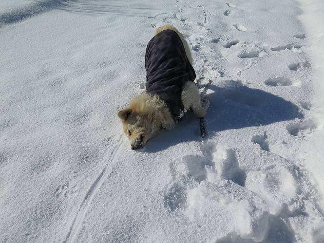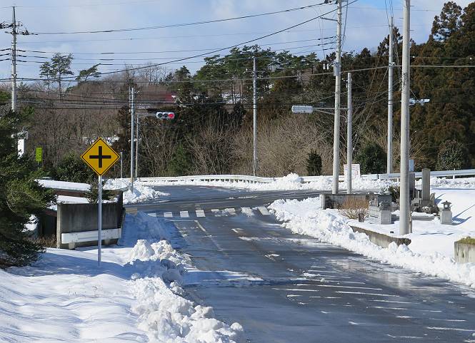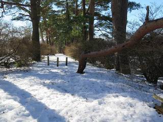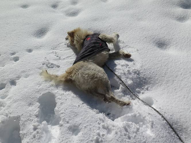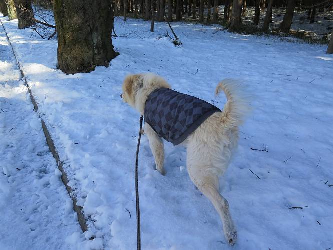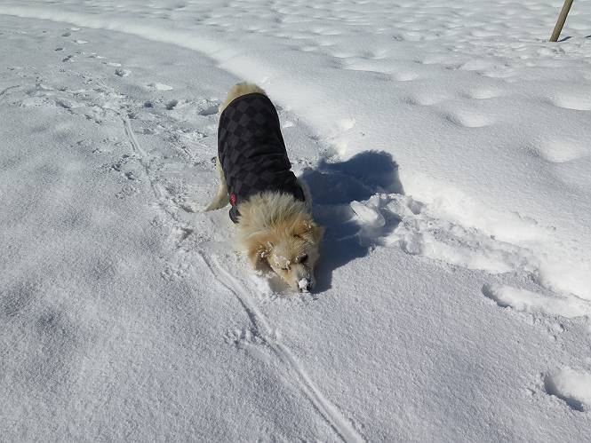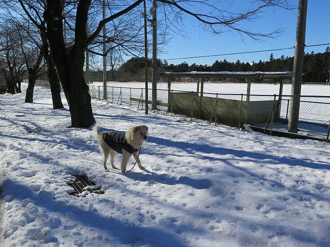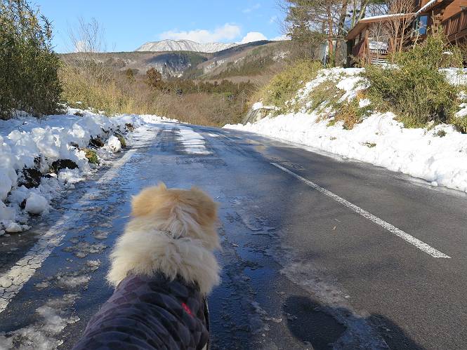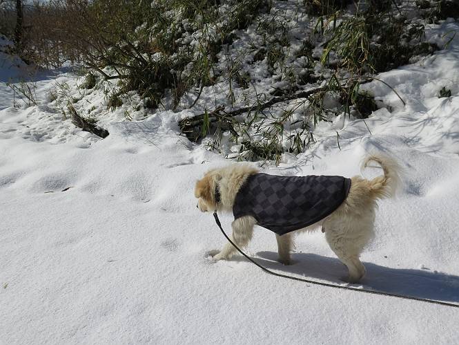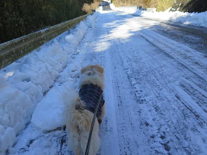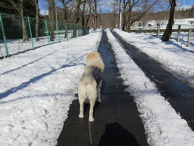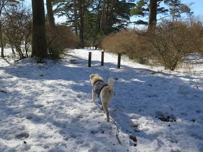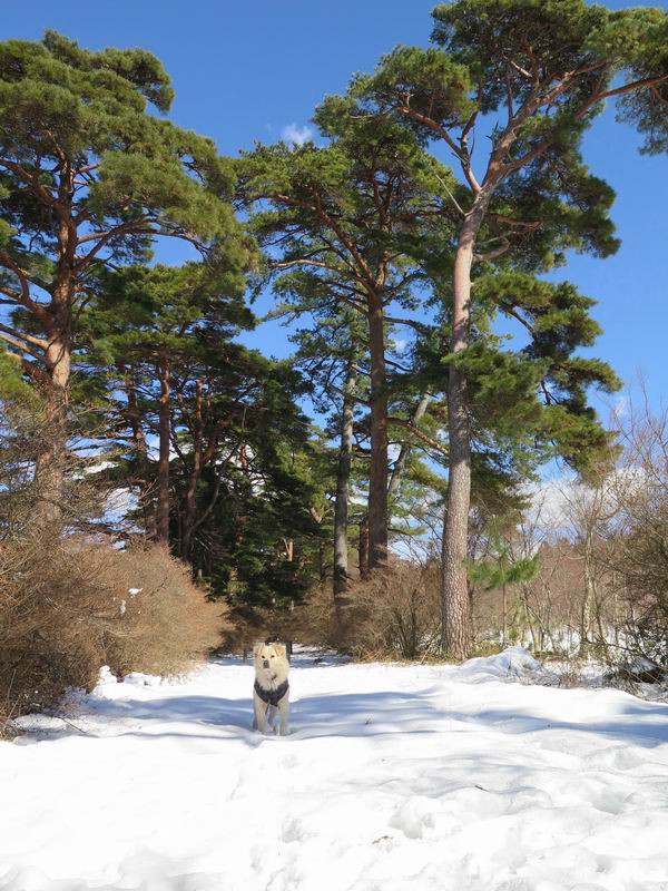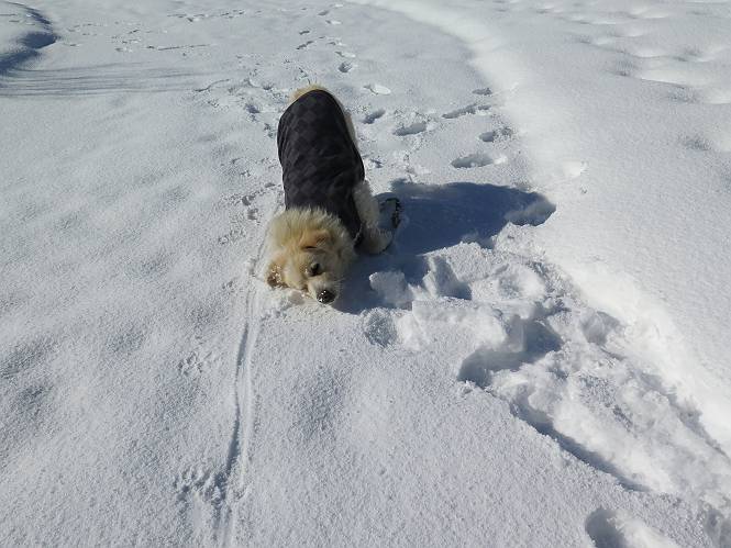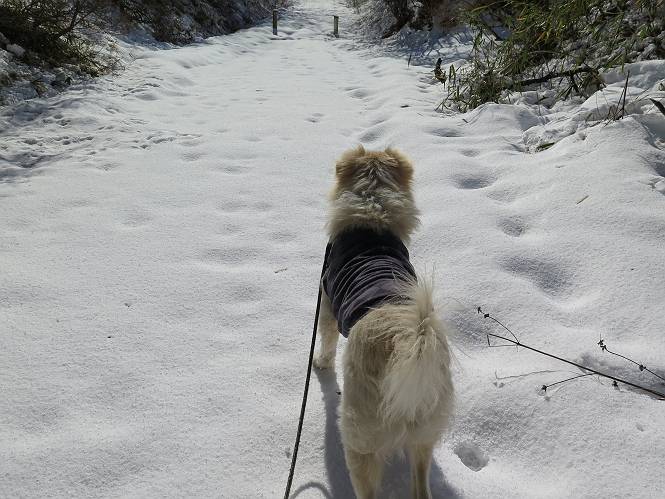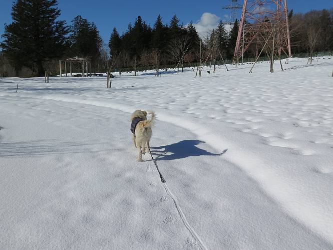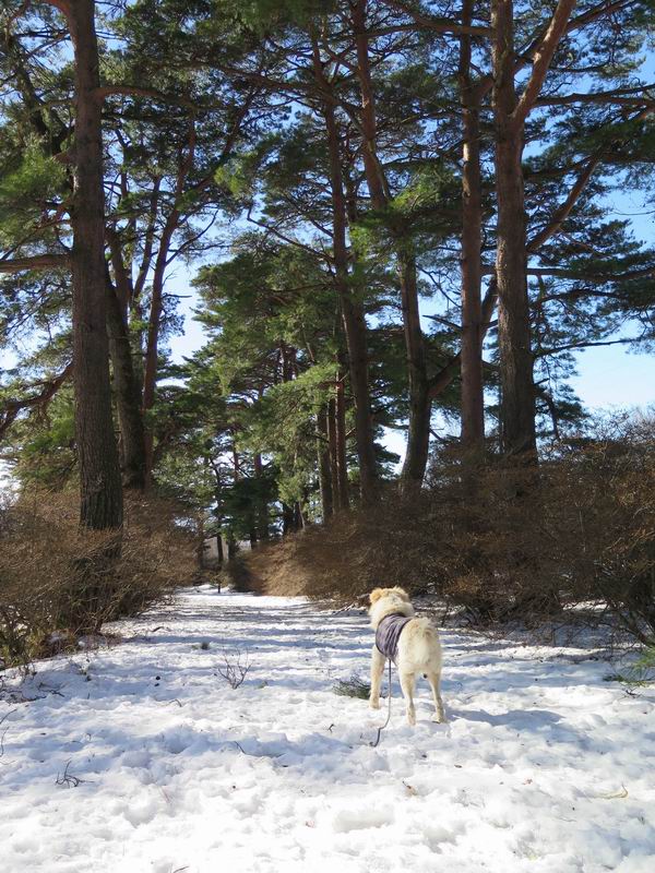 | 平成二十八年一月十九日 Before 写真集目次へ Next 昨日の雪は、ぼくん家の辺は少ししか降りませんでしたが、ちょっと車で走ると沢山降ってました。でも、みぞれが降っていて遊べなかったので、今日は赤城山の裾野まで雪遊びに連れてってもらいました。前橋市の千本桜を出発し、空っ風街道に出て西に進み、信号手前から左に入り、松並木を南下して三夜沢交差点まで、遊びながら歩いてきました。 千本桜の駐車場で準備をして、さあ、出発です。道は、緩やかな上りです。 すぐ隣にグランドがあります、ここでちょっと道草します、楽しいね。 こんな感じで桜並木がずーっと続いてます。誰も入ってないかと思ったら、タイヤの跡はあるし、道の反対側では草刈りをしていました。 ここは、グランドの奥、みやぎ千本桜の森、って所だそうです。 広々した雪の原ってところかな。 雪の感触、いいね、ぼく、こういうの大好きなんだ。 しばらく歩くと、空っ風街道が見えてきました。 ここの道は、除雪してありますよ。 歩きやすいけど、何だかつまらないなあ。 時々、中に入って遊んでいいんだってさ、良かった。 あれっ、どこの山かな。鍋割山だって、ここから見るとあんな格好に見えるんだ。 この先は坂道ですね。 もう少しで松並木に出るんだってさ。 おう、交差点だ、あの向こうがぼくとお父さんの出会った場所なんです。10年経っちゃったもんね。 交差点の手前を左に入りました。誰も踏んでないようです。 この先は松並木です。 所々に深い場所がありますね。 もう浅くなっちゃった。 ここはベンチがあります、少し休憩します。沢山踏み跡がありますね。 おお、この辺の雪はいいぞ。 どうだ、伸びして、寝転んで、・・・・・。 またきれいな雪になりました。 おやっ、この足跡はなんだ。 イノシシかも?、ってお父さんが言ってます。 あれっ、鳥居が見えたぞ。 松が大きくて、きれいな並木に出ました つつじが下に、上には大きな松があるんですね。 鳥居をくぐります。 鳥居をくぐったら石段が少しありました。 東屋があったので、また少しお休みしちゃったよ。 時々横を走る車があります、お母さんは着いているかな。 もうすぐ、三夜沢の交差点だって。 きれいな松並木だね。 下のつつじも大きいね。 あれあれ、変だぞ。 大きな松が折れているよ、強い風で折れたようです。 やれやれ、三夜沢の交差点にゴールしました。 お母さんが道の駅で買い物をすませて迎いに来てくれました。お腹がすいちゃった、オヤツ欲しいなあ。 Before 写真集目次へ Next |