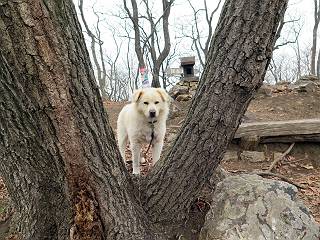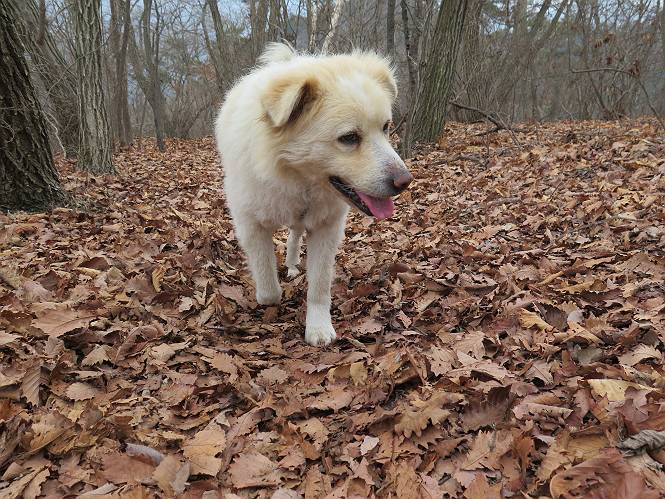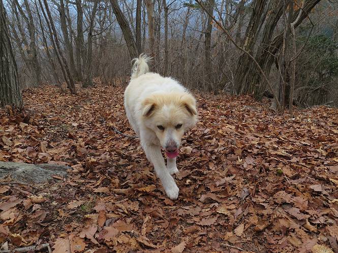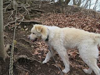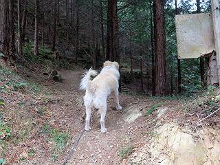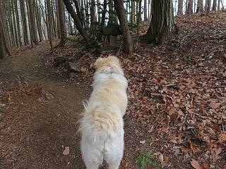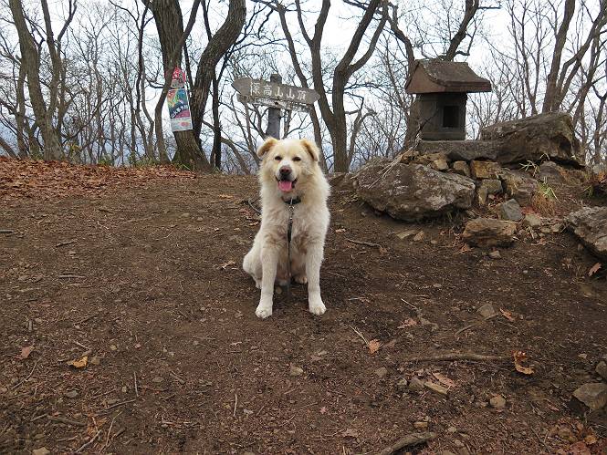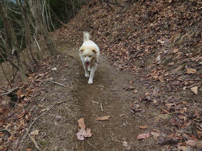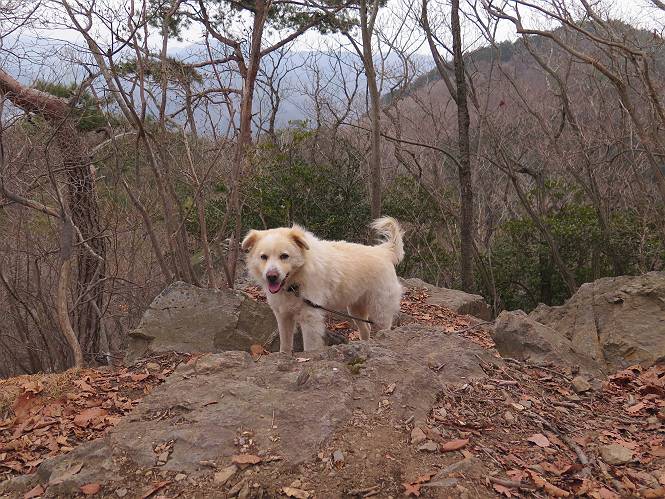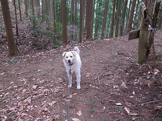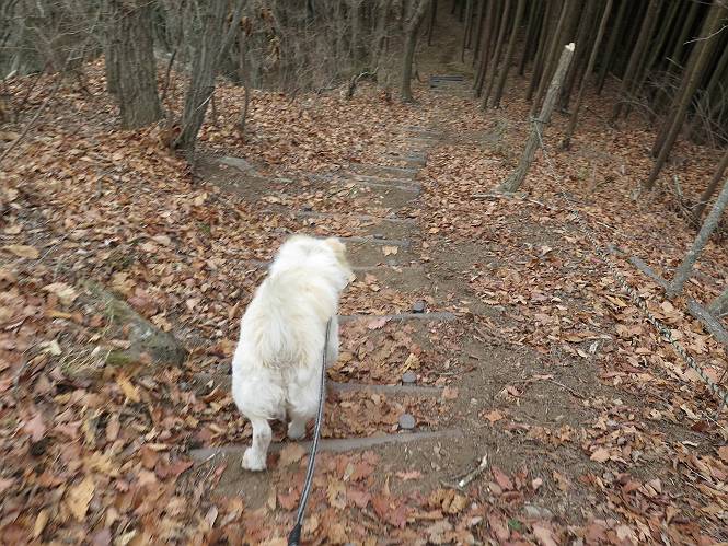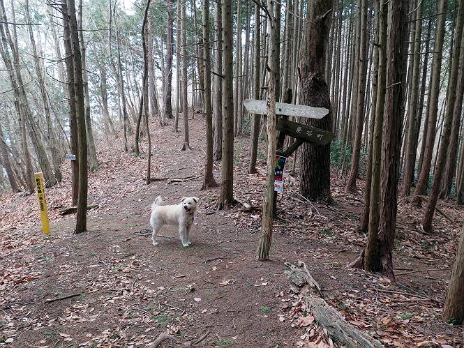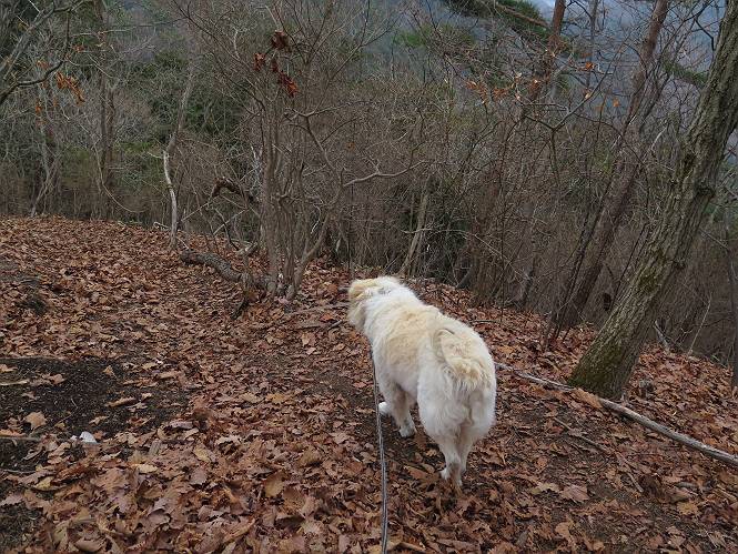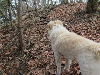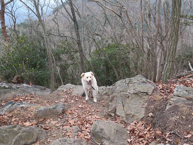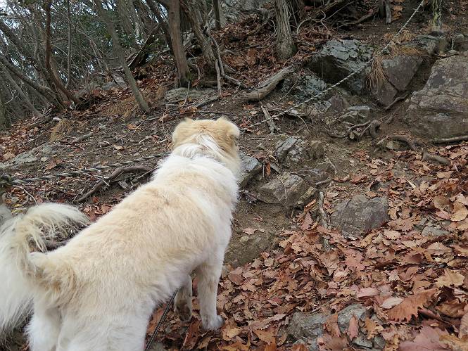 | 平成二十八年三月六日 Before 写真集目次へ Next また下痢しちゃってね、今年三度目です。まだ朝晩の薬は飲んでいますが、今日は薄日がさして、温かい日になりました。午後になって、足利の深高山へ連れてってもらいました。まだ体調が戻ってないのですが、無理しないように、簡単なコースを歩きました。 猪子トンネルから林道を車で走り、猪子峠入口から山に入りました。 すぐに猪子峠です。 猪子峠から雑木林の中を進んでます。 所々で林道のすぐ上を通ります。 もう少し先から入れたようです、でも大した距離ではありません。 粟谷町からの道と合流しました、ここは十字路になっています。 右に進むと祠の前を通って、 丸太の階段に出ます、急ですね。 岩の間をしばらく進みます、 ここも結構、急ですね。 やっと、岩場を抜けました。 緩やかに、落ち葉を踏みしめながら進みます。 いい感じの尾根道です。 今度は、岩の間を緩やかに進みます。 古い、道標が縛り付けられてました。この横の落ち葉はお腹まで入っちゃいました。 山頂直下の急登です。ロープをくぐって、リードが引っかかってしまいました。 深高山山頂到着です。 もう一枚山頂で。 あれ、なーに? 3/27にトレランがあるんだってさ。 帰りはラクチン、 スイスイスイ、ってところかな。 でも、家に帰るまでは良かったのですが、気持ちが悪くなっちゃってね、食事も少し食べただけです。「無理しちゃったんじゃない」、ってお母さんに言われました。心配かけました、寝て起きれば、治っていると思うよ。 Before 写真集目次へ Next |