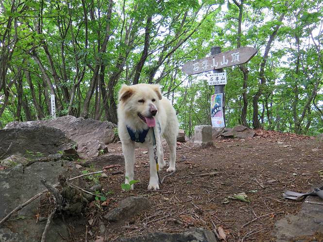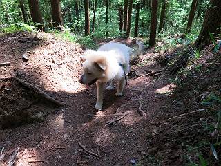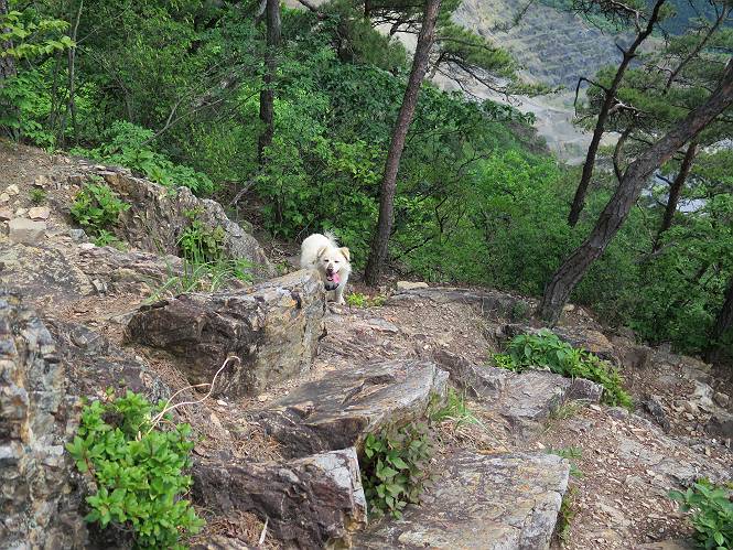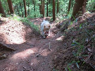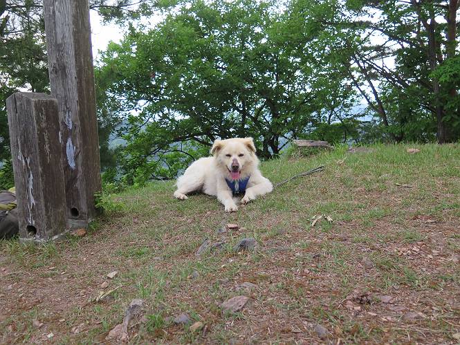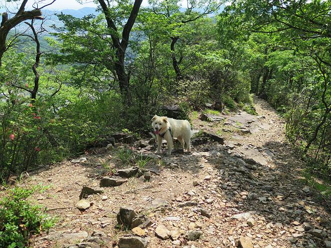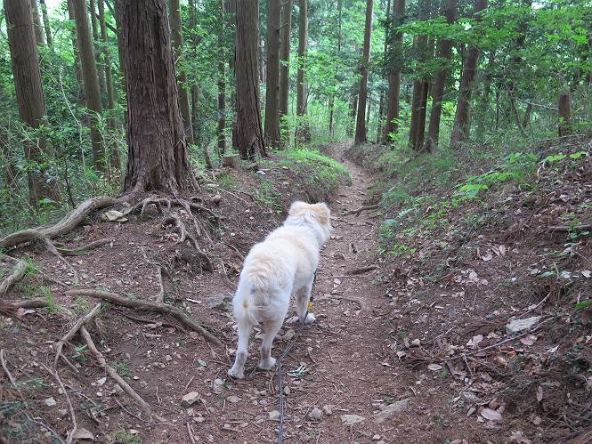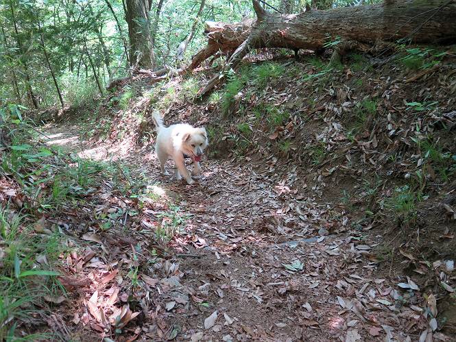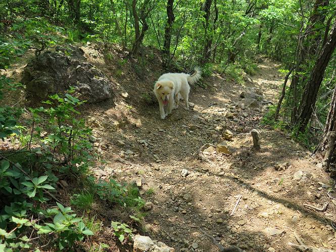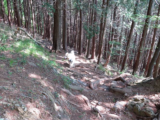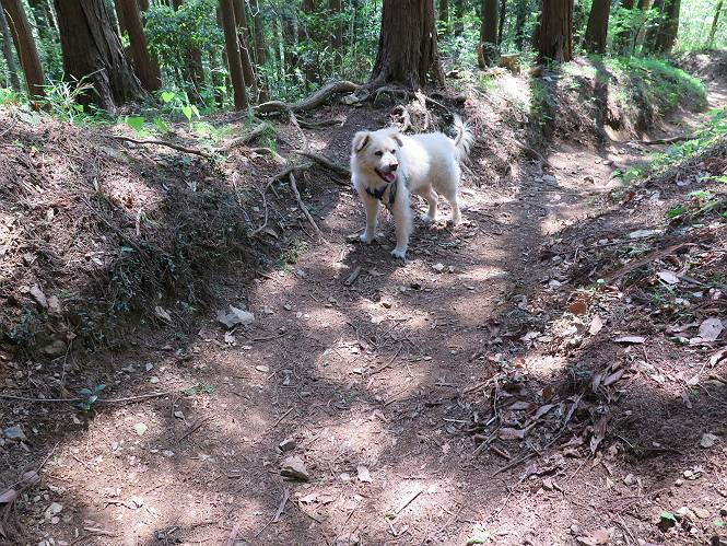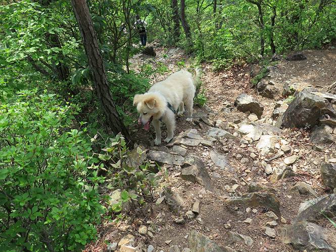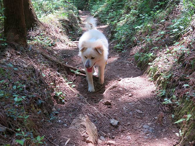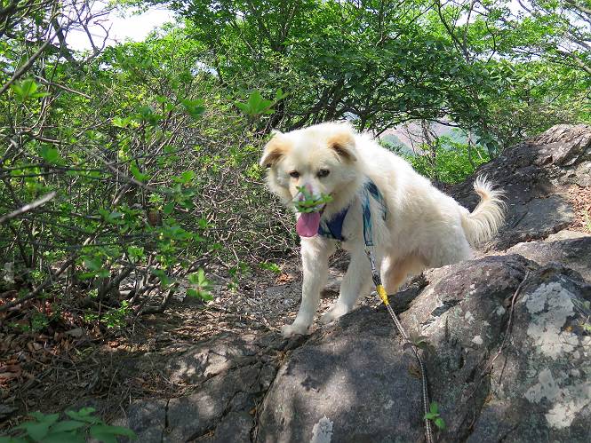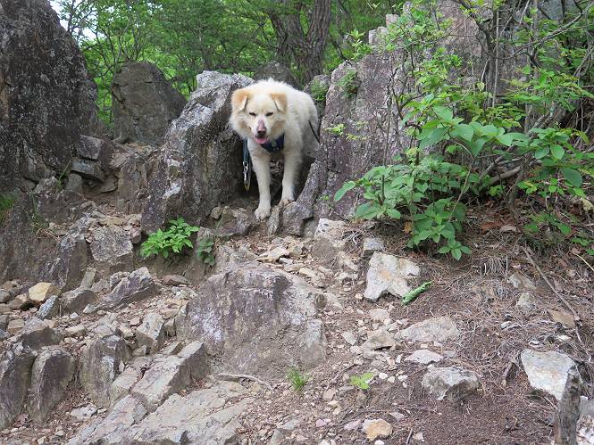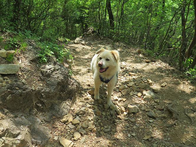 | 平成二十八年五月七日 Before 写真集目次へ Next 袈裟丸山の後の下痢がすっかりおさまって、今日は、お天気が良いので、午後から足利の石尊山に連れてってもらいました。約1年8ケ月ぶりです。 足利市小俣町の叶花不動尊からの出発です。杉林の中の緩い坂道を 遊びながら、少し進みます。 だんだん急坂になります。 でも、遊びながらですから、静かでいい感じの森です。 結構キツイ坂道です。ジグザグに上がって行きます。 杉から桧に変わりました。 雑木林に入って、丸太の階段に変わり、 抜けると、明るい尾根に出ます。日影でちょっとだけお休みしました。 ここから岩尾根に入っていきますが、はじめは小石のゴロゴロした道です。 岩だらけの急坂になります。 良い道を選んで、ゆっくり歩きました。 段差のある大きな岩もあり大変でした。 枝の間からすぐ下にソーラーパネルが沢山見えます。 ここまでくるとヤマツツジの花がまだ残っています。 ヨイショ、大きな段差を乗り越えると、釈迦岩展望台に出ました。 連続する岩場に疲れちゃいました。 ここが一番急な所で、段差が大きいんですよ、上がれるかな。 上がれました、姥穴山の向こうに桐生の街が見えます。 もう少しだって、ガンバロー。 石尊神社奥ノ宮裏手の見晴台に着きました。 少しオヤツをもらって、お水を飲んだところです。 山頂は見晴台のちょっと先なんですよ、 お休み所から少し下ります。 木陰の中をゆるかに下ります。 雑木林の中なので景色は見えません。 少し上りにかかります。 ちょっと先って長いね、なかなか着かないなあ。 おお、山頂が見えたぞ。 石尊山山頂へ到着です。 木立の中ですが、ぼくは暑いなあ。 お水と、オヤツを頂きました、お水は500ccが空っぽになっちゃったんだって。 腹ばいで休んでますが、ダニがつくんだよね。あとで、お父さんにとってもらおう。 帰りは、来た道を戻ります。 展望台でまたお休みしてます。 「忠治、もう、下るぞ」、「やだよ、まだ、休んでないよ」 「忠治、先に行っちゃうぞ」、「・・・・・」 「あれっ、大変だ」 まだ、ゆっくりしたいのに、なあ。 桧林を下って、 女人禁制の碑まで戻りました、あと少しです。 久しぶりに石尊山を歩きました。お父さんが、足は心配ないが、脚力が落ちたなあ、って言ってました。 【モグラの赤ちゃんと・・・】 今朝、お父さんがモグラの子を四匹連れてきて、ぼくをかまうんですよ。 「ウーウー、怒ってやったら、ミの中に入れて傍に置いて、これでどうだ?」 今度は一匹だけ取り出して、ぼくの鼻先に置くんですよ。 鼻でつっこくると腹を返してしまいました。 面白いヤツだなあ、今度は口にくわえて遊ぼうとしたら、お父さんにとられてしまいました。そして、どこかへ持っていってしまいました。 Before 写真集目次へ Next |