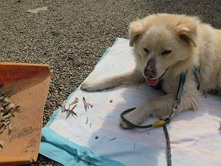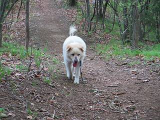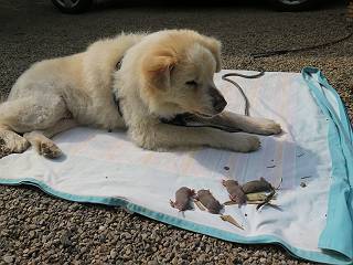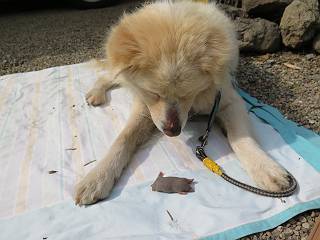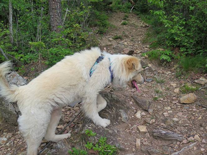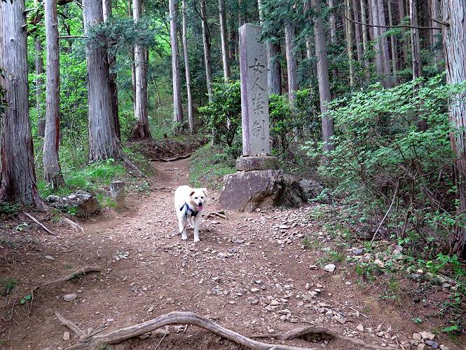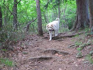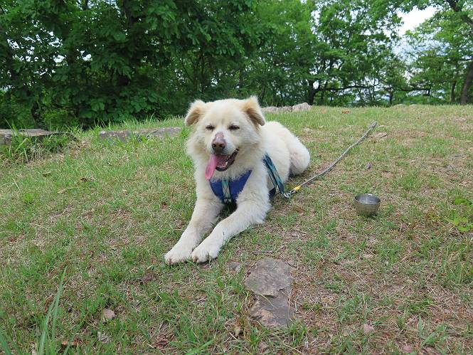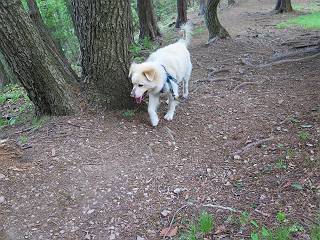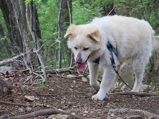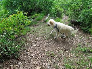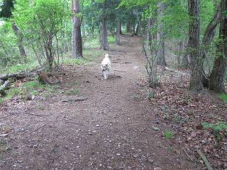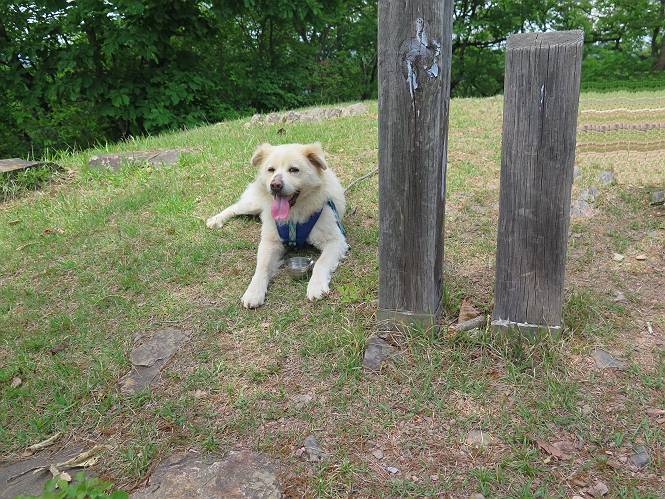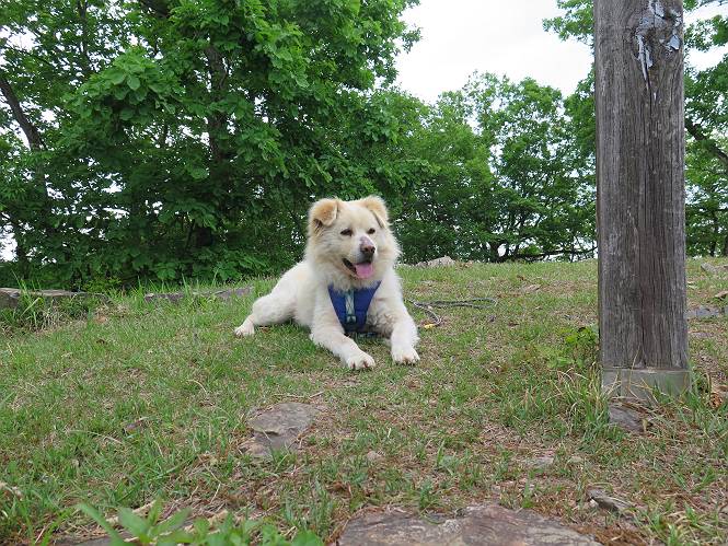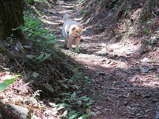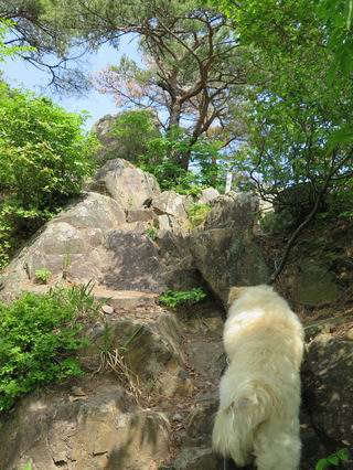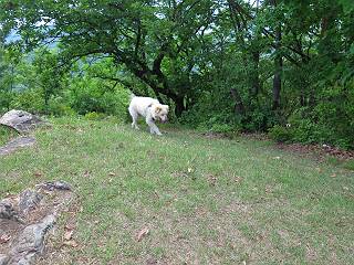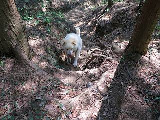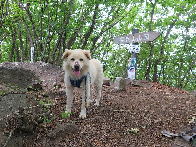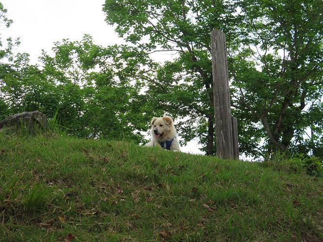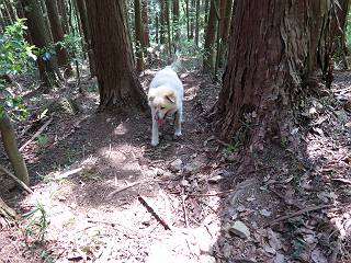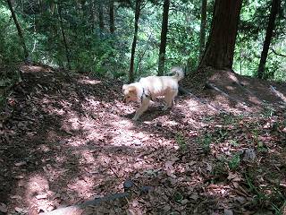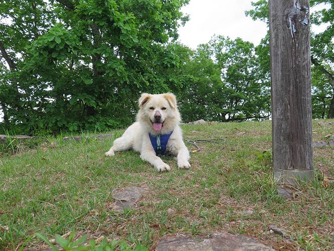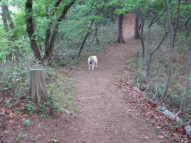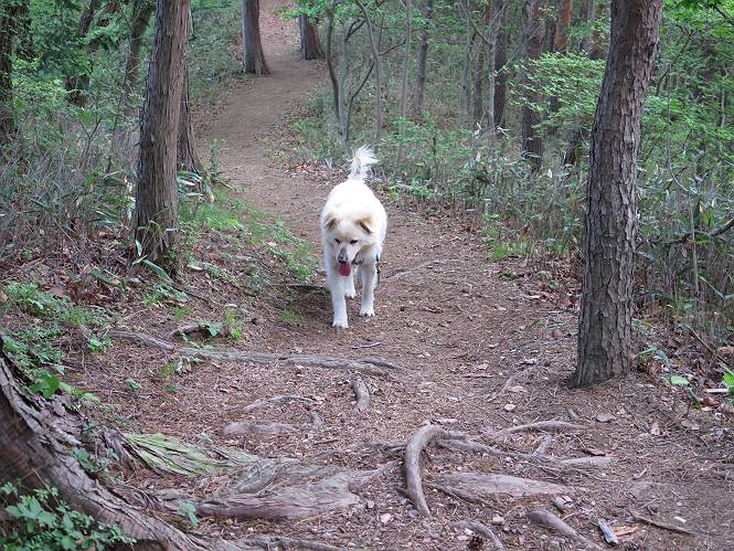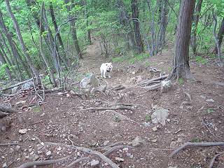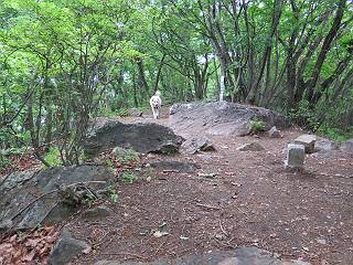 | 平成二十八年五月七日 Before 写真集目次へ Next 袈裟丸山の後の下痢がすっかりおさまって、今日は、お天気が良いので、午後から足利の石尊山に連れてってもらいました。約1年8ケ月ぶりです。 足利市小俣町の叶花不動尊からの出発です。杉林の中の緩い坂道を 遊びながら、少し進みます。 だんだん急坂になります。 でも、遊びながらですから、静かでいい感じの森です。 結構キツイ坂道です。ジグザグに上がって行きます。 杉から桧に変わりました。 雑木林に入って、丸太の階段に変わり、 抜けると、明るい尾根に出ます。日影でちょっとだけお休みしました。 ここから岩尾根に入っていきますが、はじめは小石のゴロゴロした道です。 岩だらけの急坂になります。 良い道を選んで、ゆっくり歩きました。 段差のある大きな岩もあり大変でした。 枝の間からすぐ下にソーラーパネルが沢山見えます。 ここまでくるとヤマツツジの花がまだ残っています。 ヨイショ、大きな段差を乗り越えると、釈迦岩展望台に出ました。 連続する岩場に疲れちゃいました。 ここが一番急な所で、段差が大きいんですよ、上がれるかな。 上がれました、姥穴山の向こうに桐生の街が見えます。 もう少しだって、ガンバロー。 石尊神社奥ノ宮裏手の見晴台に着きました。 少しオヤツをもらって、お水を飲んだところです。 山頂は見晴台のちょっと先なんですよ、 お休み所から少し下ります。 木陰の中をゆるかに下ります。 雑木林の中なので景色は見えません。 少し上りにかかります。 ちょっと先って長いね、なかなか着かないなあ。 おお、山頂が見えたぞ。 石尊山山頂へ到着です。 木立の中ですが、ぼくは暑いなあ。 お水と、オヤツを頂きました、お水は500ccが空っぽになっちゃったんだって。 腹ばいで休んでますが、ダニがつくんだよね。あとで、お父さんにとってもらおう。 帰りは、来た道を戻ります。 展望台でまたお休みしてます。 「忠治、もう、下るぞ」、「やだよ、まだ、休んでないよ」 「忠治、先に行っちゃうぞ」、「・・・・・」 「あれっ、大変だ」 まだ、ゆっくりしたいのに、なあ。 桧林を下って、 女人禁制の碑まで戻りました、あと少しです。 久しぶりに石尊山を歩きました。お父さんが、足は心配ないが、脚力が落ちたなあ、って言ってました。 【モグラの赤ちゃんと・・・】 今朝、お父さんがモグラの子を四匹連れてきて、ぼくをかまうんですよ。 「ウーウー、怒ってやったら、ミの中に入れて傍に置いて、これでどうだ?」 今度は一匹だけ取り出して、ぼくの鼻先に置くんですよ。 鼻でつっこくると腹を返してしまいました。 面白いヤツだなあ、今度は口にくわえて遊ぼうとしたら、お父さんにとられてしまいました。そして、どこかへ持っていってしまいました。 Before 写真集目次へ Next |