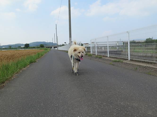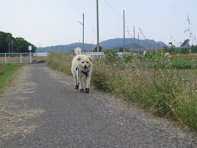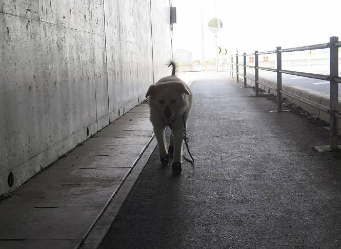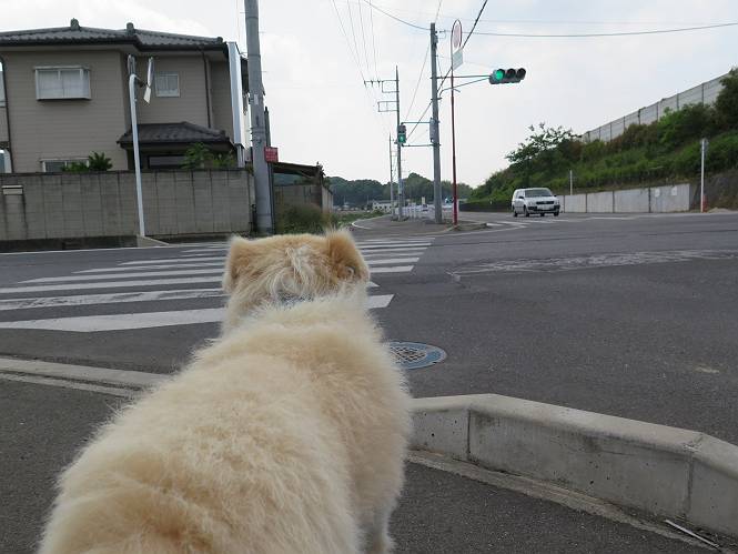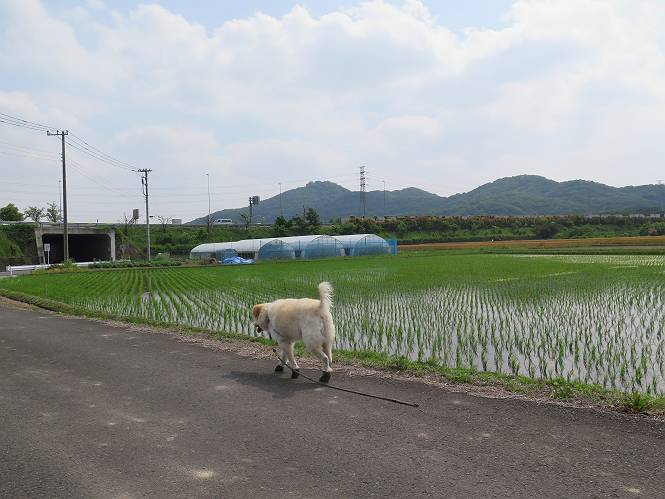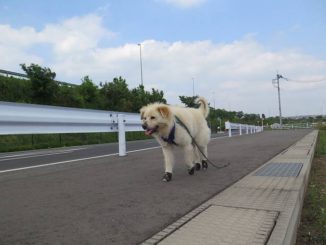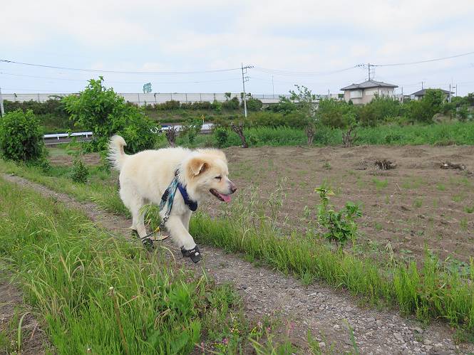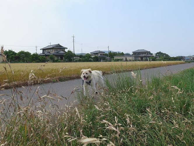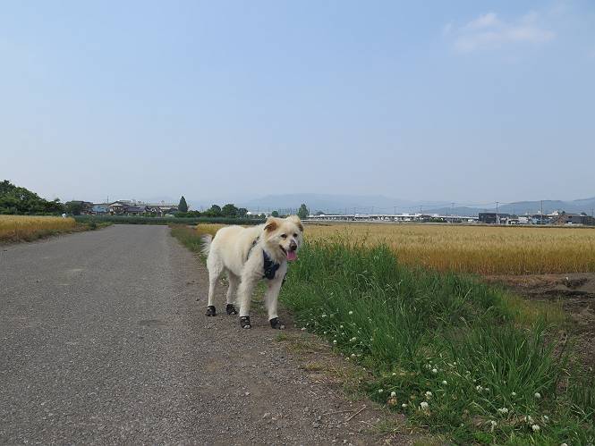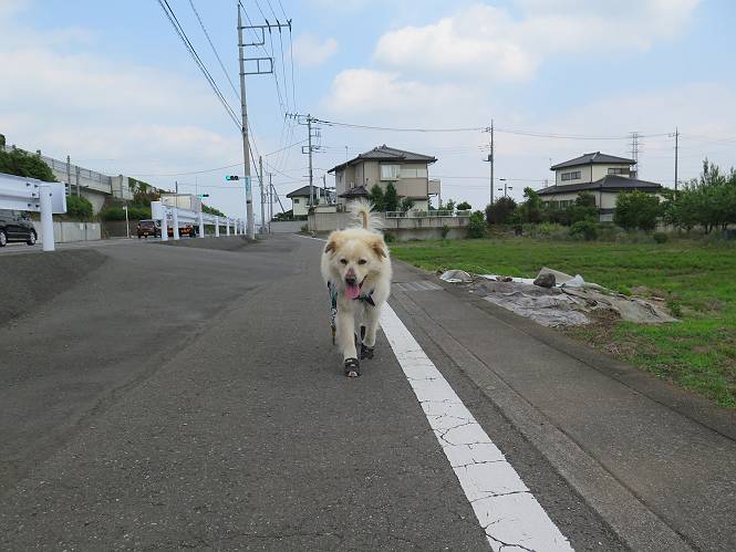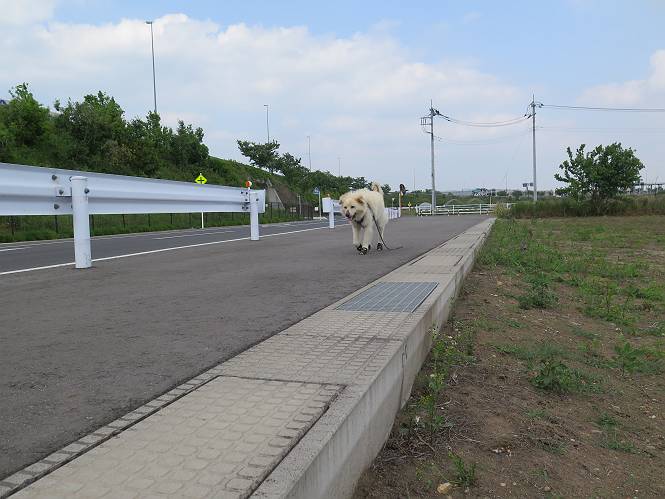 | 平成二十八年五月二十六日 Before 写真集目次へ Next お父さんが花の写真を撮っているのを見てます。まだ陽が弱くて涼しいのですが、日中は暑くなるそうです。後ろに咲いているピンクの花はキョウカノコという花で、小さい花がいっぱい集まっています。 ぼく、飽きちゃって、芝生で寝転んでいると、後ろでウツボグサを撮っていたのですね。 今日は、日中の散歩となりました。カンカン照りで温度の上がった舗装道路は苦手です、久しぶりに靴を履き夏の準備だそうです。お父さんの身支度ですが、首に携帯電話とタオル、腰にぼくの散歩グッズ、予備のリード、カメラ、水500ccをつけてます。この辺は、いつも歩く散歩コースで刈り取り前の麦畑の多い所です。 靴は、最初は、ちょっと変な感じがしましたが、直に慣れて、走ったりもしました。 片側、用水に沿ってしばらく進みます。 ボチボチ田植えも始まっていて、沢山水が流れています。 ここの田圃は田植えが終わってますね、麦を作らなかったのでしょう。 向こうに見える山は金山です、もう真っ青ですね。 右にカーブして、 高速道路の下を抜けます。 風が抜けて涼しいです、一休みしましょう。 右に曲がって、ヤグルマソウ畑の横を歩いてます。 高速道路と並行した道です。 偶然でしょうか、走ってる車も歩いている人もありません。 もう少し先で、交差点に出ます。 赤です、止まってます。 青になりました、リードを緩めて、GO!です。 西方向に向かって進んでます、 この道は高速道路をくぐって北に進みますが、 ぼくは、ちょっと手前で、田圃道に入りましたが、靴底が滑って、こけました。 用水を渡って、細い道に出ました、 ここは時々車が通るんですよ。 また、小橋を渡って田圃の間の細い道を歩いてます、ここは車が通れません。ぐるっと大きく回り込んで、先ほどの一つ南の信号を渡って、 先ほどくぐった高速道路に出て一周しました、水をもらって、お休み中です、ここは風が抜けるので涼しいですよ。 あとは、家まで来た道を戻ります。 今日は、夏の暑さに備えて、一回りしてきました、ぼくは、大丈夫だってさ。お父さんの方が先にクタバッチャウそうです。 Before 写真集目次へ Next |