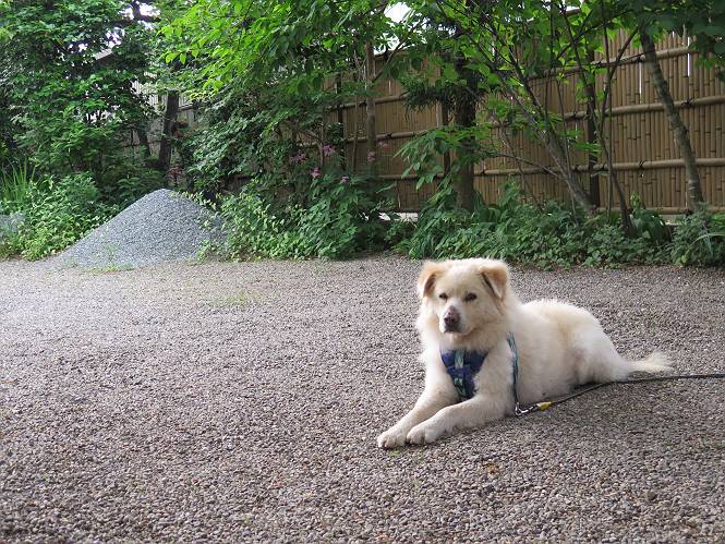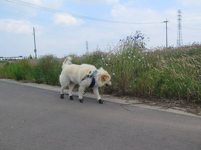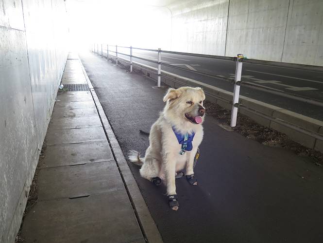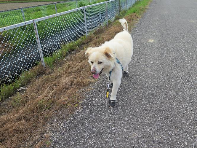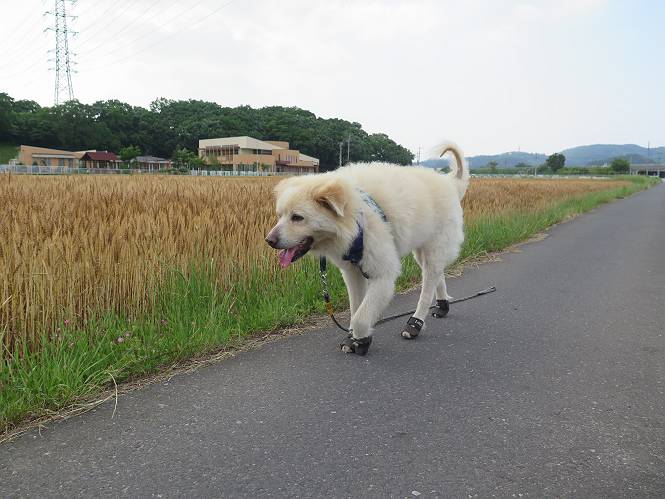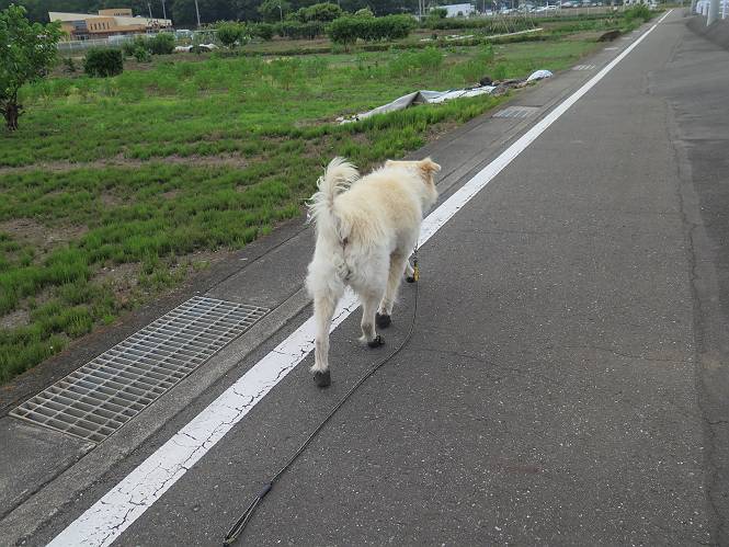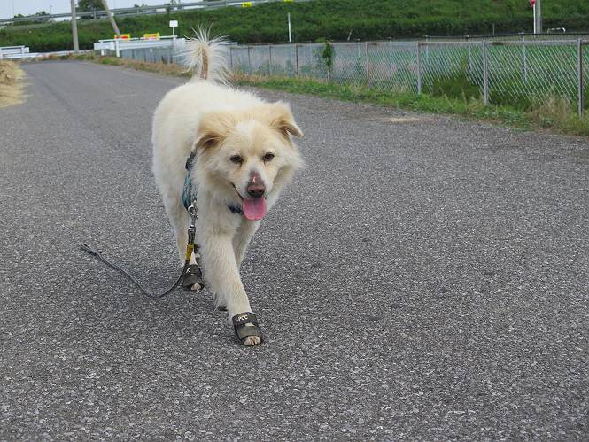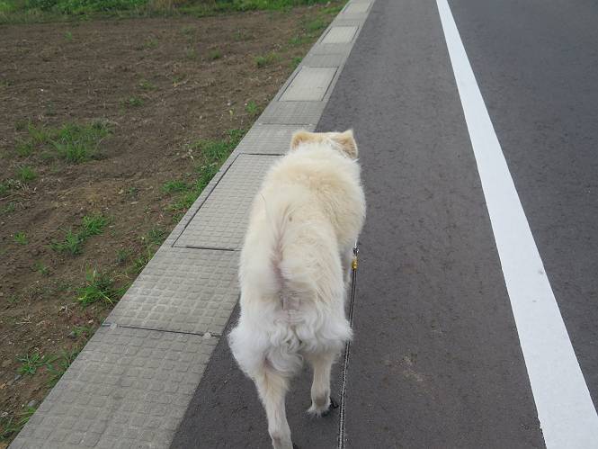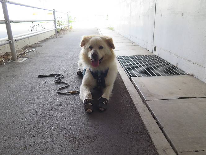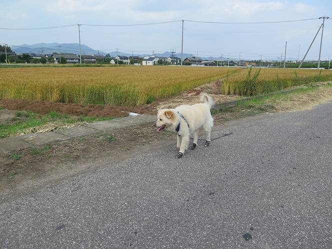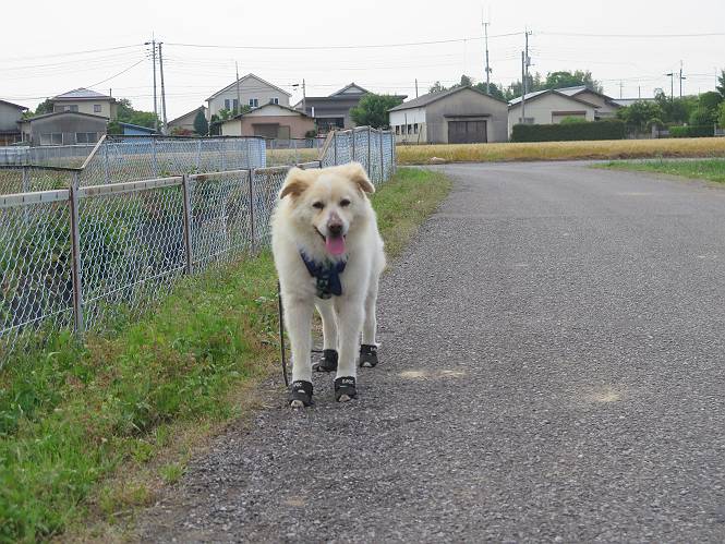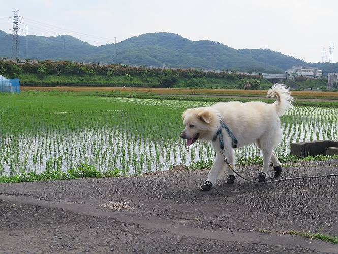 | 平成二十八年五月二十六日 Before 写真集目次へ Next お父さんが花の写真を撮っているのを見てます。まだ陽が弱くて涼しいのですが、日中は暑くなるそうです。後ろに咲いているピンクの花はキョウカノコという花で、小さい花がいっぱい集まっています。 ぼく、飽きちゃって、芝生で寝転んでいると、後ろでウツボグサを撮っていたのですね。 今日は、日中の散歩となりました。カンカン照りで温度の上がった舗装道路は苦手です、久しぶりに靴を履き夏の準備だそうです。お父さんの身支度ですが、首に携帯電話とタオル、腰にぼくの散歩グッズ、予備のリード、カメラ、水500ccをつけてます。この辺は、いつも歩く散歩コースで刈り取り前の麦畑の多い所です。 靴は、最初は、ちょっと変な感じがしましたが、直に慣れて、走ったりもしました。 片側、用水に沿ってしばらく進みます。 ボチボチ田植えも始まっていて、沢山水が流れています。 ここの田圃は田植えが終わってますね、麦を作らなかったのでしょう。 向こうに見える山は金山です、もう真っ青ですね。 右にカーブして、 高速道路の下を抜けます。 風が抜けて涼しいです、一休みしましょう。 右に曲がって、ヤグルマソウ畑の横を歩いてます。 高速道路と並行した道です。 偶然でしょうか、走ってる車も歩いている人もありません。 もう少し先で、交差点に出ます。 赤です、止まってます。 青になりました、リードを緩めて、GO!です。 西方向に向かって進んでます、 この道は高速道路をくぐって北に進みますが、 ぼくは、ちょっと手前で、田圃道に入りましたが、靴底が滑って、こけました。 用水を渡って、細い道に出ました、 ここは時々車が通るんですよ。 また、小橋を渡って田圃の間の細い道を歩いてます、ここは車が通れません。ぐるっと大きく回り込んで、先ほどの一つ南の信号を渡って、 先ほどくぐった高速道路に出て一周しました、水をもらって、お休み中です、ここは風が抜けるので涼しいですよ。 あとは、家まで来た道を戻ります。 今日は、夏の暑さに備えて、一回りしてきました、ぼくは、大丈夫だってさ。お父さんの方が先にクタバッチャウそうです。 Before 写真集目次へ Next |
