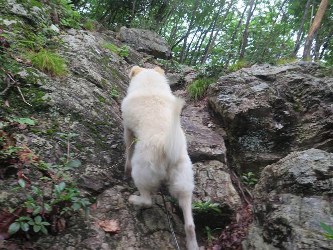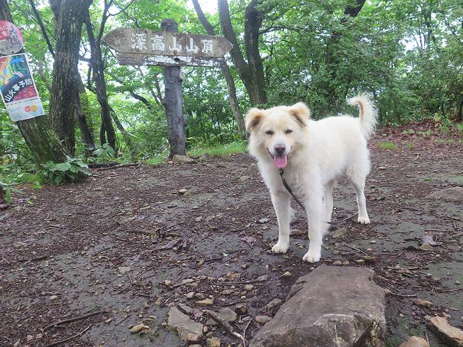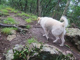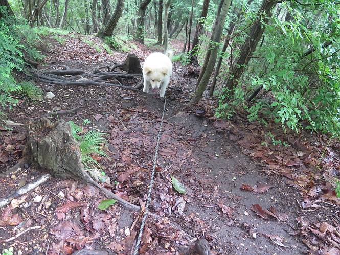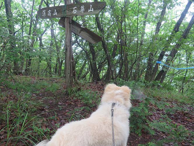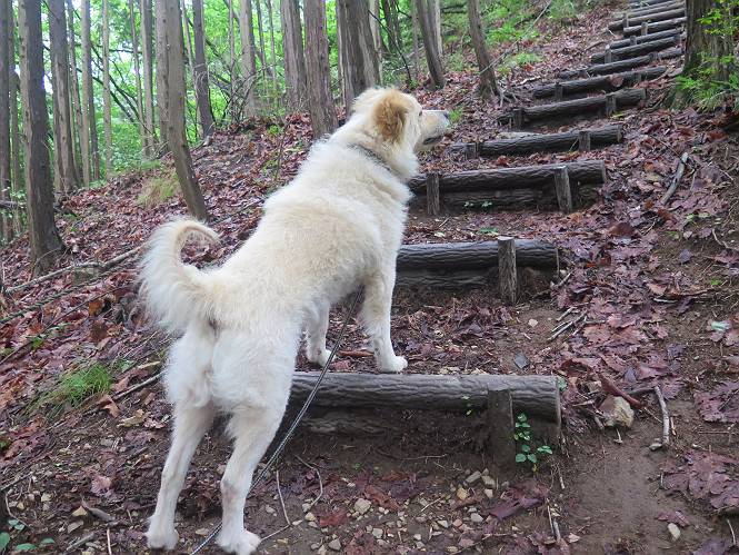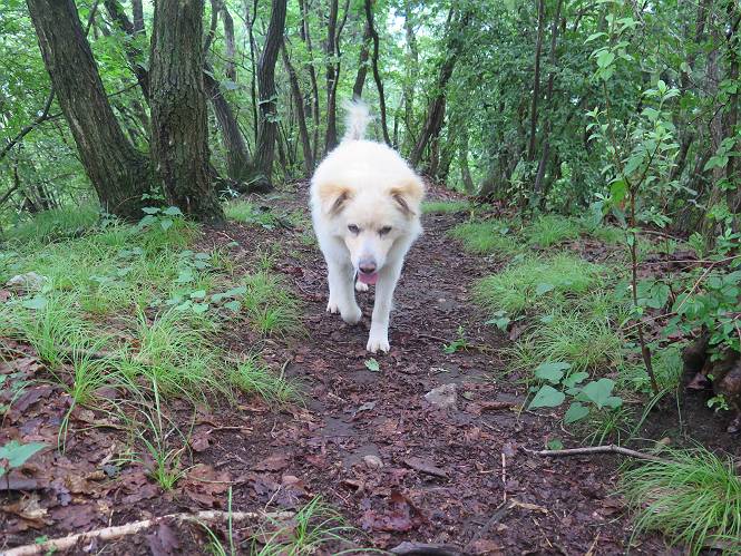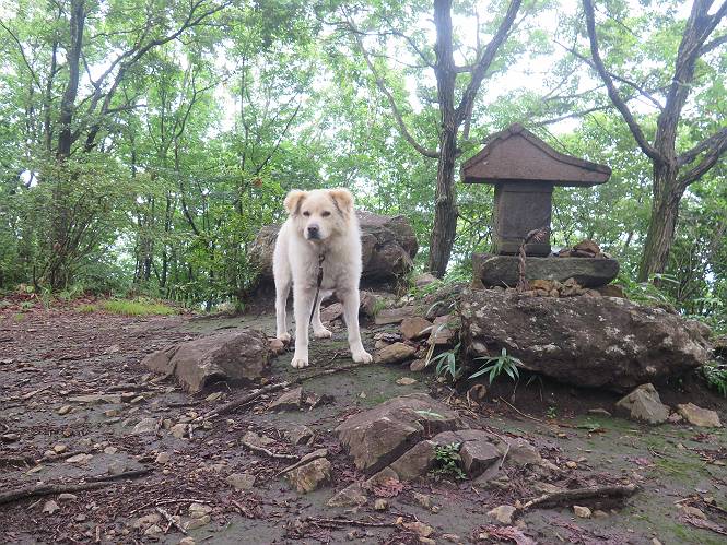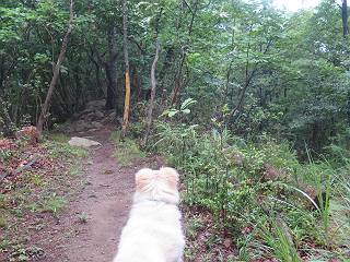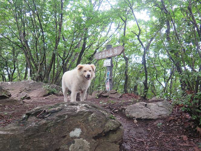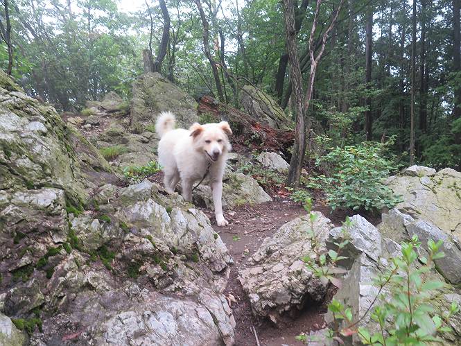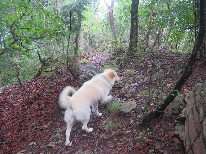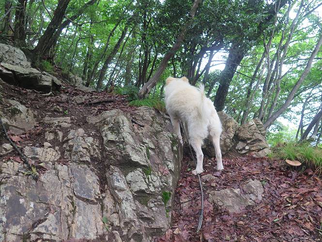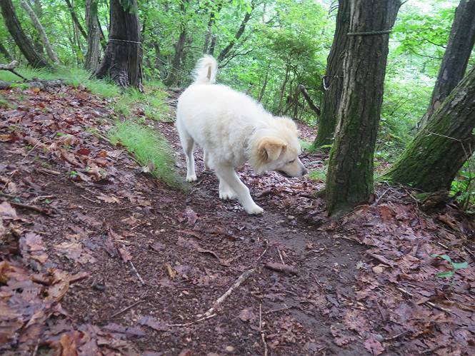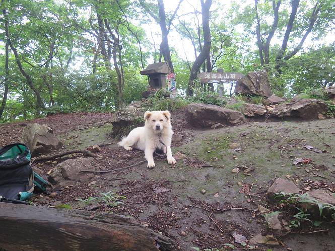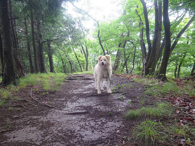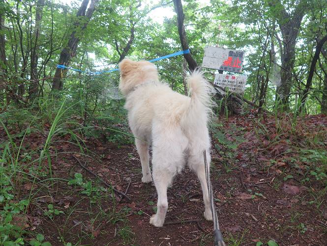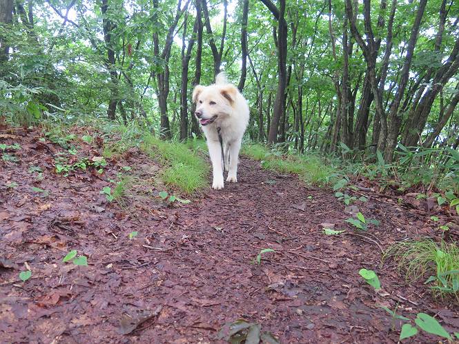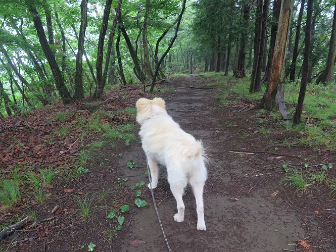 | 平成二十八年七月二十三日 Before 写真集目次へ Next 今日は足利の良く行く山、深高山と石尊山へ行ってきました。天気は曇りで涼しかったですよ。時々霧なんかかかって、ちょっと怖かったですよ。いつもトンネルの傍の駐車場から歩くのですが、登山道に覆いかぶさるような場所をさけて、林道を大分走ってから歩き出しました。駐車した場所から、僕の足で4,5歩で登山道に入りました。 すると、鉄塔の傍を通って、すぐに粟谷町からの道に合流しました。 また少し歩くと、祠があって、 桧林を少し進むと、 丸太の階段に出ました。 ぼくは歩きやすい階段の脇を歩きました。 次は、岩場に出ました。 距離は短いのですが、濡れていて滑るんですよ。 しばらく岩の間を進みますが、緩やかな上りです。 キノコが点々と生えてました、左は15cm、右が10cm以上あるかな、って言ってましたよ。 ここから、また、急坂です。濡れていて滑ります、 ロープをくぐったり、 越えたり、 おお、キツイ・・・。 急坂が終わりました。 山頂はすぐそこです。 見えた! 深高山の山頂に着きました。 オヤツとお水を頂きました。 山頂は、木が茂っていて何も見えません、そろそろ出発です。 踏みしめられた落ち葉の上を歩いて行きますと、 皮のむかれた木が点々とありました、花は咲いてましたが・・・、鹿くんのようです。 緑のトンネルの中を、ちょっと 上がったり下ったりします。 湯殿山に通じる道ですが、 閉鎖されたままになってます。 もう少しで、石尊山に着きます。 石尊山に着きました、またオヤツとお水を頂いて、ゆっくりしたいところですが、 ダニに襲われます、記念写真を撮ってもらって、 すぐ、戻るんですって。 来た道を戻ってますが、誰にも会わないですね。 深高山に戻りました、ちょっとお休みして下ります。 ゆっくり、ゆっくり、って言ってますが、下りはラクチンです。 粟谷町の分岐点を過ぎると、 すぐに到着でした。 天気も良くなかったので、誰にも会いませんでした。時間も早かったしね。 Before 写真集目次へ Next |