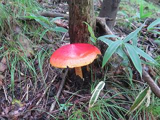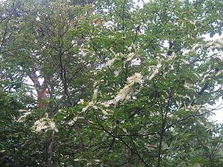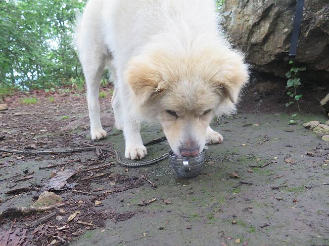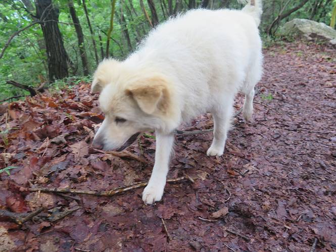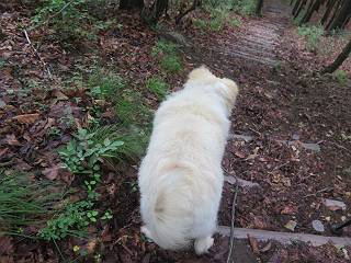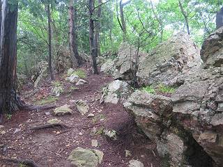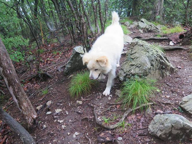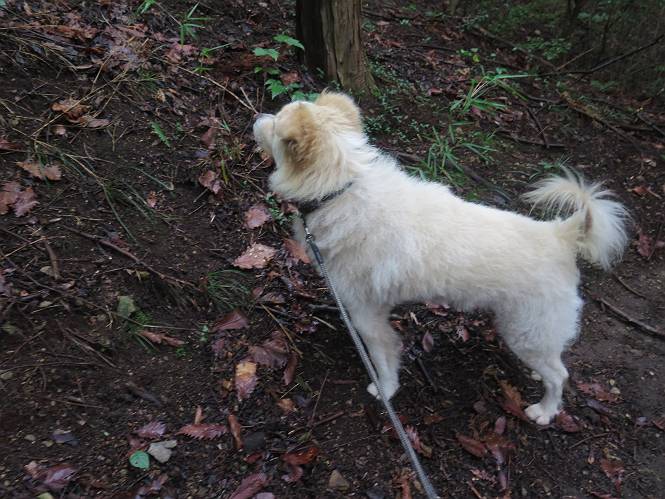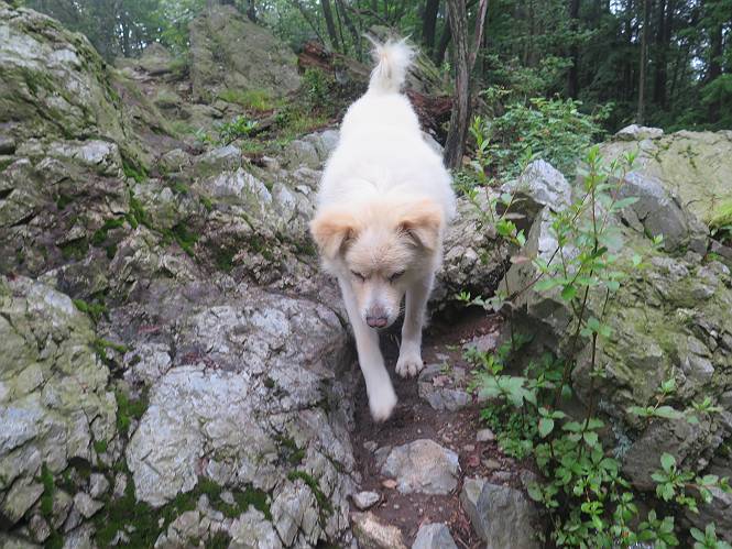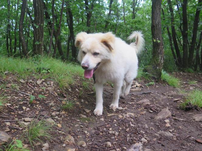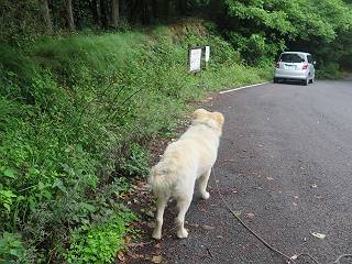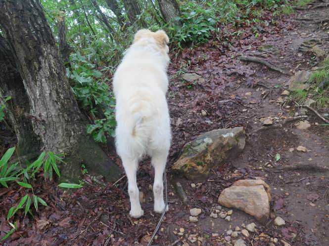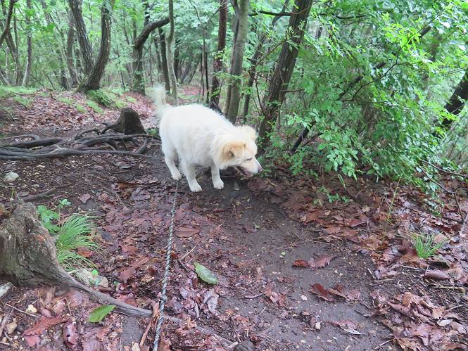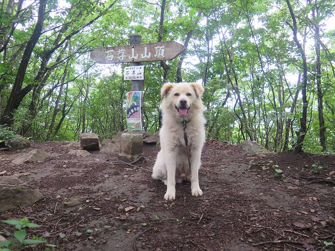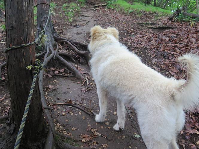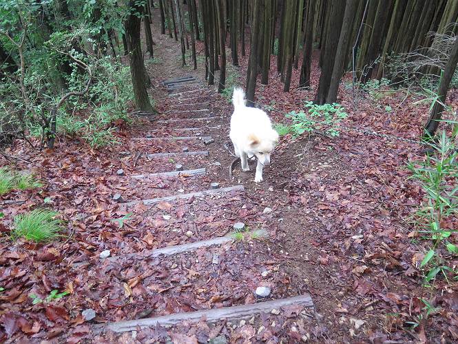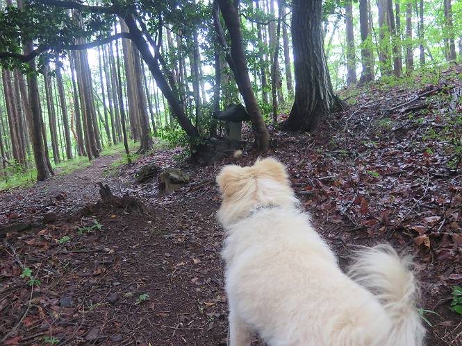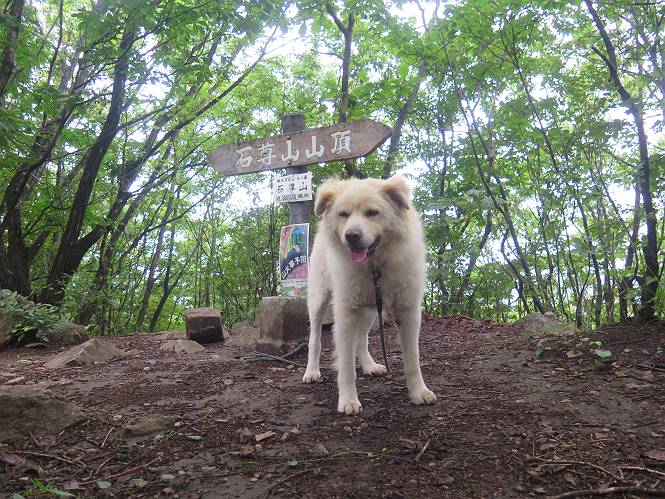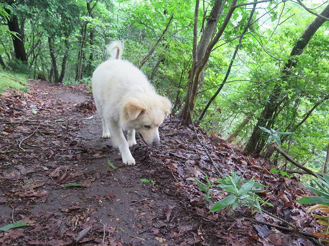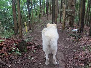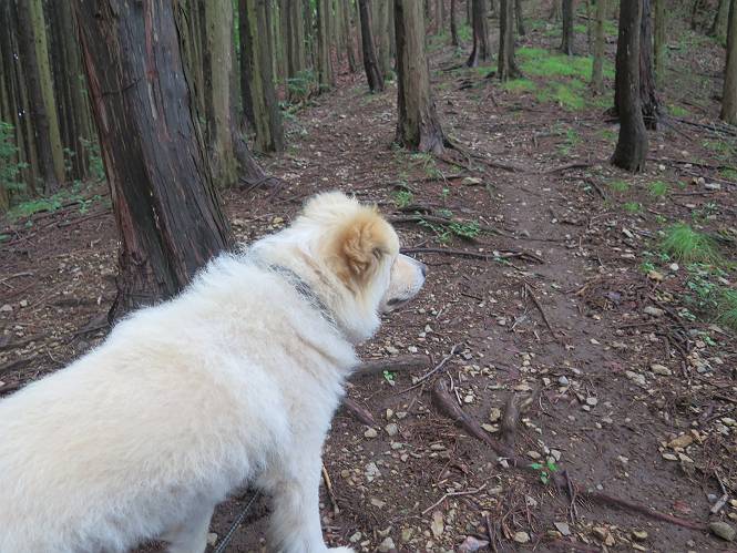 | 平成二十八年七月二十三日 Before 写真集目次へ Next 今日は足利の良く行く山、深高山と石尊山へ行ってきました。天気は曇りで涼しかったですよ。時々霧なんかかかって、ちょっと怖かったですよ。いつもトンネルの傍の駐車場から歩くのですが、登山道に覆いかぶさるような場所をさけて、林道を大分走ってから歩き出しました。駐車した場所から、僕の足で4,5歩で登山道に入りました。 すると、鉄塔の傍を通って、すぐに粟谷町からの道に合流しました。 また少し歩くと、祠があって、 桧林を少し進むと、 丸太の階段に出ました。 ぼくは歩きやすい階段の脇を歩きました。 次は、岩場に出ました。 距離は短いのですが、濡れていて滑るんですよ。 しばらく岩の間を進みますが、緩やかな上りです。 キノコが点々と生えてました、左は15cm、右が10cm以上あるかな、って言ってましたよ。 ここから、また、急坂です。濡れていて滑ります、 ロープをくぐったり、 越えたり、 おお、キツイ・・・。 急坂が終わりました。 山頂はすぐそこです。 見えた! 深高山の山頂に着きました。 オヤツとお水を頂きました。 山頂は、木が茂っていて何も見えません、そろそろ出発です。 踏みしめられた落ち葉の上を歩いて行きますと、 皮のむかれた木が点々とありました、花は咲いてましたが・・・、鹿くんのようです。 緑のトンネルの中を、ちょっと 上がったり下ったりします。 湯殿山に通じる道ですが、 閉鎖されたままになってます。 もう少しで、石尊山に着きます。 石尊山に着きました、またオヤツとお水を頂いて、ゆっくりしたいところですが、 ダニに襲われます、記念写真を撮ってもらって、 すぐ、戻るんですって。 来た道を戻ってますが、誰にも会わないですね。 深高山に戻りました、ちょっとお休みして下ります。 ゆっくり、ゆっくり、って言ってますが、下りはラクチンです。 粟谷町の分岐点を過ぎると、 すぐに到着でした。 天気も良くなかったので、誰にも会いませんでした。時間も早かったしね。 Before 写真集目次へ Next |