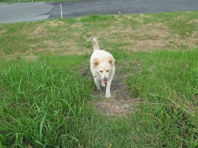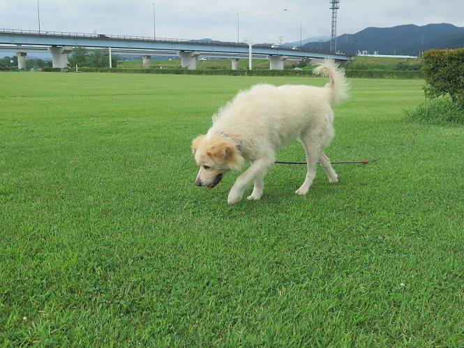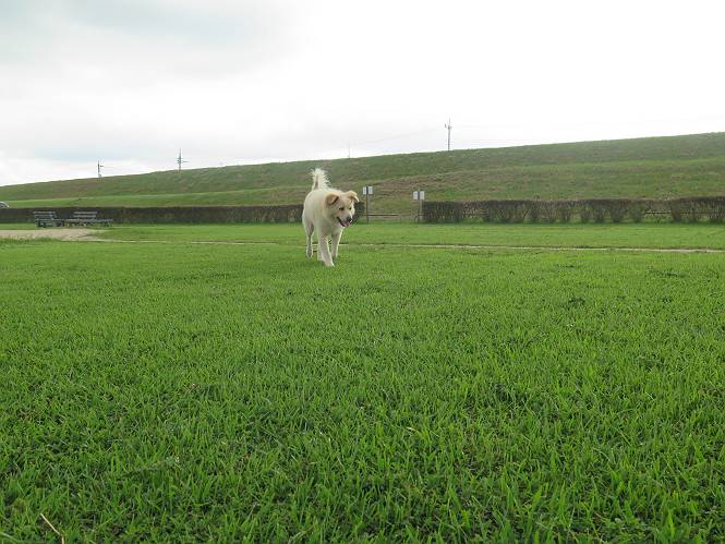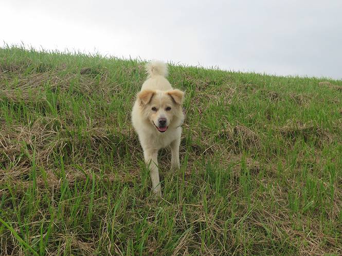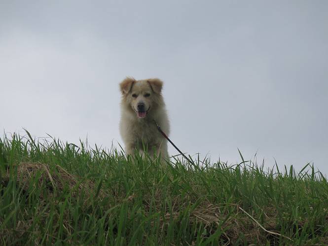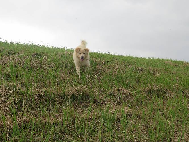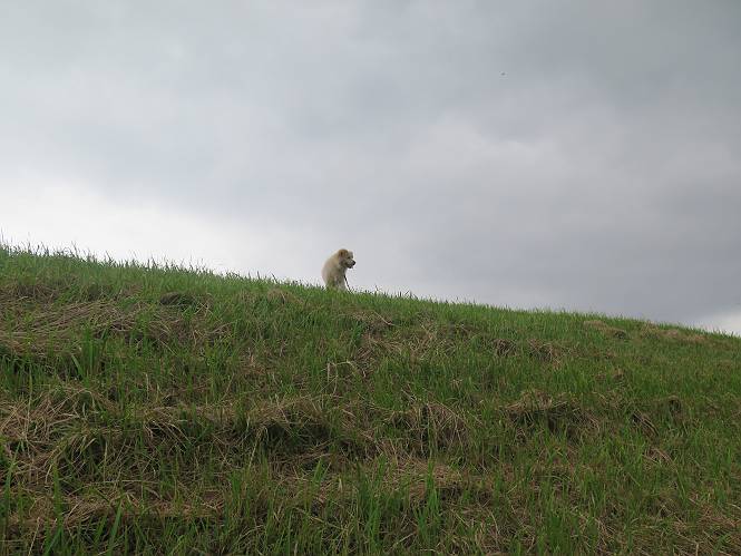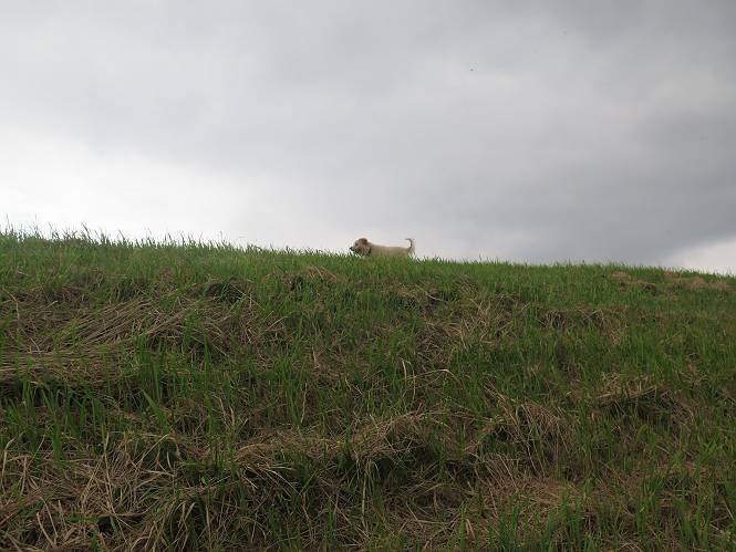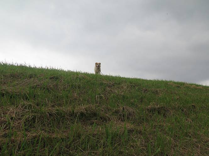 | 平成二十八年九月十四日 Before 写真集目次へ Next 今日は渡良瀬川の河川敷にやってきました。お父さんが、午前中、頂いた石臼を庭にセットして、周りに小石を並べるんだってさ。お母さんが、石を拾っている間に、ぼくと散歩しようってわけなんです。 「いっぱい臭うぞ」、グラウンドを横切って、 「土手に上がっていい?」 草刈りして、歩きやすくなってました。 空は降りそうだけど、高いところから、 気分が良いねえ。 時々人に会ったり、自転車とすれ違ったりします。 川が曲がって、景色が変わっていきます。 お父さんは下を歩くんだってさ、 ぼくは端っこを歩きました。 「自転車が来たぞ、降りて来い!」、だって、 この辺で降りようかな。 「降りまーす」 おお、面白いぞ、 ラクチン、ラクチン。 グラウンドまで降りてしまいました。 今日は、誰もいないんですよ。 あっ、見えた、 見えたぞ、お母さんだ。 オヤツをもらえるかな? あとで、だってさ。結局、夕飯までオアズケでした。 Before 写真集目次へ Next |