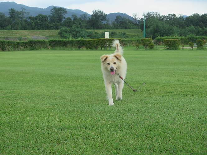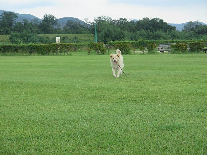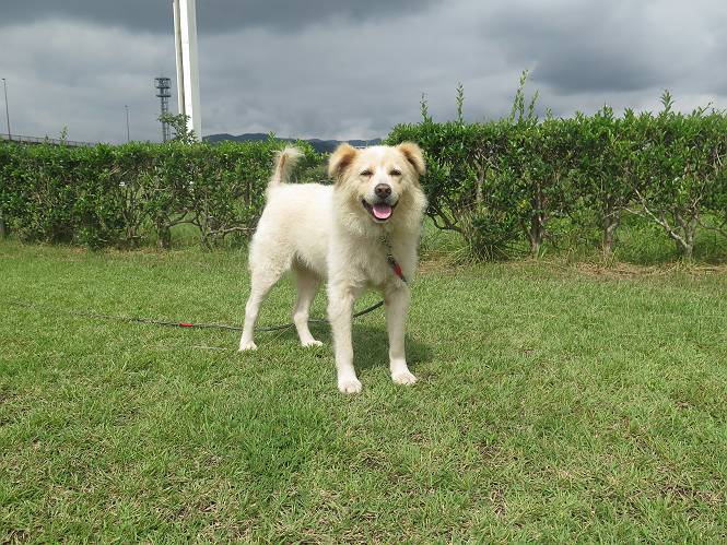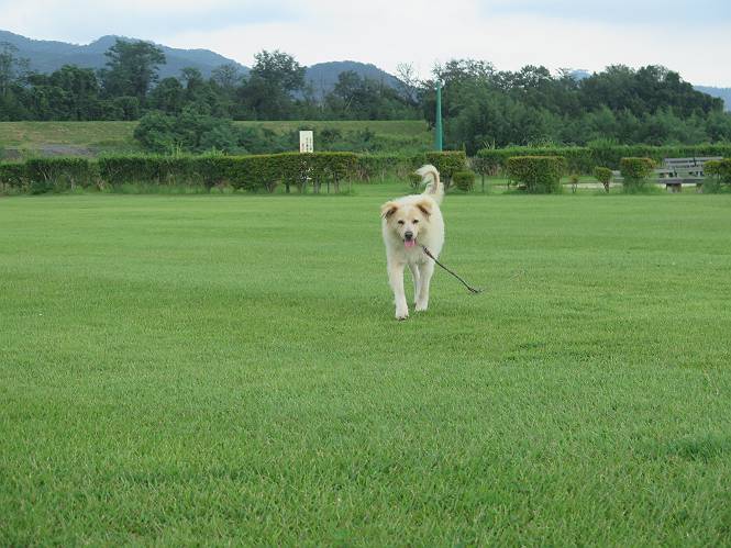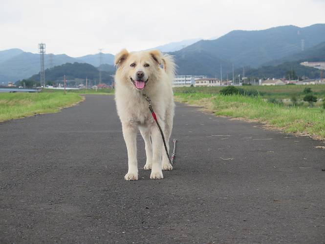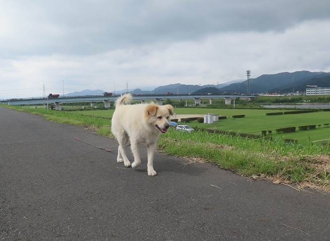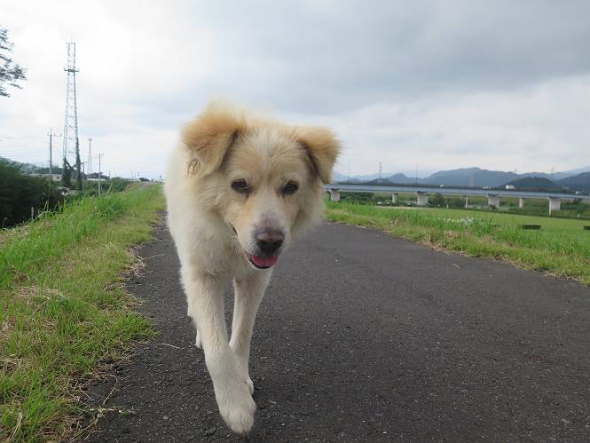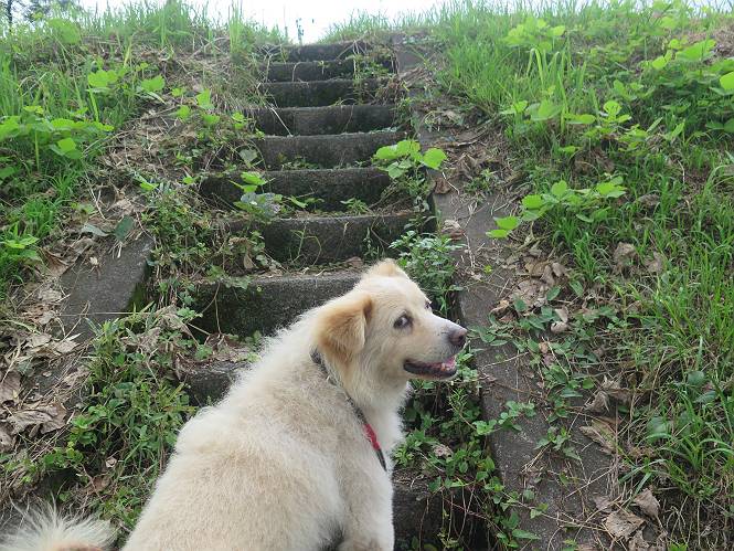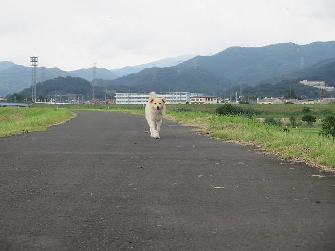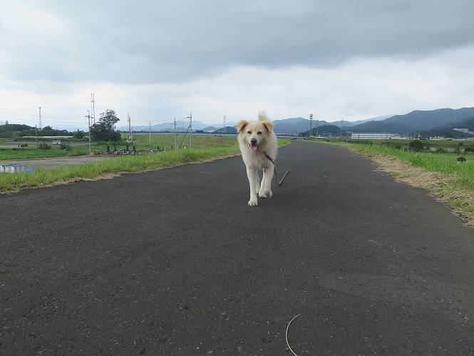 | 平成二十八年九月十四日 Before 写真集目次へ Next 今日は渡良瀬川の河川敷にやってきました。お父さんが、午前中、頂いた石臼を庭にセットして、周りに小石を並べるんだってさ。お母さんが、石を拾っている間に、ぼくと散歩しようってわけなんです。 「いっぱい臭うぞ」、グラウンドを横切って、 「土手に上がっていい?」 草刈りして、歩きやすくなってました。 空は降りそうだけど、高いところから、 気分が良いねえ。 時々人に会ったり、自転車とすれ違ったりします。 川が曲がって、景色が変わっていきます。 お父さんは下を歩くんだってさ、 ぼくは端っこを歩きました。 「自転車が来たぞ、降りて来い!」、だって、 この辺で降りようかな。 「降りまーす」 おお、面白いぞ、 ラクチン、ラクチン。 グラウンドまで降りてしまいました。 今日は、誰もいないんですよ。 あっ、見えた、 見えたぞ、お母さんだ。 オヤツをもらえるかな? あとで、だってさ。結局、夕飯までオアズケでした。 Before 写真集目次へ Next |