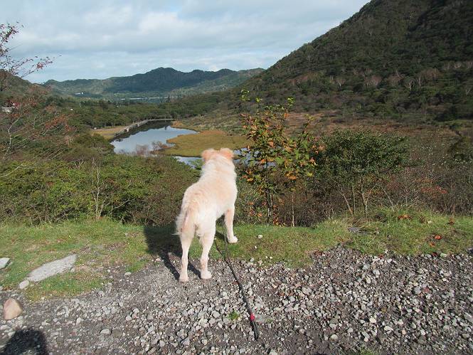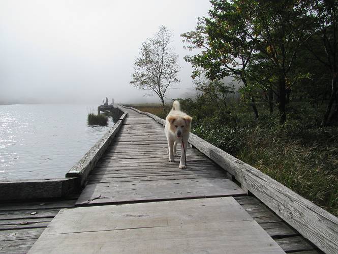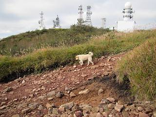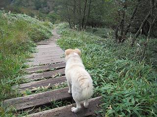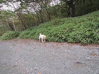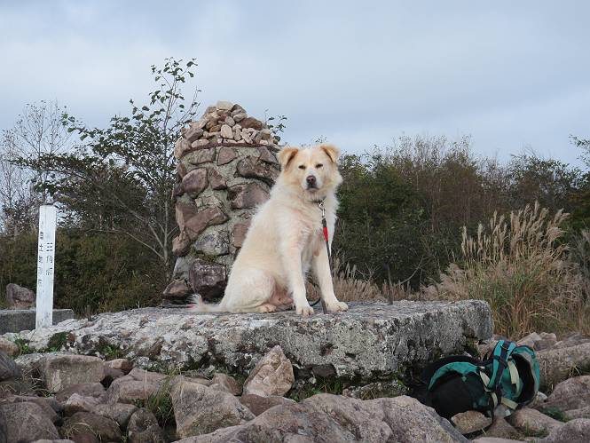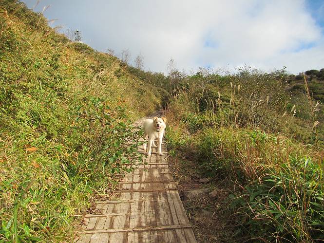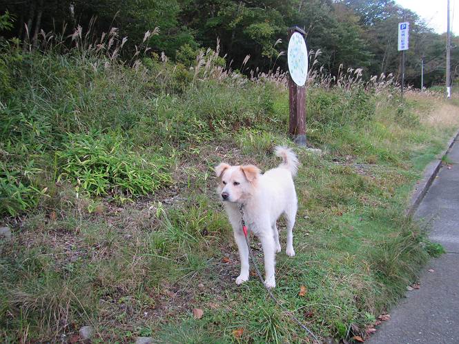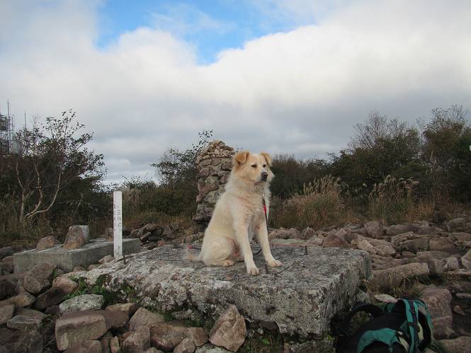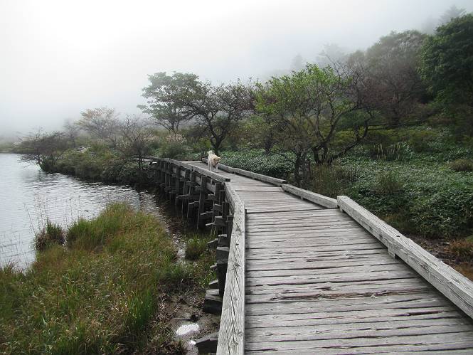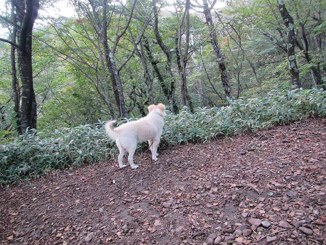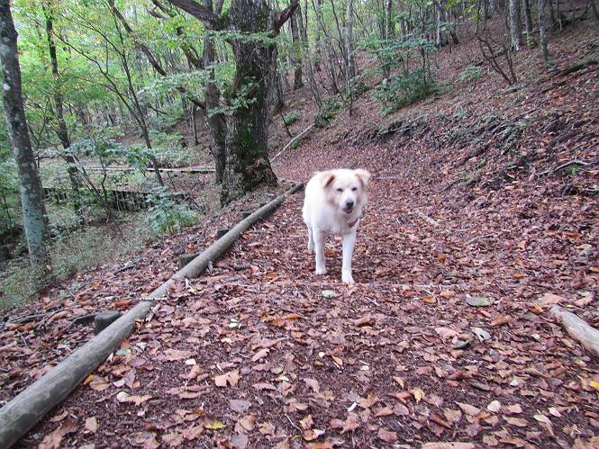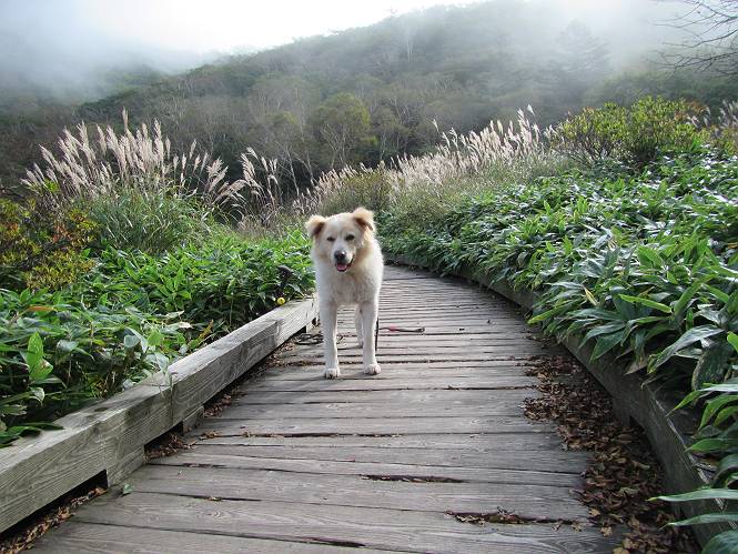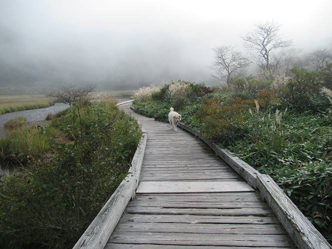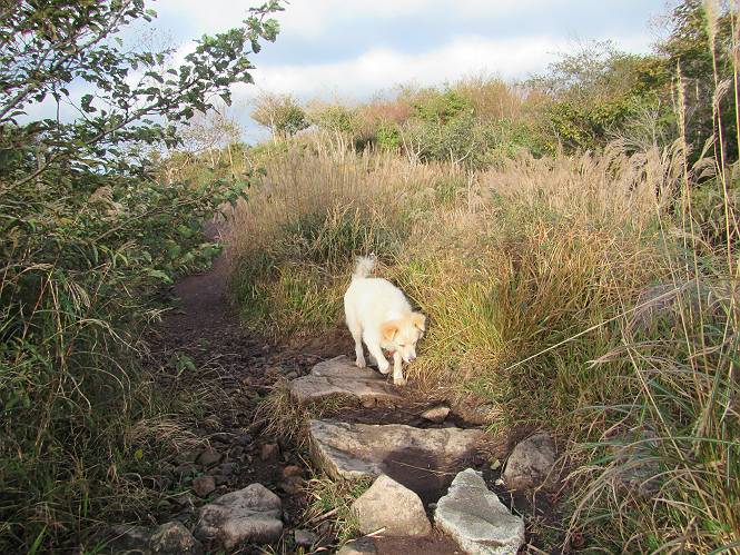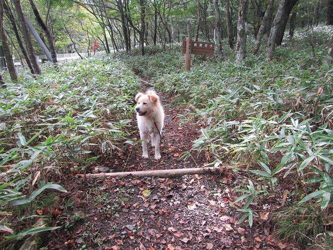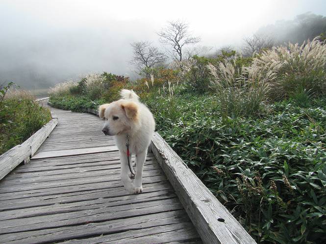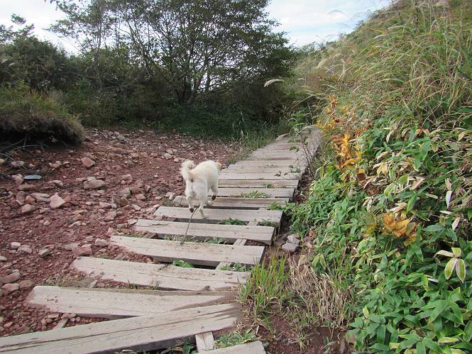 平成二十八年九月三十日 Before 写真集目次へ Next 大分涼しくなったので、2,3ケ月ぶりかな、赤城山へ行ってきました。見晴山駐車場から地蔵岳へ上り、八丁峠から道路を歩き鳥居峠へ、ここから覚満淵の木道歩き、また道路を少し、句碑めぐり遊歩道を歩いて見晴山駐車場に戻りました。 見晴山駐車場です、ここからスタートします。 ちょっと進んだところから右に曲がって、緩やかに上がって行きます。 笹に被われた雑木林です、右は牧場のようです。 下の方で鹿が鳴いてました、追って行きたいのですが、「ダメ!」が始まります。 角張った石ころの道に出たり入ったり 岩がひとまわり大きくなって、その先で新坂平からの道に合流しました。 徐々に急坂になって、歩きにくくなっていきます 踏ん張って、上がって行きました。 森の中に陽がさし、アンテナが見えてきました。 もう少しで山頂のようです。 山頂部に出ました、ヤッター、しばらくぶりなのでうれしかったです。 アンテナが沢山ありますね。 草が紅葉して、綺麗です。 奥の方へ行ってみよう。 小さな半身の地蔵様がありました。 平らな山頂部を北側に進みます。 一面のススキの間を通って、 三角点のある山頂に出ました。 オヤツとお水を頂いて、おいしかったです。 大沼と黒檜山、霧が大分払われてきましたが、もう少しです。 左側を大きくすると、小黒檜山の左に燧ケ岳が見えてます。 誰も来ないなあ、どうしたんでしょう。 とりあえず、八丁峠へ下ります。 小石を敷き詰めたような道を、緩やかに下って、 木段に出ます、長いですよ。 この先で、 小沼が見えました。 ちょっと木が被ってますね。 抜けると木道に出ました。 草が綺麗ですね。 陽がさして、 ススキの穂が輝いてます。 笹が多くなると、八丁峠までもう少しです。 長いなあ、 走っちゃおう 木段が終わって、 ちょっと先で道路に出ました、駐車場です。 ここが八丁峠です。その先、小沼駐車場付近で行ったり来たり、 結局、道路を歩いて、鳥居峠に行きます。 地蔵岳が、こんな形に見えます。 ショートカットもしました。 法面の一ヶ所だけ、紅葉の進んだ場所がありました。 鳥居峠の駐車場に出ました。 ここから覚満淵を見下ろしました。 草紅葉が綺麗ですね、あっちへ行ってみよう。 鹿避けネットをくぐらしてもらいました。 東の木道から覚満淵を眺めてます。 綺麗ですね、時々霧がかかります。 南周りで草紅葉を見ながら歩いてます。 綺麗ですね。 周りの木が紅葉したら、・・・・・ また、霧がまってきました。 ひとが出てきましたね、写真を撮っているのかな。 レンゲツツジの紅葉です、始まったところですね。 マユミの実です。 これはテンナンショウだそうです。 ナナカマドの実です、葉は大分傷んでますね。 ズミの実です。 霧です、 見えなくなってしまいそう。 そろそろ、ガスもまいてきたことだし、 道路の方へ、行きましょうか。 鹿避けの引き戸を通って、 ビジターセンターの所から道路を歩いてます。 ここからも八丁峠へ行けるそうです。 スキー場の横を通って、 句碑めぐり遊歩道に入りました。 道路がすぐ下に見えます。 山の中におじさんがいるよ、「キノコ採りかな?」 句碑ですが、ぼくは解んないよ。 少しずつ上がってます。 ここで、沢の水を飲みました、ついでに遊びました。 ここから少し進むと、駐車場です。 久しぶりに楽しかったです、ぼく疲れてないよ。 Before 写真集目次へ Next |