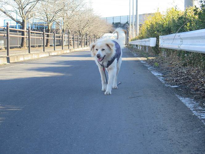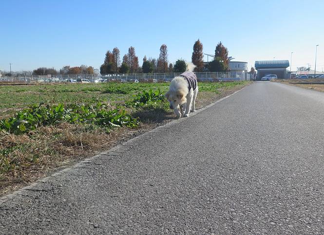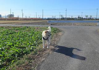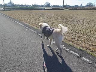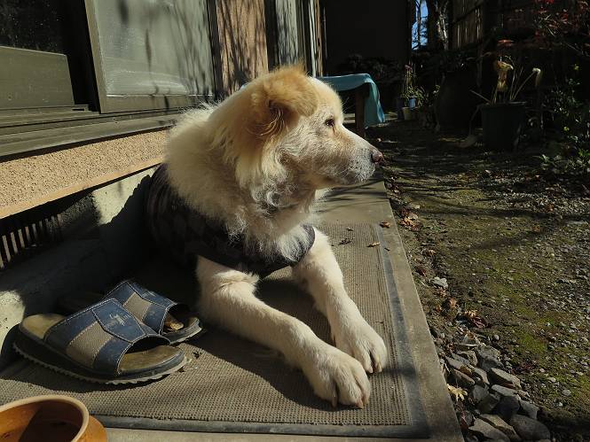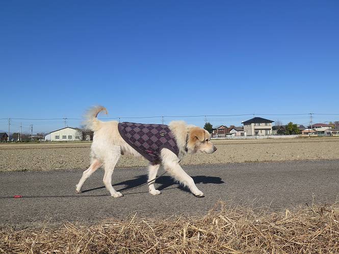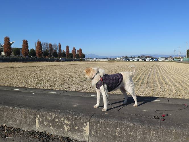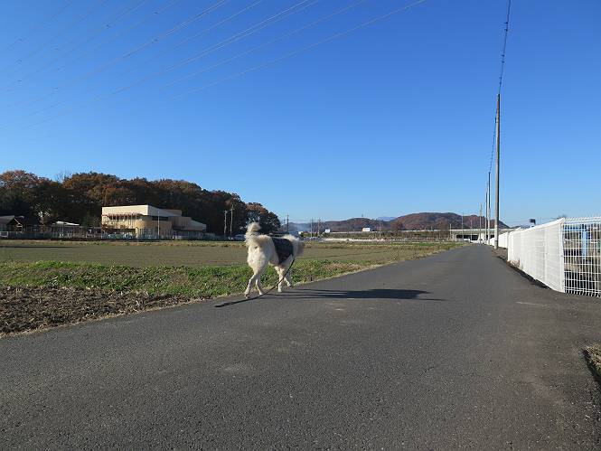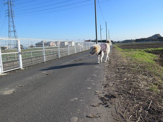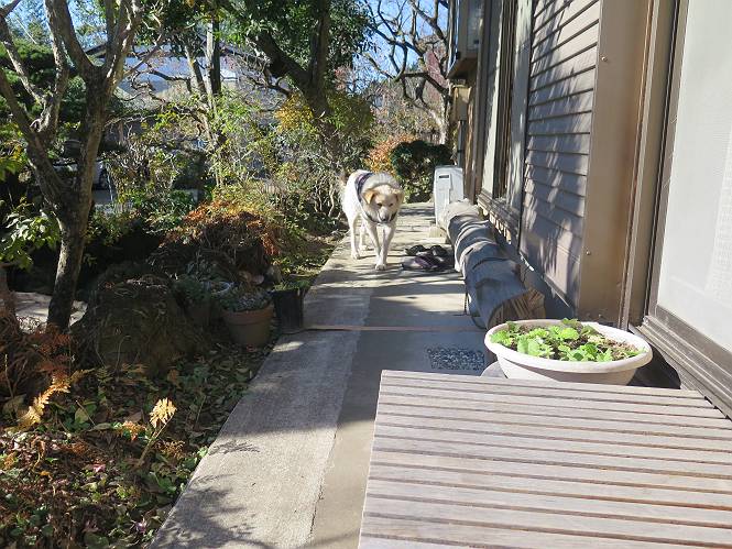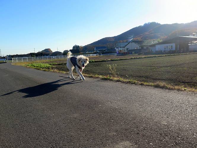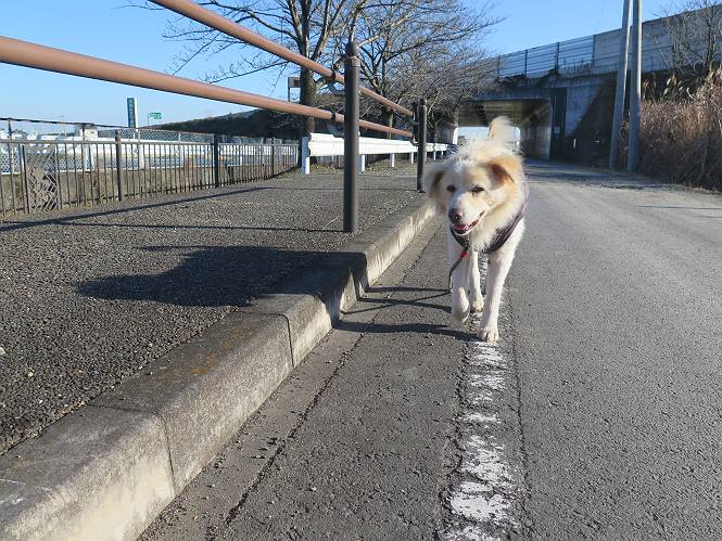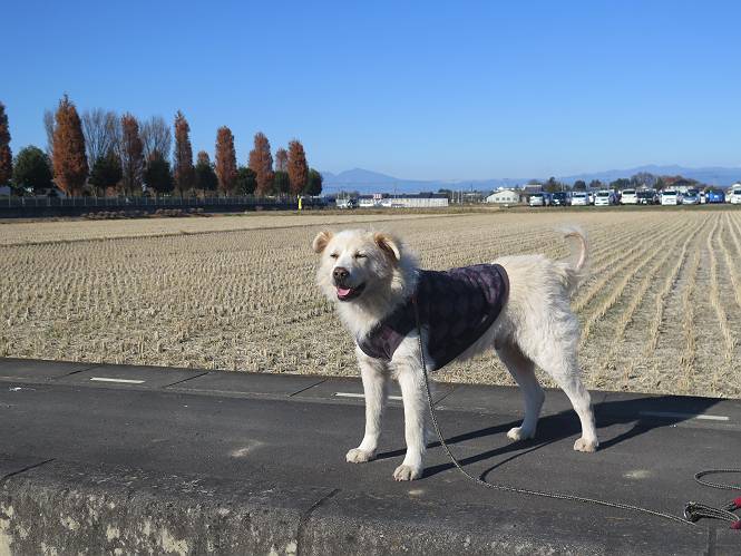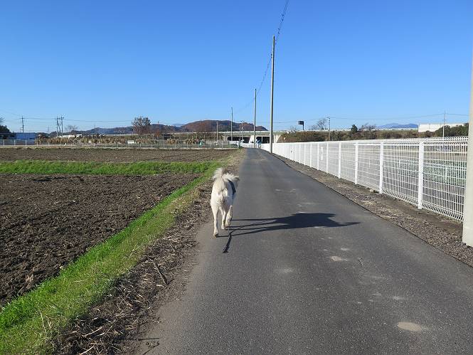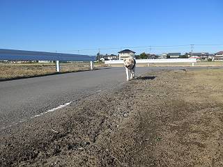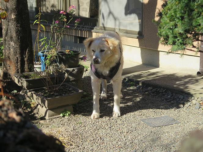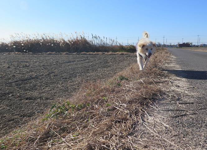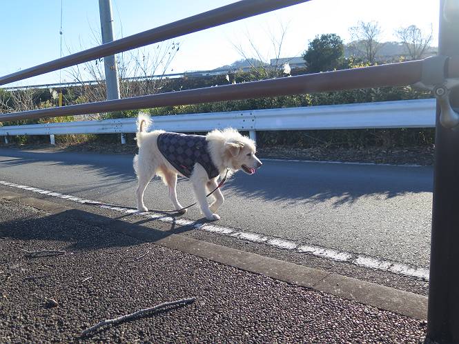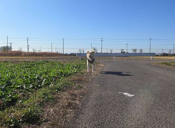 | 平成二十八年十二月三日 Before 写真集目次へ Next 今日は良い天気で暖かいです。いつもの濡縁で日向ぼっこをしてます。ぼくの家の横に植えてあった皇帝ダリアは少し咲いただけで雪と霜にやられてしまいました。お母さんは、「また来年咲くよ」、って言って、さっさと片付けてしまいました。紅葉も終わって、お庭が殺風景になってしまい、ガーデニングをして花をいっぱい植えました。春まで楽しめるんだってさ。ぼくは、こうして、お母さんの傍で見ています。 暖かくて、いい気持、 眠気がさしてきちゃったよ。 半日陰の場所に、移動して、 寝転んでしまいました。 のどもかわいてしまいました。 ここで、また横になって、お母さんの様子を見てます。 うとうとしていたら、お母さんがいなくなっちゃいました。 お勝手かな、 いました、「お母さん、オヤツ頂だい」 午前の部の仕事が一段落したそうです。午後は妻沼の道の駅に出かけました。お母さんが、お買い物している間に、お父さんと周辺の田圃を散歩しました。良く歩いてますので、道は慣れてます。道の駅のすぐ裏の休耕田にきました。 北の方向に歩いてます。後ろが道の駅です。 時々車が通りますが、静かな田園が広がってます。 どっちに行こうかな。 右だ! ここも作ってないようです、お父さんが、「忠治、草の実をつけるなよ」、って言うんだけど・・・・・。 いいねえ、温かくて風もないし、 次の十字路を右に曲がりました。 次は、「曲がれ!」、って言ってましたが、通過してしまいました。あっちに回ればいいんですよ。 もう少し真っすぐ進んで、 右に曲がると、遠くに赤城山が見えました。 一枚撮ってもらいましたが、??? 回り込んで、駐車場に出ました。 ぼくんちの車は、どこかな。 ありました、ありました。 こっちだよ。 ちょっとビスケットをもらって、家に戻ります。利根川を渡って、左に入り、グルグルまわって、金山を越えました。もうぼくんちはすぐです。良く歩く隣町で降ろしてもらい、また散歩です。この道は狭いので車は通りません。 大谷幹線に出ました、ここを真っすぐ北に進みます。高速道路があって、奥の山は唐沢山です。 後ろの左は金山です。 この道も狭いのですが、時々車が通ります、今、避けて待ってました。 このコースも、ぼく好きなんだ。 右に寄ったり、左に寄ったり、 真ん中を歩いたり、楽しいよ。 高速道路をくぐって、桜並木に出ました。 ぼくは下の道を お父さんは遊歩道を歩いてます。 交差点に出ました。 ここからは、いつも歩く散歩コースです、ぼくんちはすぐそこです。 Before 写真集目次へ Next |