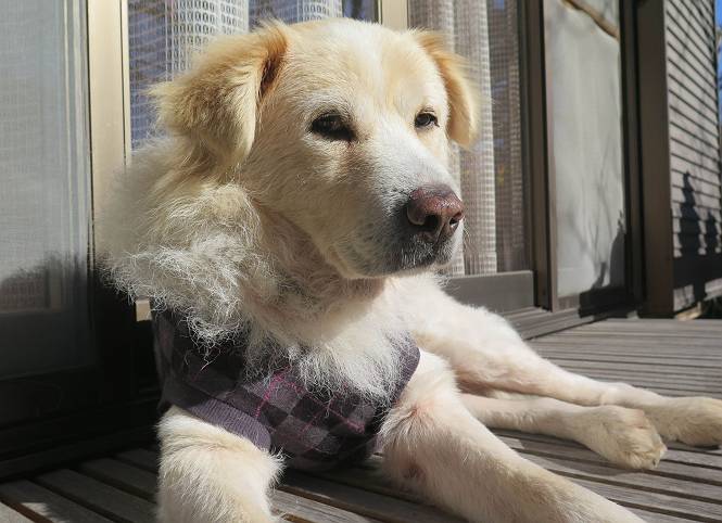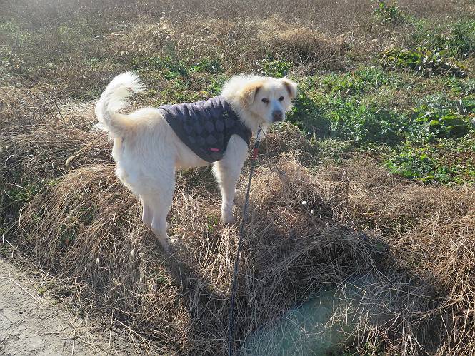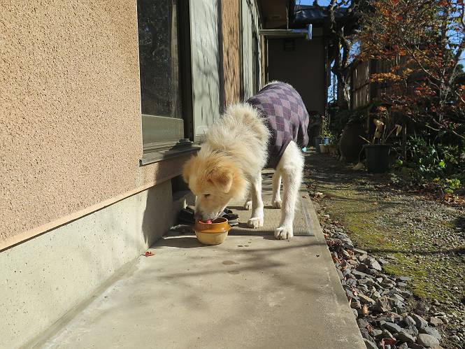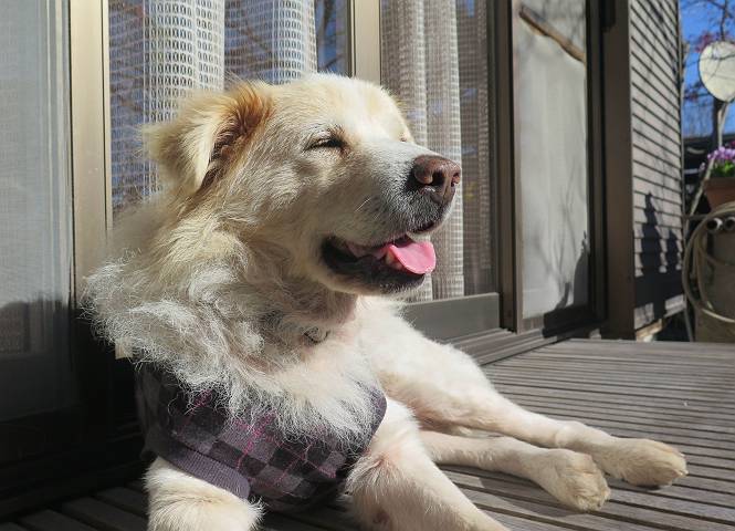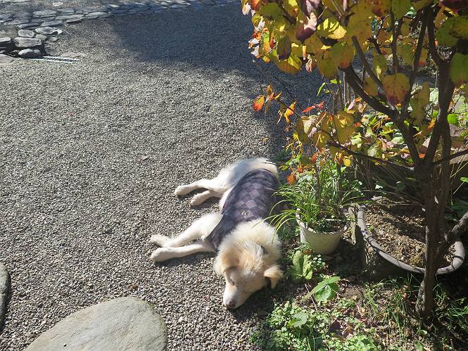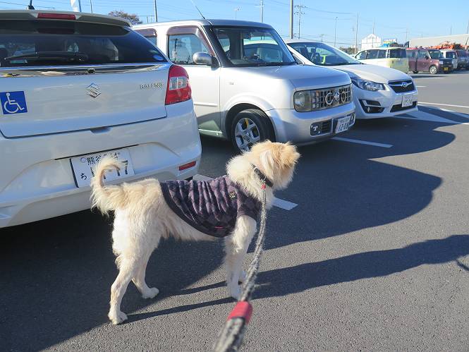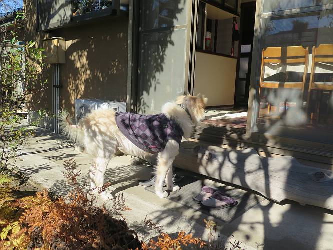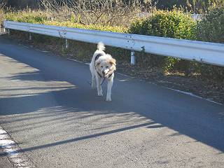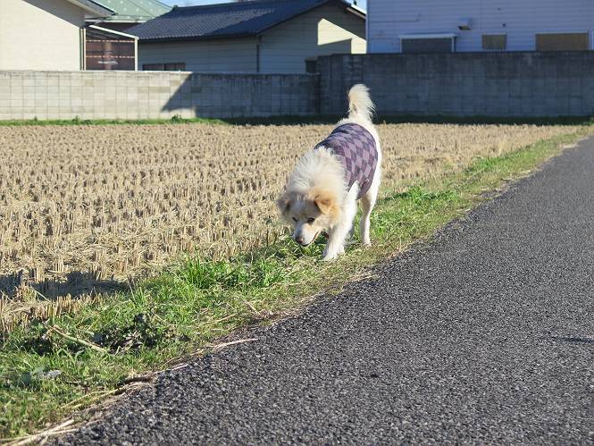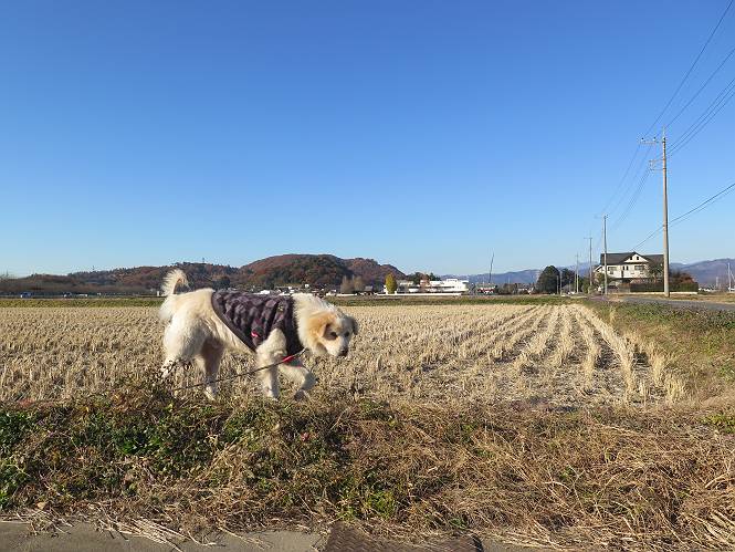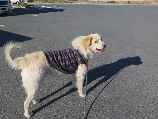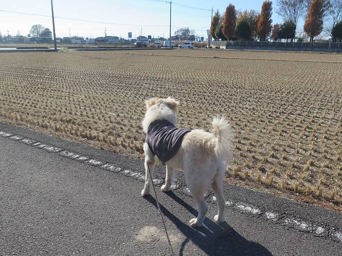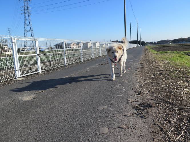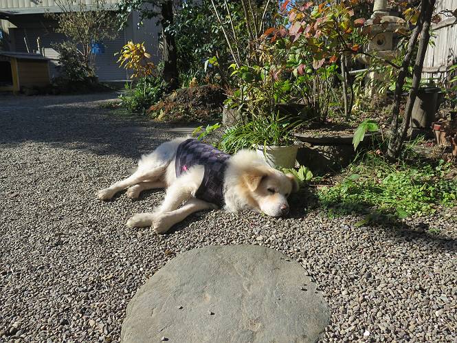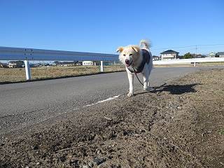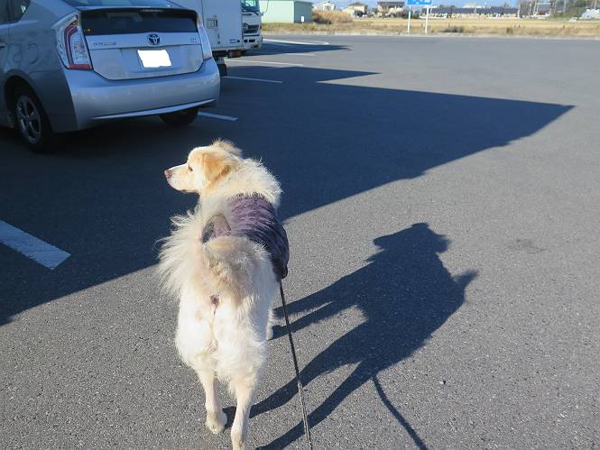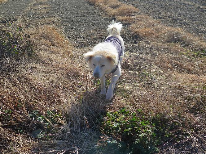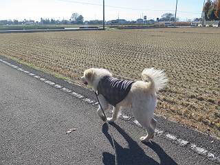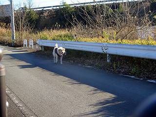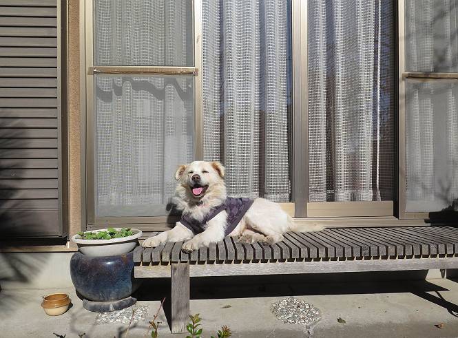 | 平成二十八年十二月三日 Before 写真集目次へ Next 今日は良い天気で暖かいです。いつもの濡縁で日向ぼっこをしてます。ぼくの家の横に植えてあった皇帝ダリアは少し咲いただけで雪と霜にやられてしまいました。お母さんは、「また来年咲くよ」、って言って、さっさと片付けてしまいました。紅葉も終わって、お庭が殺風景になってしまい、ガーデニングをして花をいっぱい植えました。春まで楽しめるんだってさ。ぼくは、こうして、お母さんの傍で見ています。 暖かくて、いい気持、 眠気がさしてきちゃったよ。 半日陰の場所に、移動して、 寝転んでしまいました。 のどもかわいてしまいました。 ここで、また横になって、お母さんの様子を見てます。 うとうとしていたら、お母さんがいなくなっちゃいました。 お勝手かな、 いました、「お母さん、オヤツ頂だい」 午前の部の仕事が一段落したそうです。午後は妻沼の道の駅に出かけました。お母さんが、お買い物している間に、お父さんと周辺の田圃を散歩しました。良く歩いてますので、道は慣れてます。道の駅のすぐ裏の休耕田にきました。 北の方向に歩いてます。後ろが道の駅です。 時々車が通りますが、静かな田園が広がってます。 どっちに行こうかな。 右だ! ここも作ってないようです、お父さんが、「忠治、草の実をつけるなよ」、って言うんだけど・・・・・。 いいねえ、温かくて風もないし、 次の十字路を右に曲がりました。 次は、「曲がれ!」、って言ってましたが、通過してしまいました。あっちに回ればいいんですよ。 もう少し真っすぐ進んで、 右に曲がると、遠くに赤城山が見えました。 一枚撮ってもらいましたが、??? 回り込んで、駐車場に出ました。 ぼくんちの車は、どこかな。 ありました、ありました。 こっちだよ。 ちょっとビスケットをもらって、家に戻ります。利根川を渡って、左に入り、グルグルまわって、金山を越えました。もうぼくんちはすぐです。良く歩く隣町で降ろしてもらい、また散歩です。この道は狭いので車は通りません。 大谷幹線に出ました、ここを真っすぐ北に進みます。高速道路があって、奥の山は唐沢山です。 後ろの左は金山です。 この道も狭いのですが、時々車が通ります、今、避けて待ってました。 このコースも、ぼく好きなんだ。 右に寄ったり、左に寄ったり、 真ん中を歩いたり、楽しいよ。 高速道路をくぐって、桜並木に出ました。 ぼくは下の道を お父さんは遊歩道を歩いてます。 交差点に出ました。 ここからは、いつも歩く散歩コースです、ぼくんちはすぐそこです。 Before 写真集目次へ Next |