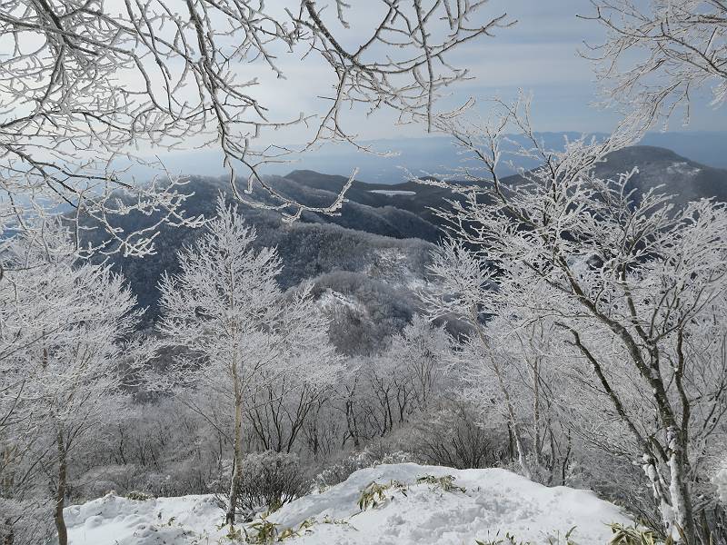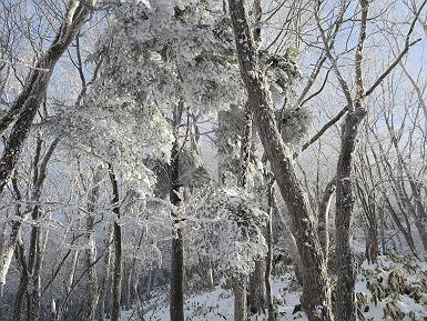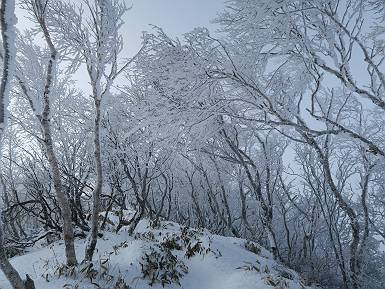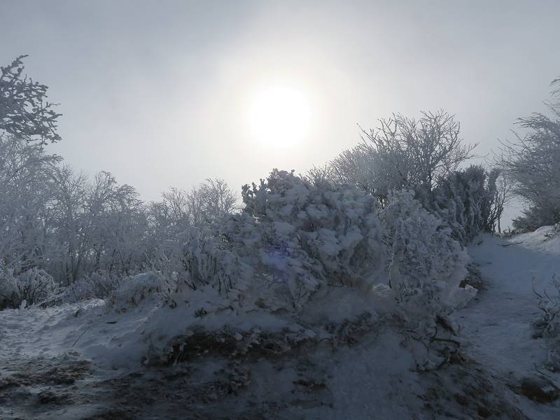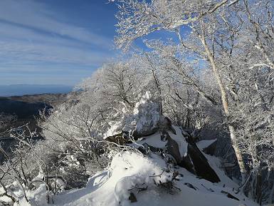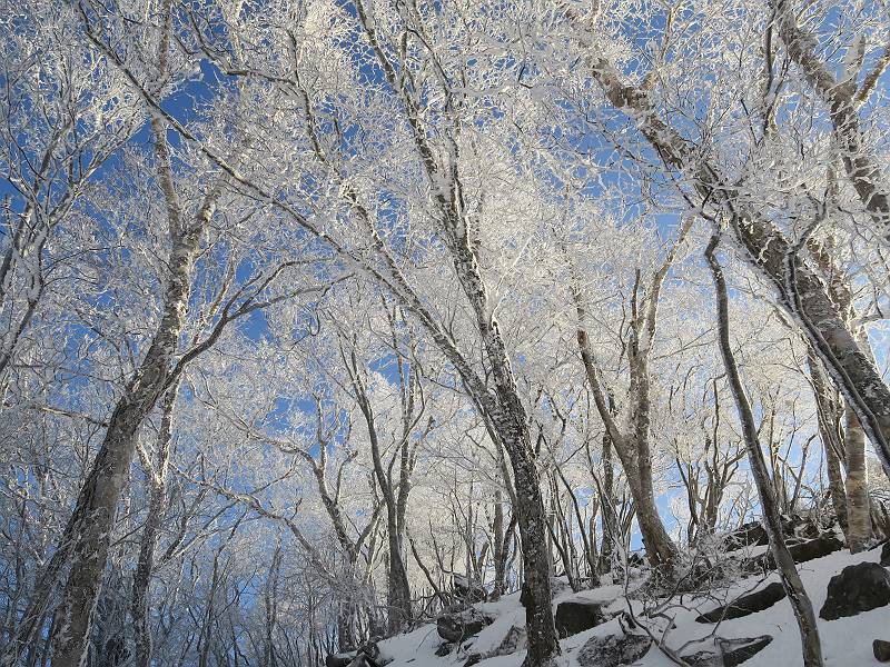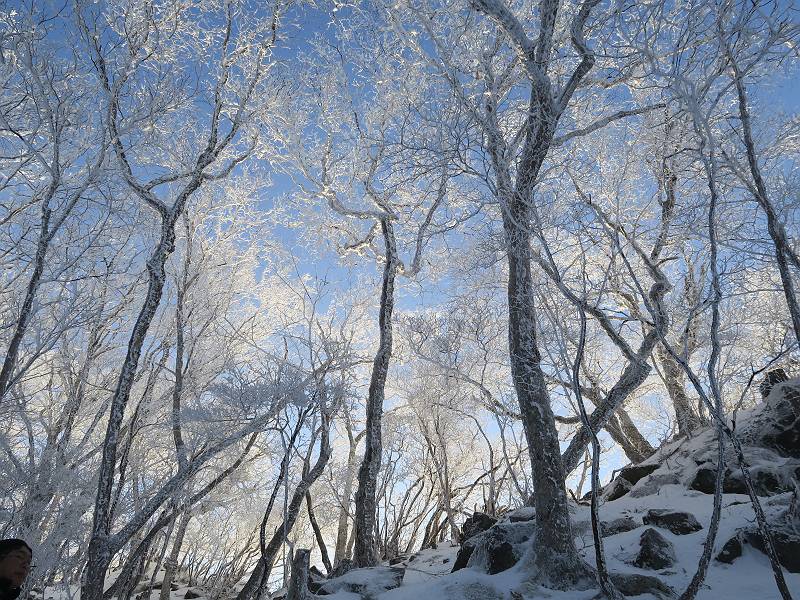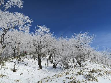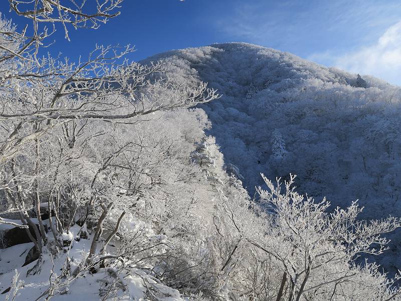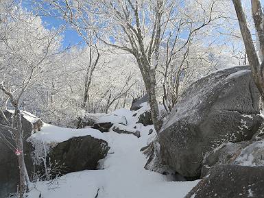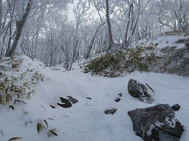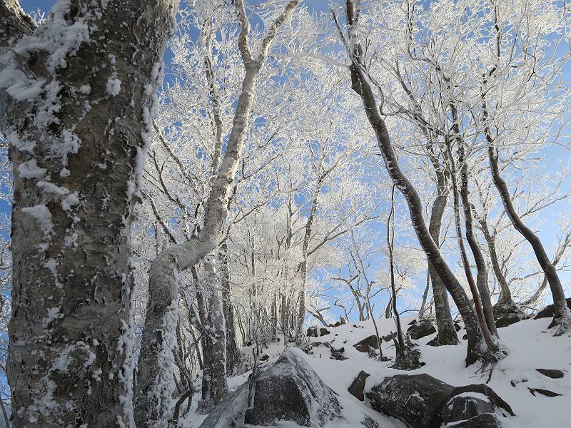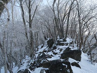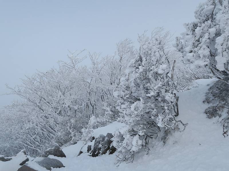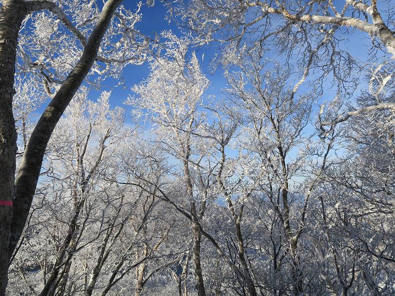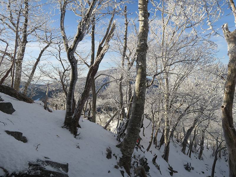 | 山行日 2024年12月25日 晴れ コース 黒檜山登山口→黒檜山→駒ケ岳→駒ケ岳登山口→黒檜山登山口(5km) 今日は良い霧氷が見られるだろう。早朝のおのこ駐車場から見上げる黒檜山には少々雲が。 路肩に駐車して7:18,スタート。 霧氷を鑑賞しながらゆっくり歩く、ゴロゴロ岩が歩きにくい。 猫岩付近から地蔵岳 7:40,猫岩 8:15,富士山ビューポイント 地蔵岳の左に富士山遠望 地蔵岳の右に八ヶ岳 北方向に向かう黒檜山 急坂が続く 枝間から浅間山 同、富士山 ガスってきちゃった 9:17,駒ケ岳からの道を合わせる 9:22,黒檜山着 ガスの中ビューポイントへ向かう 9:29,祠、しばらく様子をみる・・・・・ 薄日が差すが、駒ケ岳経由で下ろう ビューポイントに向かうハイカー 青空も・・・・・ 9:39, また雲ってしまった、帰ろう 9:46、分岐点通過 黒山大神 周辺の霧氷 9:46,分岐点 木段注意 雲が取れてきた、趙七郎山、小沼、地蔵岳、小沼の南に富士山 東に筑波山 やすべーさんにバッタリ、元気だなあ 向かう駒ケ岳と富士山遠望 へ小ピーク 鈴ケ岳、北アルプスと四阿山 10:24,下って大タルミ 大タルミから黒檜山 軽く登り返して、黒檜山を振り向く 10:46,駒ケ岳着 黒檜山左に上越の山並み 駒ケ岳山頂から浅間山〜草津白根山方面 浅間山 ![]() 仙ノ倉山、谷川岳方面倉山 苗場山方面 草津白根山方面 黒檜山 11:12,ベンチ 上の鉄階段 下の鉄階段 アイゼンを外して・・・・・ 11:54,駒ケ岳登山口 おのこ駐車場 おのこ駐車場から黒檜山 駒ケ岳西斜面 黒檜山登山者駐車場 12:15,登山口の路肩 総所要時間は、4時間57分、距離はおよそ5km、累積標高差は430mほど。黒檜山の岩場と駒ケ岳の階段には往生しました。 8080221の雑記帳(続)へ 記録一覧へ |