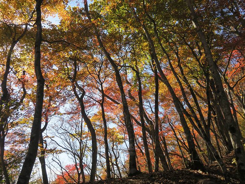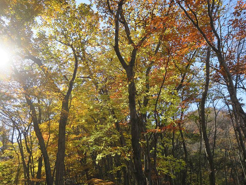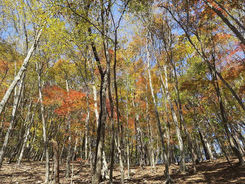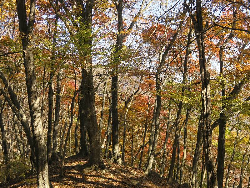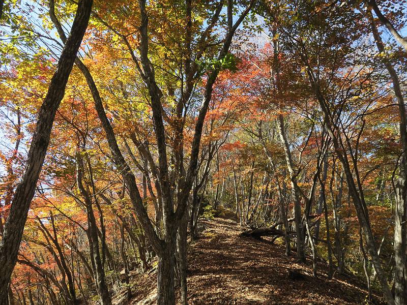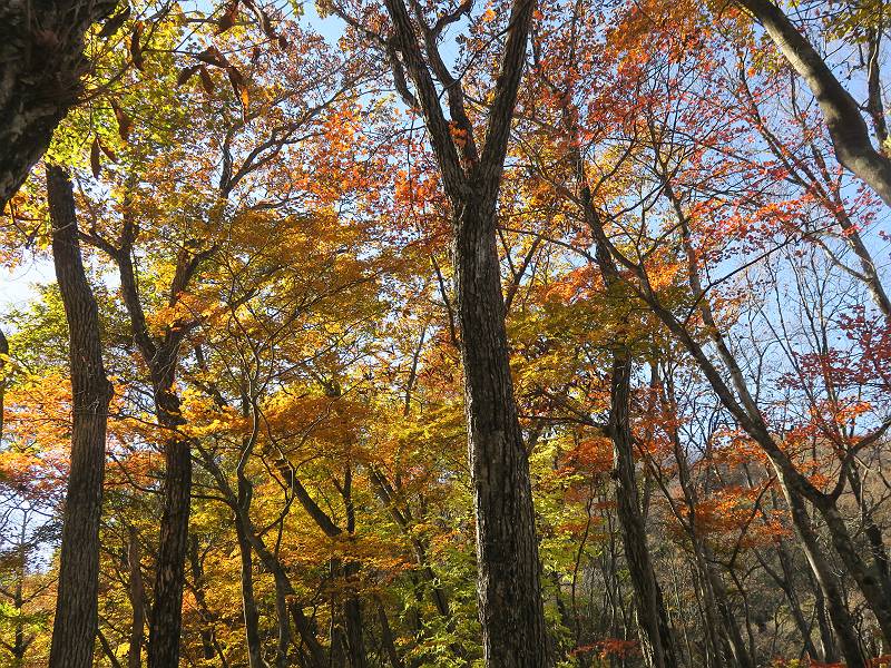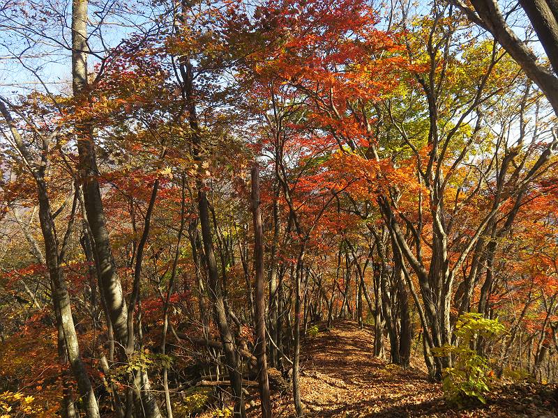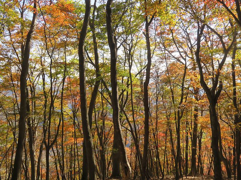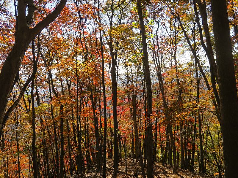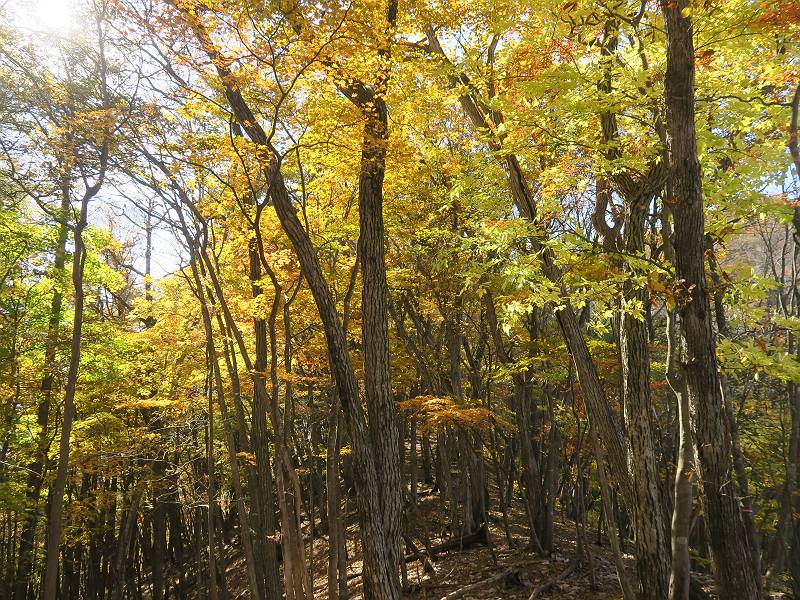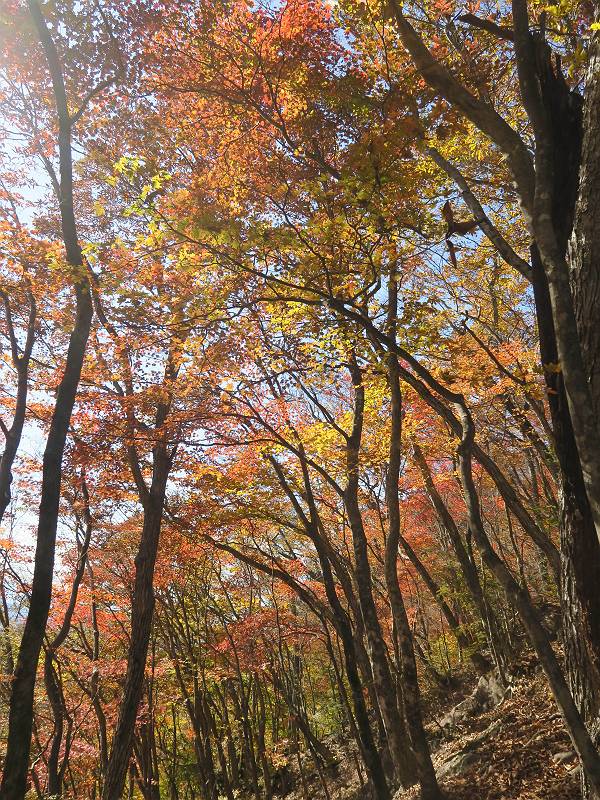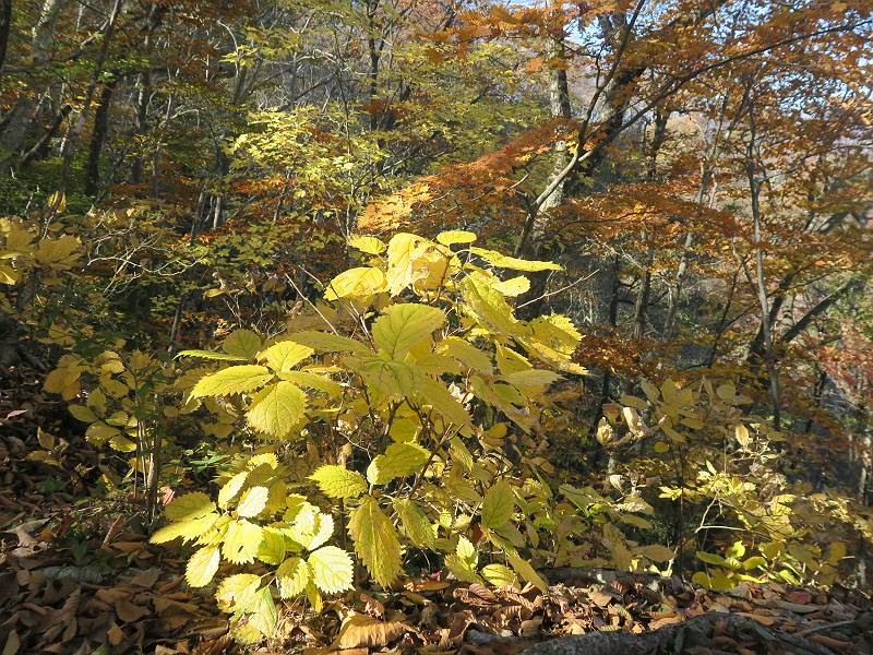 | 山行日 2024年11月12日 晴れ 単独 コース 駒岩(R353路肩駐車スペース)→駒岩の水場→石尊山→駒岩の水場→駒岩(往復5.5km、標高差603m) 高ジョッキから1時間ほどかけ紅葉の名所石尊山登山口に着く。軽食をとって10:02出発する。 集落の間を抜け、杉林の中の急坂をしばらく進むと、 小さな鳥居をくぐり広葉樹の急斜面に出る、道はジグザグしながら高度を上げていく。 真っ赤な紅葉を期待していたがハズレ、早いのかなあ。 でも高度とともに紅葉が増えてくる 11:06,水場 道は沢の真上を横断する、足元注意 この辺に来ると赤色が徐々に増す コアジサイの黄葉 コアジサイ 真っ赤だ、この辺は期待通り 石尊山山頂 11:45-12:04 西の高田山 榛名山 赤城山 往路を戻る、上部の紅葉は奇麗だ コアジサイの黄葉 12:22、水場 12:34、鳥居 12:56,駐車場着 総所要時間は、2時間44分、水場を過ぎて間もなく、山頂直下まで、紅葉のまあまあ見られるところがあった。 8080221の雑記帳(続)へ 記録一覧へ |