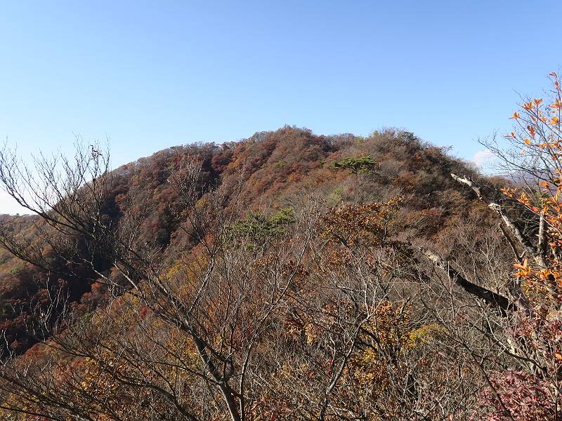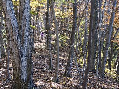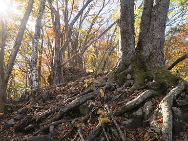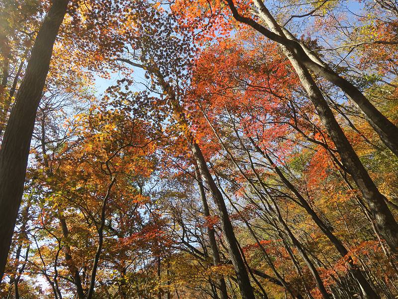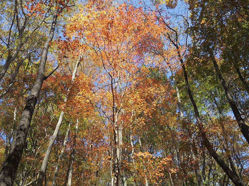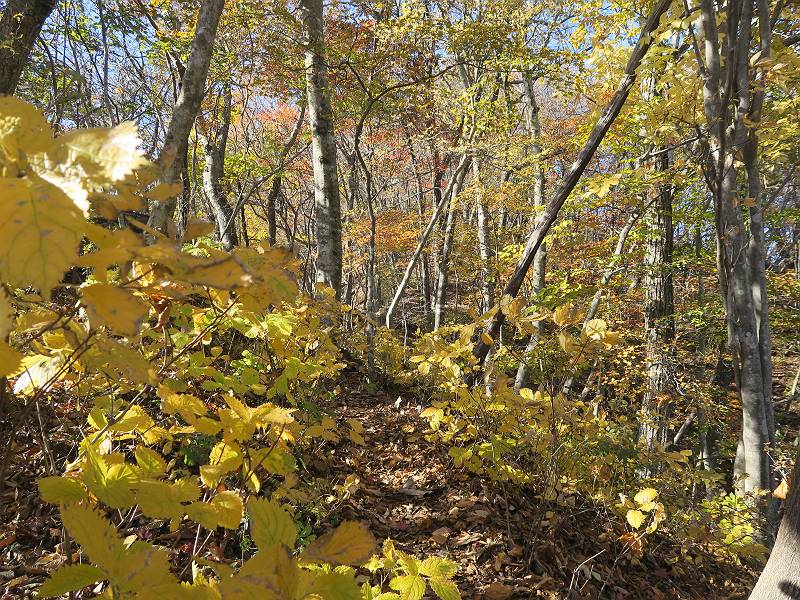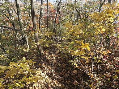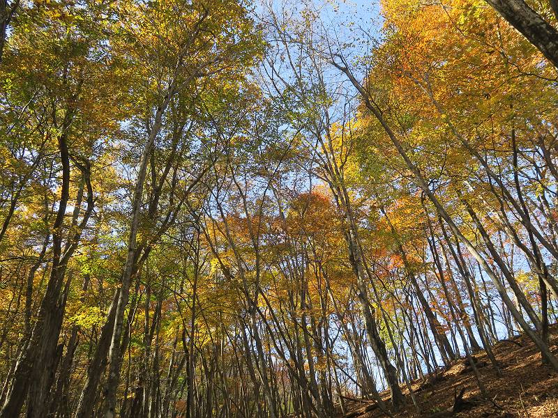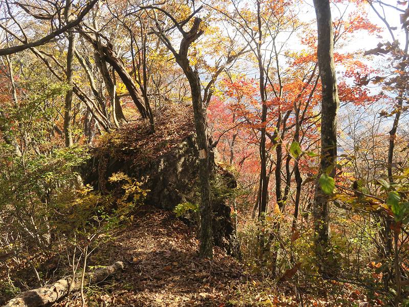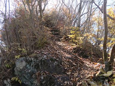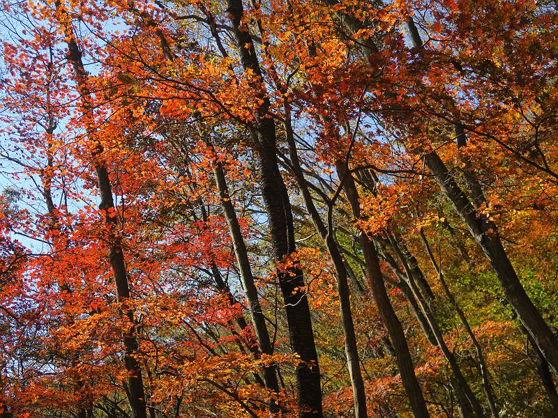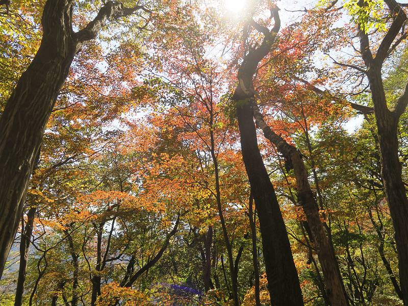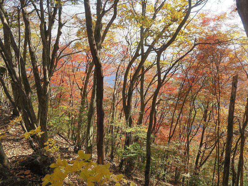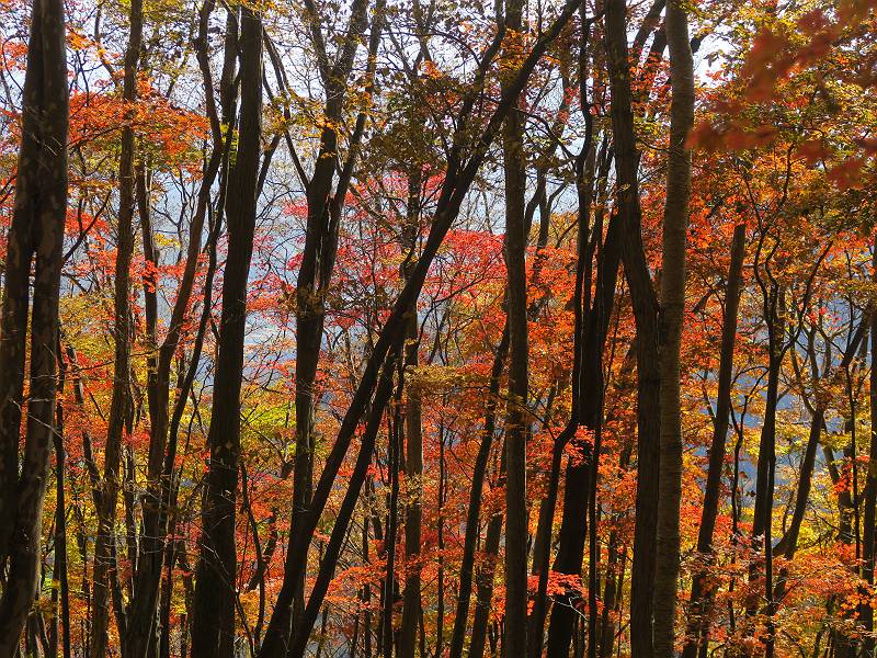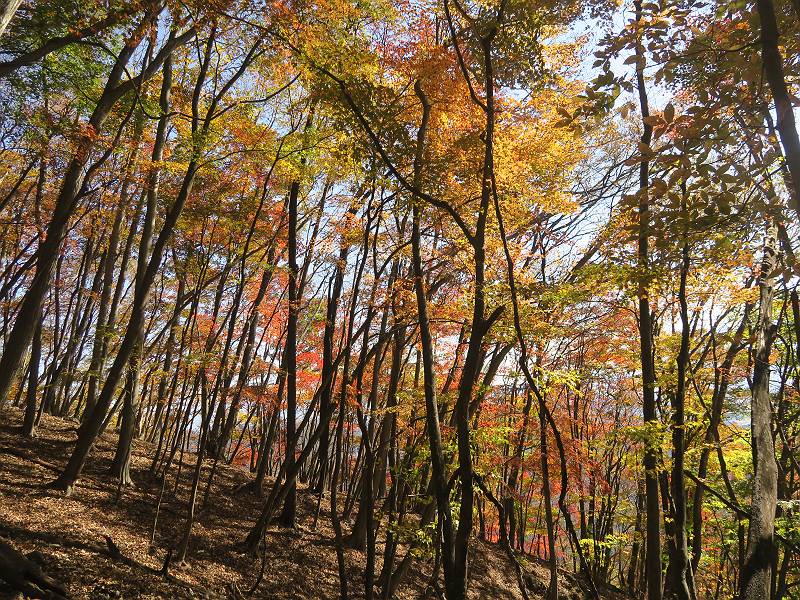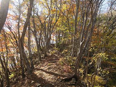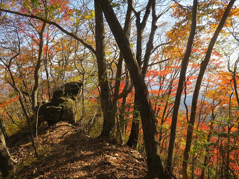 | 山行日 2024年11月12日 晴れ 単独 コース 駒岩(R353路肩駐車スペース)→駒岩の水場→石尊山→駒岩の水場→駒岩(往復5.5km、標高差603m) 高ジョッキから1時間ほどかけ紅葉の名所石尊山登山口に着く。軽食をとって10:02出発する。 集落の間を抜け、杉林の中の急坂をしばらく進むと、 小さな鳥居をくぐり広葉樹の急斜面に出る、道はジグザグしながら高度を上げていく。 真っ赤な紅葉を期待していたがハズレ、早いのかなあ。 でも高度とともに紅葉が増えてくる 11:06,水場 道は沢の真上を横断する、足元注意 この辺に来ると赤色が徐々に増す コアジサイの黄葉 コアジサイ 真っ赤だ、この辺は期待通り 石尊山山頂 11:45-12:04 西の高田山 榛名山 赤城山 往路を戻る、上部の紅葉は奇麗だ コアジサイの黄葉 12:22、水場 12:34、鳥居 12:56,駐車場着 総所要時間は、2時間44分、水場を過ぎて間もなく、山頂直下まで、紅葉のまあまあ見られるところがあった。 8080221の雑記帳(続)へ 記録一覧へ |