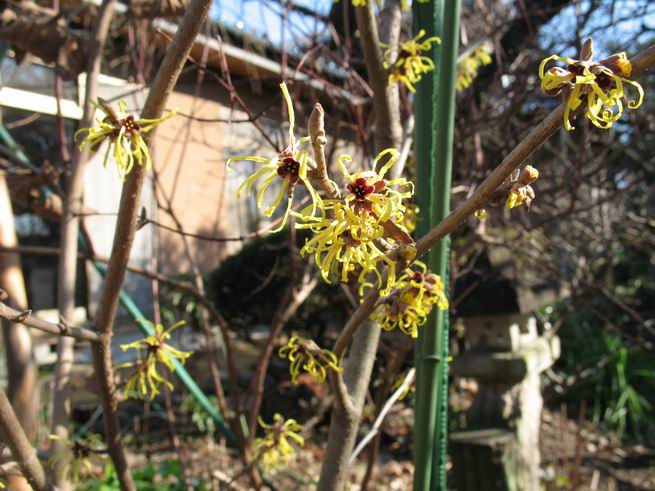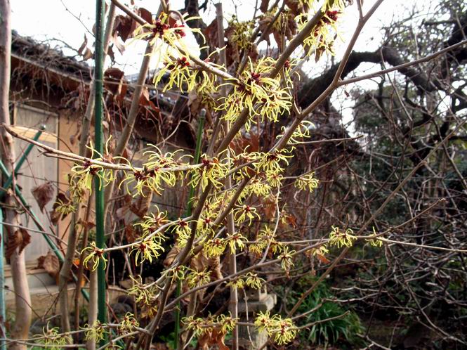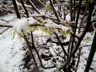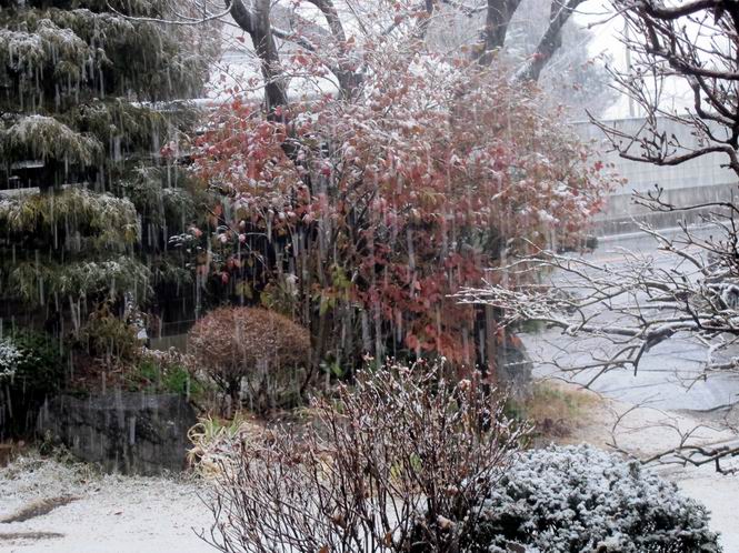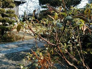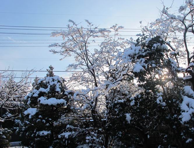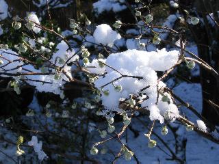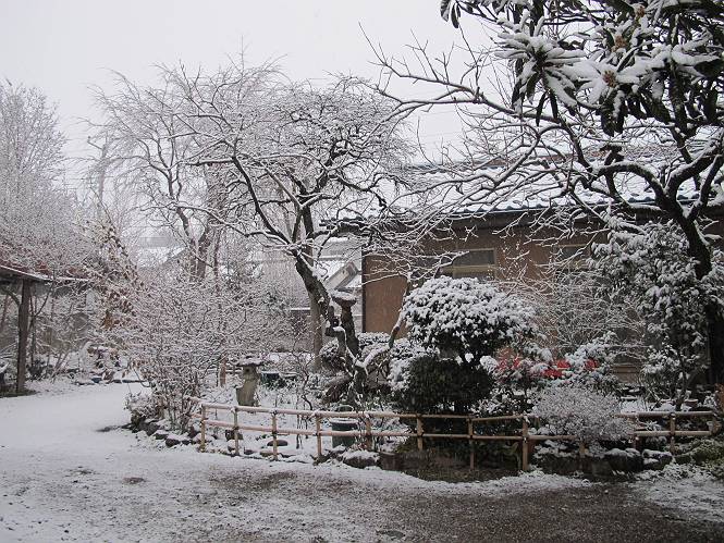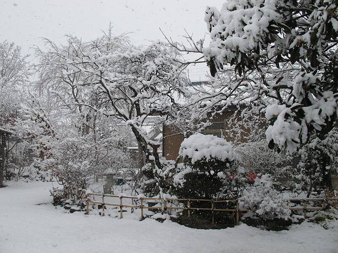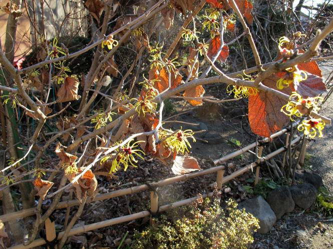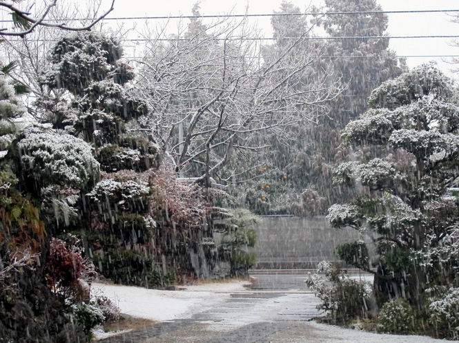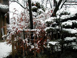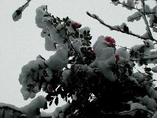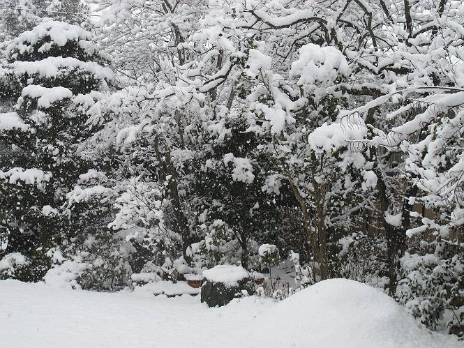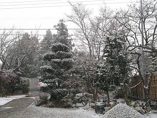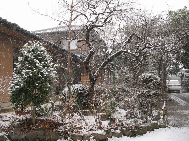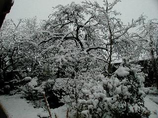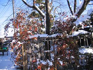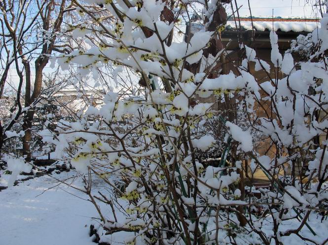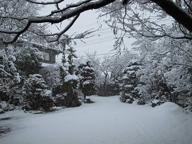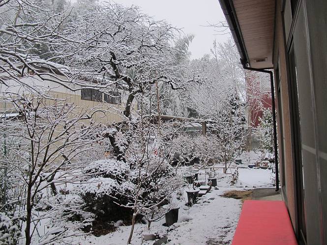 | 冬冬冬冬冬冬冬 2001〜2012(2/29)年冬 2012(12/1)〜2014(2/28)年冬へ 2012年2月29日 この冬は2,3度薄っすら白くなった程度でしたが、本日、早朝から降り出した雪は、小庭を真っ白に包み込みました。しばらくぶりに見る雪景色、新鮮に見えるなあ。6:40はほんの薄っすらでしたが、10:20には積雪12cm、久しぶりの大雪です。 【10:20】 【6:40】 2012年2月26日 シナマンサクに遅れること2週あまり、アカバナマンサクが開きました。幼木ですが、大きめなしっかりした花をつけてます。寒い、寒い、と言っても春ですね、木の芽は膨らみ、サンシュユの蕾は先端が黄色くなってきました。庭の角でオキナグサの花芽が伸びはじめました。 アカバナマンサク アカバナマンサク ロウバイ ロウバイ 2012年2月18日 やっと福寿草が咲き出しました。この冬の寒さは植物にとっても厳しいんでしょうね。日中の日差しは強くなったような気がしますが、昨日の朝、今朝も、ほんの薄っすらですが雪が積もってました。紅梅、八重咲きのシダレ梅はまだまだ先のようです。 福寿草 シナマンサク、枯葉も少なくなりました 2012年2月3日 明日は立春ですね、この1週間、特に冷え込んだようですね、31日の朝の気温が−5℃でしたよ。花の乏しいこの季節、遅咲きのロウバイがやっと1/3ほど開花しました。空の蒼さに映えて輝いてました。まだ日本海側には大雪、雪崩注意報が出ているとか、心配ですね。降らなくても、降り過ぎても生活に影響が出てしまいますね。 やっと3分咲きになったロウバイ 光線の関係で鮮明さがイマイチですが、こんな感じの小木です。 マンサクがいくつか咲き出しました、昨年から比べると遅いですねえ。 2012年1月29日 例年ですと立春にはチラホラ咲いているフクジュソウですが、まだ開花までには1週間はかかるでしょう。今年は遅いですね。やっと見頃を迎えたロウバイを撮ろうとしたら足元にナメコの株、表面はちょっと乾いているようですが、食べられるかな。 フクジュソウの花芽、まだ1週間以上かかるかな。 ナメコ一株、凍っているようだが食べられるかな。 2012年1月19日 1ケ月ぶりの更新となってしまいました。ロウバイといいますと、12月中に満開を迎えるところもあるようですが、やっと葉が少なくなって、チラホラですが咲き出しました。植えてある場所が比較的暖かいのでしょうか、それとも? 落葉を掻き分けてみますと、福寿草の蕾が大分膨らんでました、もうすぐ大寒ですね、立春もそこまで。 やっと咲き出したロウバイ 黄葉した葉を残すロウバイ 2011年12月14日 12月もあっという間に真ん中まで来てしまいました。寒暖の激しい師走、紅葉の残る小庭に出てみました。バイカツツジの紅葉です。上のガクアジサイは霜にやられ黒く変色してます。下の緑は洋物のシャクナゲです。季節の変化を感じますね。 バイカツツジの紅葉 バイカツツジの根本にイカリソウの紅葉、その奥の紫色のイカリソウは真っ青です。点々とマンリョウの若木 イカリソウの奥にやっかいもののカリンの実が積んであります。利用したのはほんの2,3ケでした。 ブルーベリーの紅葉です。1月の中旬まで見られます。 浅間の石に植えたミセバヤの紅葉です、緑はシノブでこの種は春に落葉します。 岩に植え込んだオカメナンテンです、真っ赤になりました。 カンアヤメが咲き出しました。 昨年より1ヵ月半も早いんです。 バラ、また咲いてます。色が薄くなりましたが、花の少ない季節、キレイですね。 2011年2月27日 2月もあと一日、やっと我が家の紅梅が咲き始めました。幼木の枝垂れですが、花が大きく濃いピンクが寂しい庭を引き立ててます。下のカンアヤメが見上げてました、「こっちも見てよ」、って。 枝垂れ梅(紅梅) アップでもう一枚 ミスミソウ(鉢物です) ミスミソウ フクジュゾウ、茎が伸びてしまって末期ですね、落花も間近でしょう 2011年2月21日 マンサクの仲間って沢山あるんですね。マンサク、シナマンサク、トキワマンサク、ニシキマンサク、ハヤザキマンサク、ベニバナトキワマンサク、アカバナマンサクなどなど。良く調べていくとややこしくなってしまいます。当庭の葉が落ちないで咲くマンサク、と書いたのはシナマンサクのようです。 アカバナマンサク アカバナマンサク 2011年2月15日 3度目の雪が降りました。夜半過ぎには止んだようです。庭はグショグショ、梢の雪が頭にボトン。朝日に照らされた樹々が輝いてます。フクジュソウも日差しを浴びて開きました。春はすぐそこまで。 雪景色 綿帽子をかぶったマンサク マンサク フクジュソウ カンアヤメ 2011年2月9日 北陸、山陰の各地は豪雪で大きな被害が出ているようですね、雪解けが待ち遠しいことと思います。今朝方、太平洋岸を低気圧が通り、当地にあっては、やっと初雪となりました。春の淡雪というところでしょうか、沢山積もることはないでしょうが、季節のものですね。 6:30AM頃から降り出しました、当地では初雪です。 激しく降ってました7:30AM頃 