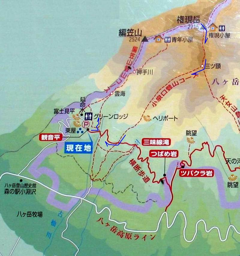 観音平の八ヶ岳横断歩道案内図を部分使用して青色で⇒を付記作成したものです。
