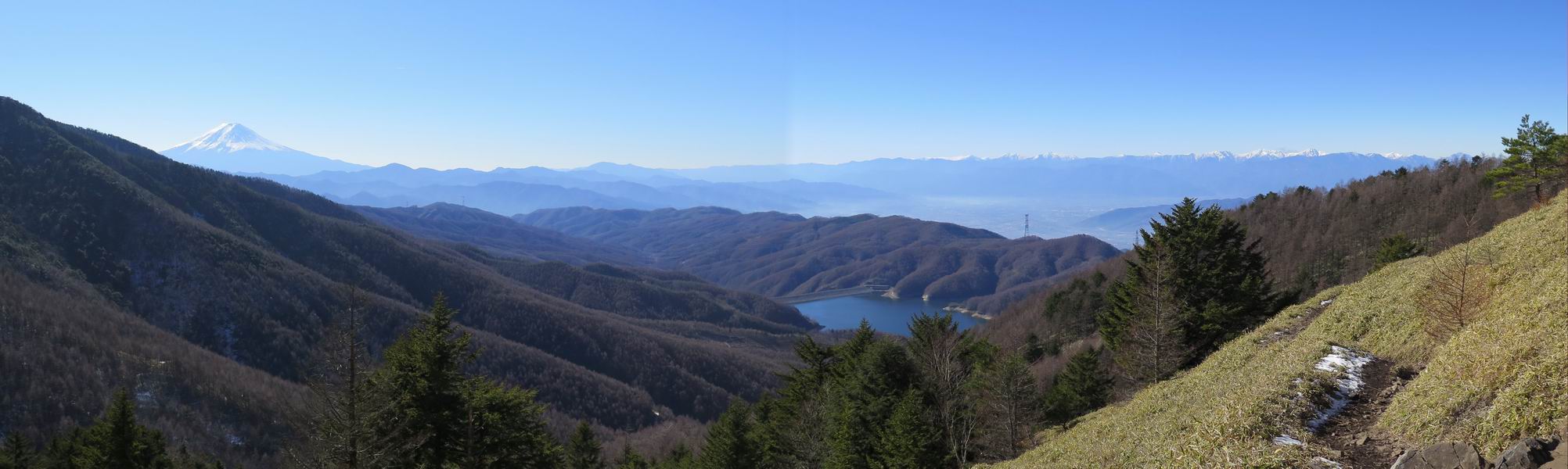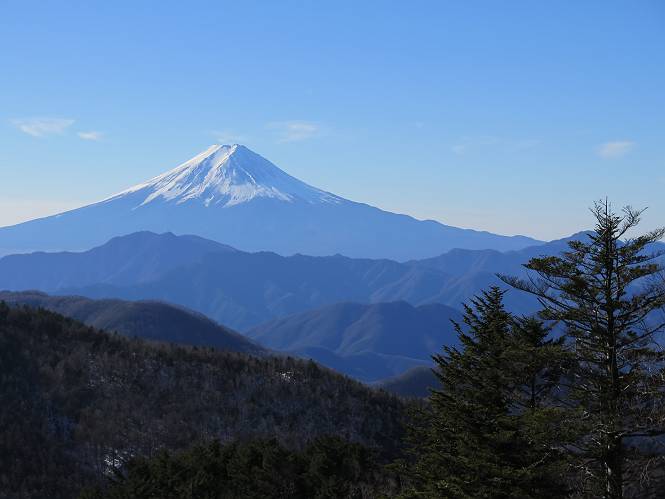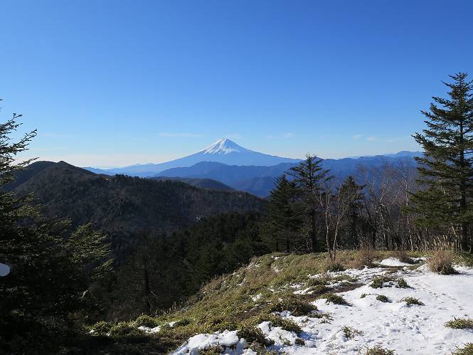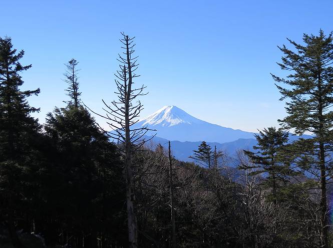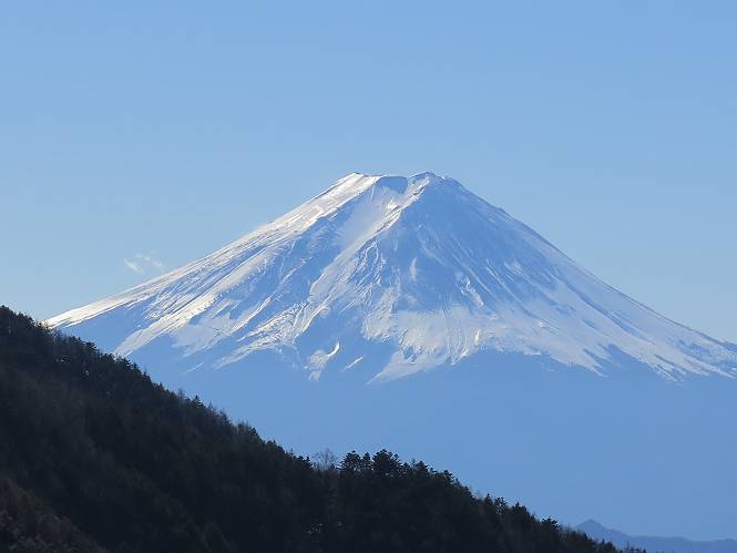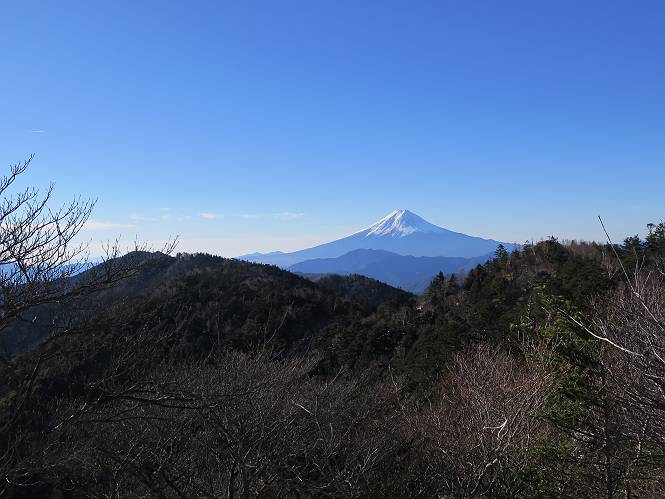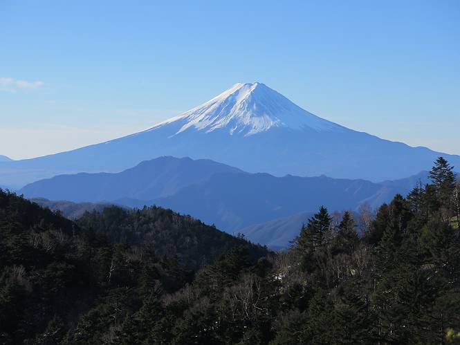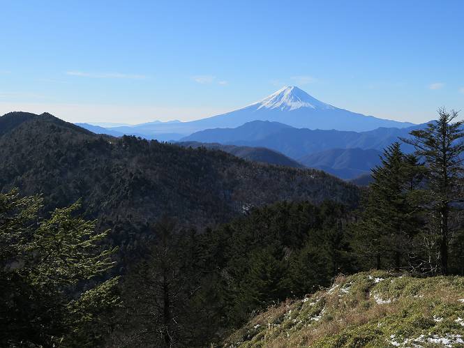 | 【後編:石丸峠→小金沢山→牛奥ノ雁ケ腹摺り山→小金沢山→石丸峠→上日川峠】 前編へ戻る 石丸峠からトラバースぎみに緩やかに上り、7:44牛ノ寝通りを左に分ける。短い急坂を直進すると広々した天狗棚)に出る、標高点の1957のようだ。振り返ると熊沢山&大菩薩嶺、熊沢山の防火帯の雪が、いかにも「ここからこっちは東京都の管理下じゃ、・・・・・」、と告げているよう。ちょっと下って8:01狼平へ出る、ここから小金沢山まで、小さいアップダウンが数ヶ所あるが、展望はない、8:41-8:59小金沢山。小金沢山からの富士山、何度見ても良い景色だ、東奥多摩から丹沢の展望も雄大な眺めだ、ゆっくり休憩しよう。 石丸峠から緩やかに上ると、 牛ノ寝通りを左に分け、直進の短い急坂へ 広々した天狗棚(標高点1957)に出て、振り返ると熊沢山&大菩薩嶺 南東には、これから向かう狼平を介して、小金沢山、牛奥ノ雁ケ腹摺り山を展望する 天狗棚から南アルプス 同、丹沢山塊と左に相模湾 同、南アルプス展望 画像クリック拡大 左から仙丈ケ岳、駒ケ岳 左から農鳥岳、間ノ岳、北岳 左から荒川岳、蝙蝠岳、塩見岳 左から上河内岳、聖岳、赤石岳、荒川岳 下って、笹原へ、 真ん中辺に狼平の道標あり 笹原の南端から小金沢山への上りとなる 小さいアップダウンが4,5ケ所あり 目印を見ながら樹林帯の中の道を進む、山頂まで展望なし 小金沢山山頂、展望良好、南アルプスは枝間から辛うじて 小金沢山山頂から富士山 小金沢山山頂から雲取山〜丹沢山塊〜 画像クリック拡大 丹沢山塊 筑波山遠望 雲取山 鷹ノ巣山 大岳山 ここから登山道は、南に少し下って左に弧を描き、樹林帯を抜ければ牛奥ノ雁ケ腹摺り山の山頂である、9:35-9:54。素晴らしい富士山に、付け加える言葉は不用、見入るのみ。居合わせた2名、一名は上日川からピストン、一名はこの直下の林道から最短で上がってきたようだ。そして私、ともに本日の最終ポイントを牛奥ノ雁ケ腹摺り山としている。残念なのは南アルプスが枝間からでないと見えないことだ。小金沢山も山頂からは南アルプスは見えないが、ちょっと南から甲斐駒ケ岳〜聖岳まで一望できる。 富士山を眺めながら牛奥ノ雁ケ腹摺り山へ 少々、樹林帯を抜ければ 牛奥ノ雁ケ腹摺り山山頂 牛奥ノ雁ケ腹摺り山山頂からの富士山 手前は三ツ峠山、御巣鷹山、木無山、本社ケ丸 山頂南西に林道への道あり、最短で来られるとか 山頂を下って、 山頂を後に、往路を戻り、10:27小金沢山、11:01狼平、11:17牛ノ寝通り分岐、11:22石丸峠、行き交うハイカーの数40-50人、素晴らしい展望に会う人、皆笑顔だった。 樹林帯へ、時々ハイカーと会う、満足そうな顔・顔・顔 小金沢山北側斜面、一部凍結あり、要注意 テープを確認しながら・・・ 石丸峠に戻りました 石丸峠から熊沢岳南斜面をトラバースして、最後の富士山&南アルプスをカメラに収め、カラマツ林、雑木林を下って11:48林道へ出て、11:51再び林内へ、緩やかな道を進めば、12:00小屋平でバス停のある県道に出る。ここから山間で2つの渡渉、ちょっと上り返せば、上日川峠に出る、12:29。 小金沢山(&天狗棚)と富士山 陽ざしを受けて、富士山の左斜面が光っていた、凍結しているのかな? これが最後、富士山&南アルプス 画像クリック拡大 聖岳、間ノ岳に雲が・・・ 熊沢岳南斜面をトラバースして、カラマツ林から雑木林へ 急坂を少々下って、 林道へ 右手に進むと直ぐに左に入る道あり、 下って、間もなく 小屋平で県道に出る、 バス停あり ここからは緩やかな下り、登り ハイク用コース分岐あり、上日川峠へ直進 渡渉あり、石をポンポンポン もう一つ、ポンポン ウラジロモミの美林を抜けると 上日川峠に出る 総所要時間は、7時間42分、全般は強風と寒さに悩まされたが、小金沢山手前で風は止み、気温の上昇とともにグシャグシャ道に足をとられたが、美しい富士山に大満足の山行だった。食糧、水、雨具&防寒具、アイゼン等背負い込んだが、これは保険みたいなものだ。 前編へ戻る |