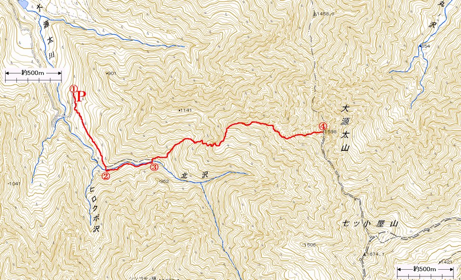 @林道終点の駐車スペース、登山口 A鉄の足場を利用した橋 Bトラロープを伝って渡渉 C大源太山山頂