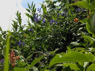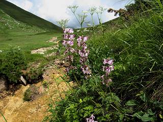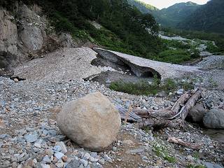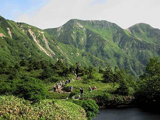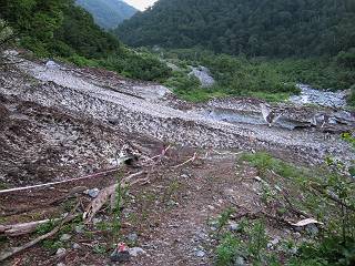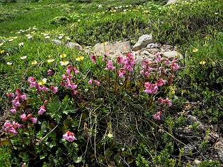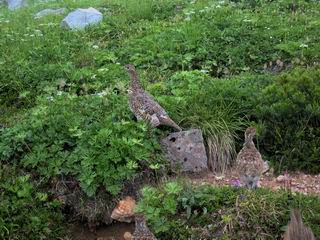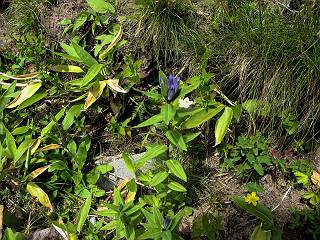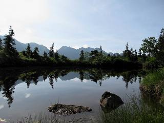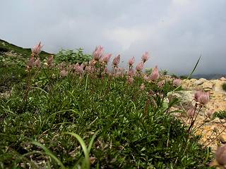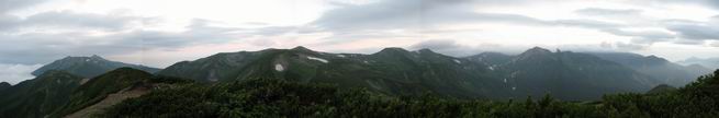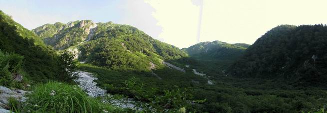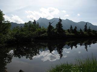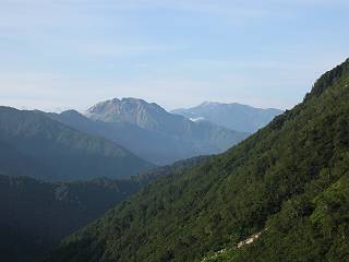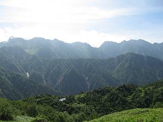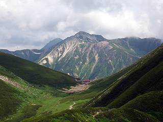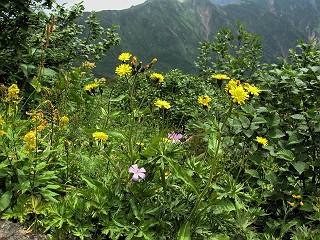 | 蒲田川の河川敷に沿った無料駐車場を3:40出発、トンネル状になった真っ暗な道路を抜けると、下限の月が東の空にわずかに輝いていた。林道に入り若干勾配を増していく、総重量17kgほどになろうか、ザックが腰にくい込むようだ。薄明るくなった頃、穴毛谷の工事用の道を左に分け、左俣沢に沿って進む。予定通り歩けば帰路下りて来る笠新道入口を5:00通過、ここまで来てやっと体も記憶を取り戻したようだ、ほどなく人声響くワサビ平小屋に到着小休止、5:12。帰る人と向う人、どの顔も山に溶け込んでハツラツとした感じだった、冷たい沢の水で喉を潤しザックを再び背に。 ここを出ると、間もなく林道と分かれ、雪の残る河原をマークに沿って迂回し石畳の小池新道に入って、勾配を一段と増す。下る数人のグループだろう、秩父沢で腰を下ろし、日焼けした顔に笑みがこぼれていた。時々振向いては西穂、焼岳、遠くの乗鞍の山容に、この稜線の光景を浮かべていた。シシウドが原で大きく北東方向に回りこみ、8:10鏡池着。久々に見る槍・穂の稜線に出るのは溜息、逆光と薄い雲にシャープさを欠くが、池のまわりのシラビソがその分カバーしてくれ、まずまずの光景だ。山の案内書やネットで見、あまりにも知られた景色であるが、現実に目の前に見たときの感動は大きく秤がない。丁度7年前、どしゃぶりの木道を、連れのYさんと、もくもくと歩いて夢物語に終わった山行があったからだ。 左俣谷の雪の残る河原を迂回 焼岳、西穂の山頂部が顔を出す シシウドが原付近 振向いては焼岳、乗鞍岳を眺め一息いれる ミソガワソウ 鏡池、逆光の槍・穂の峰々を湖面に映す 槍〜キレットまで 穂高 8:20鏡池山荘着、また小休止。30,40人行き交う山人が、名峰を茶菓に思いを語り、空腹を満たしているようだった。ここからまたジグザグした急登となる、いささか疲労感あり、眠気もさす。あえぎながらの稜線まで標高差300m強、出逢った花たちに「ゆっくり私を見て行って・・・・」、つい立止まってはカメラを向ける、9:35弓折乗越着、小休止。 鏡平小屋付近から槍ヶ岳(左)、弓折方面から下ってきた団体さん 登山道沿いには、ウサギギク、ニッコウキスゲ、ミヤマリンドウがいっぱい 眼下に鏡平、槍・穂の峰々を眺めながら高度を稼ぐ 弓折乗越、左が弓折岳2588m 乗越から見る槍・穂の稜線、眼下に鏡平 稜線から見たパノラマ、左が笠ケ岳、中央が双六岳と三俣蓮華岳、三俣山荘が間にあって右が鷲羽岳 双六岳 槍の穂先も雲に覆われそう ここからしばらく展望と花々を楽しみながら、小ピークを5,6つアップダウン、ミヤマトリカブトが一際鮮やかにお花畑を飾っていた。P2622を越え、小屋を正面に見ながら、シフトダウンしながら下ると双六小屋に着く、11:20。小屋の蛇口で思いっきり水を飲んで、双六岳の南斜面に取り付く、ハイマツに被われた道をしばらく歩き、尾根コースと巻道に分かれる、11:55。どちらを通っても三俣山荘への時間はあまり変わらない。明日戻る時に尾根を通るとして、花畑の広がる巻道に入る。 山並にはガスがかかり、花だけが眠気から我が身を救ってくれたようだ。巻道といっても単純な水平道ではない、時には激しくアップダウンを、また浮石の多いザレたような岩場を通ったりする。明らかに双六小屋からのペースはダウン、倍近くかかっているようだ、でも時間的には全く心配がない、だから余計に。ダンダン霧が濃くなって、もうそれそろ三俣蓮華岳からのルートに合流してもよいのだが、と思っていた時、先方に女性が3人いて、「ライチョウだ!」の声。見ると仔沢山1,2,3・・・・、10ピキいるみたい。母鳥に見守られて、高山植物を啄ばんでいた。母鳥が声を発すると、一斉に仔鳥が同じ行動をとる。その姿が、何とも言えない、可愛いの一言。「この一家、人間社会だったら表彰ものだね」って言っていた、13:37合流点(三俣峠)、下って14:00三俣山荘のテント場着で本日の山行を終えた。 クルマユリ ハクサンイチゲ ミヤマアキノキリンソウ オヤマリンドウ ミヤマトリカブト ミヤマコウゾリナ イワギキョウ ヨツバシオガマ トウヤクリンドウ エゾシオガマ 中央が鷲羽岳と双六小屋、左に水晶岳 弓折岳を振り返る ハクサンイチゲ アオノツガザクラ ミヤマダイコンソウ チングルマ 白い花、チングルマ チングルマの綿毛 オンタデ コイワカガミ ミヤマキンバイ ミヤマリンドウ 「集合!」って感じかな、母ライチョウ 「まだたりないぞ、早く、早く!」、石の上の母ライチョウと仔鳥たち 三俣蓮華岳と巻道の合流点(三俣峠) 本日の目的地三俣山荘と後に鷲羽岳 駐車場からの所要時間は、10時間20分、後半はバテ気味だったが、荷物重量のハンデを考えると、こんなところかな。本日の見所は、鏡池と弓折尾根から三俣蓮華岳からの合流点までの花、ライチョウとの出会いは偶然。近年、激減しているというライチョウ、無事成鳥になって欲しいな。天敵の鷹の餌食にならないように、願うの