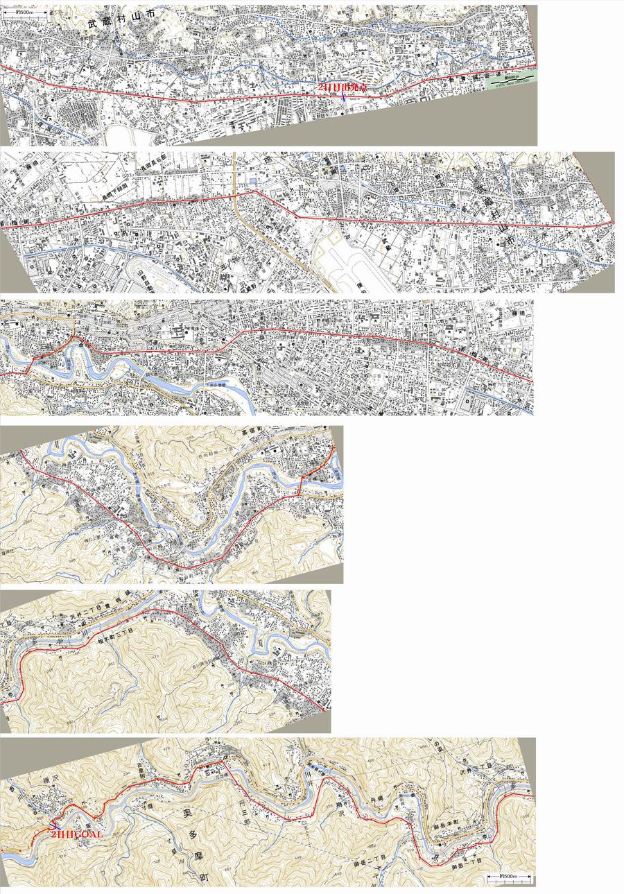 2日目のコース概略図です、上から順に右から左へ赤線の通り進みます。 戻り コース:立野東(上北台駅入口)→(新青梅街道)→瑞穂町→青梅市民会館前→畑中1→(吉野街道)→古里 →(青梅街道)→鳩ノ巣 国土地理院1/25000地形図に赤、青色で付記