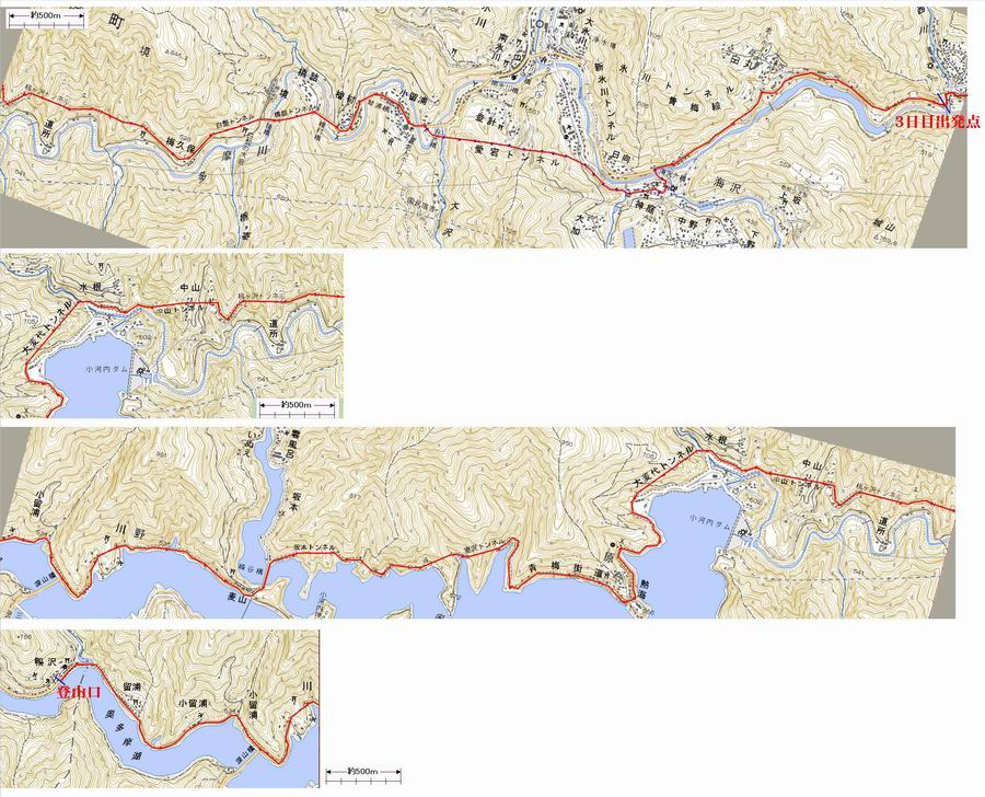 3日目のコース概略図(鴨沢の登山口まで)です、上から順に右から左へ赤線の通り進みます。 戻り コース:鳩ノ巣→(青梅街道)→梅沢大橋→愛宕トンネル→愛宕大橋→(青梅街道)→鴨沢登山口→堂所→ブナ坂 →小雲取山→雲取山→雲取山荘 国土地理院1/25000地形図に赤、青色で付記