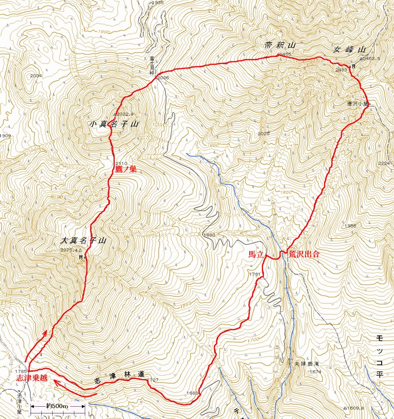 コース概略図  国土地理院1/25000地形図に赤色で付記  戻り
