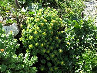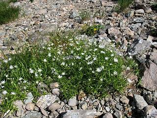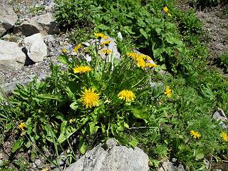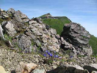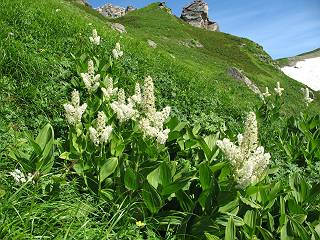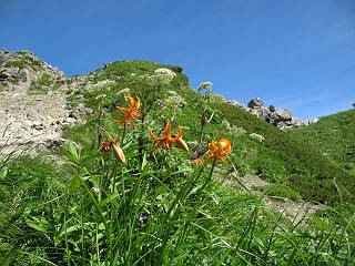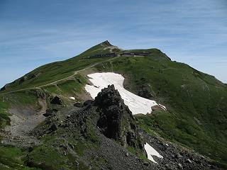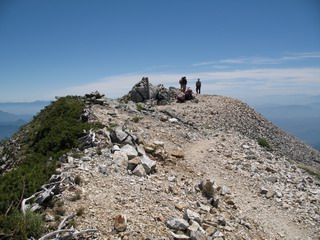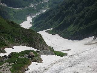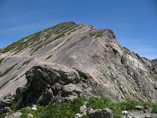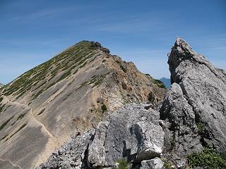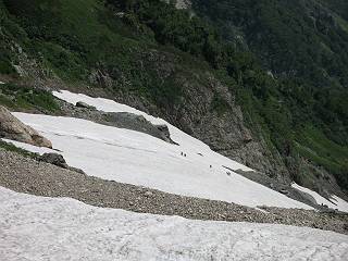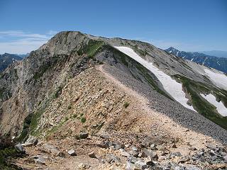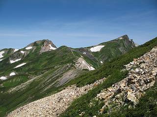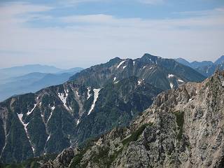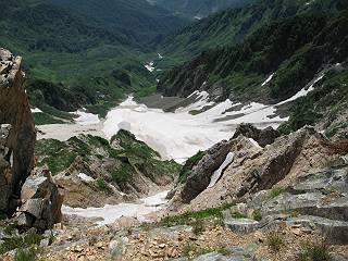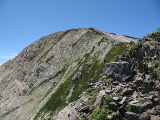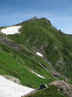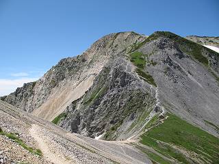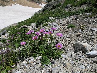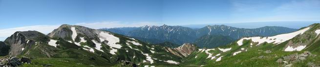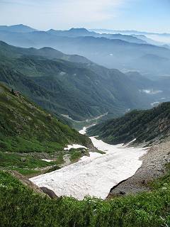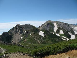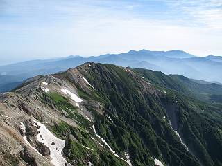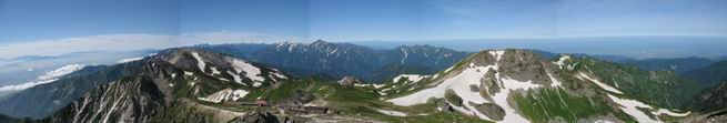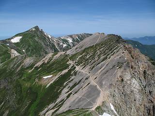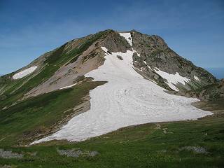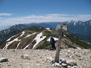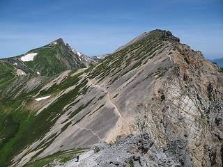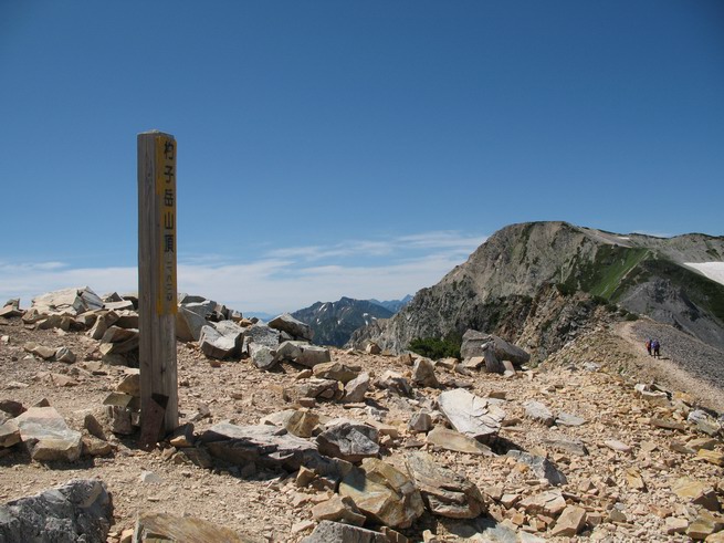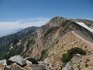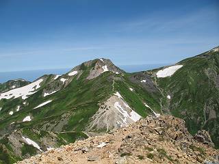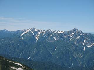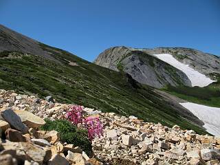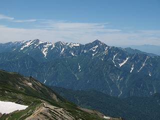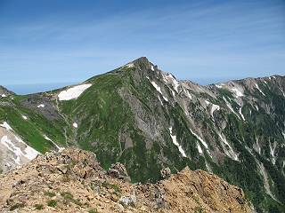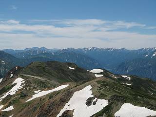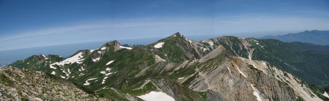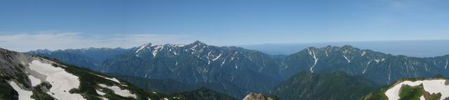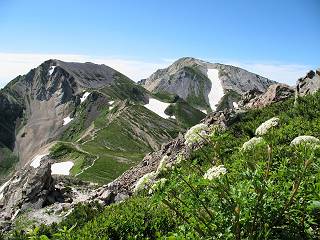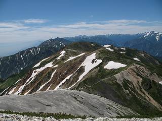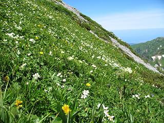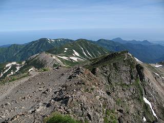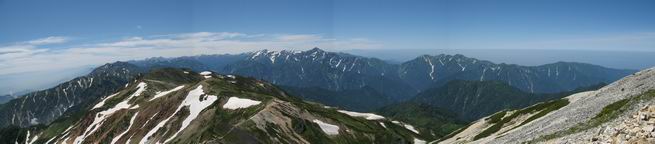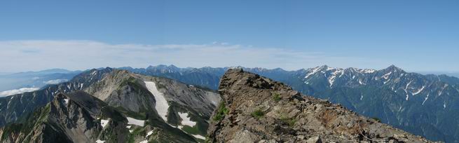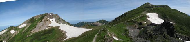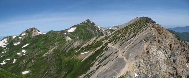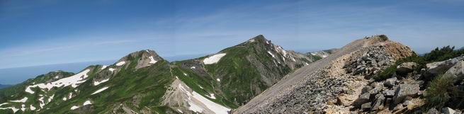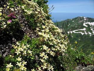 | sub3-337-1 白馬岳→杓子岳→鑓ケ岳 猿倉→白馬岳(ページTOP)へ 鑓ケ岳→小日向のコル→猿倉へ 白馬岳山頂のながめ、これは説明するまでも無い、何しろ富士山から日本海まで、北アルプス、頸城山塊、白山など等、抜群の眺望。歩いた頂を毎度の如く、指差し呼称。でも、北アルプスの、黒部五郎岳と槍ケ岳の間は、双眼鏡の世界で裸眼では無理だった。まだ踏んでない北側の雪倉岳と朝日岳、これは歩いてみたい。まだ、あるある、剱岳の北側の猫又山、毛勝山、剱岳と重なっている奥大日岳、いっぱいあるなあ、8:30山頂をあとにする。 小蓮華山2769m、後が火打山&妙高山 朝日岳(左)&雪倉岳 三つのヤリが並ぶ、鹿島槍ガ岳、鑓ケ岳、槍ケ岳 立山・剱、猫叉・毛勝 杓子岳、鑓ケ岳と奥穂、槍、・・・・・・大汝、剱 鷲羽・水晶・黒部五郎岳、立山・剱 黒部五郎岳、立山〜剱 杓子岳、鑓ケ岳と右に旭岳、後は槍〜剱、猫叉・毛勝 上の画像の間を拡大、槍〜剱、猫叉・毛勝、手前は村営宿舎と丸山 大雪渓分岐、8:45、丸山山頂、8:50-9:00、時間的には順調である。白馬岳下山11:00をタイムリミットに予定していた。ここまで南に下がると白馬岳の格好が良い、先端の尖がり、ずっしりした山体、小屋もあまり目立たなくなる。杓子岳、鑓ケ岳も手の届くようだ。旭岳も白馬岳のコブのようであったが、独立した山体に見えてきた。花々を探勝しながら下って、眼下の大雪渓を眺める。ざっと70,80人はいそうだ。まだまだ間隔があいているぞ、これからかな? 登り返して10:10、杓子岳山頂着、小休止。 大雪渓、村営宿舎の分岐点 同所から旭岳 丸山山頂付近から白馬岳 同、杓子岳、鑓ケ岳 丸山山頂付近から旭岳(左)と白馬岳 同、杓子岳、鑓ケ岳、後は槍〜剱、猫叉・毛勝山 槍〜剱、猫叉・毛勝山 イワヒバリ 雷鳥の親子、子は右上に一羽だけ写ってます。今の時期手のひらにのるくらい、小さくてかわいい 丸山付近から旭岳 同、白馬岳 同、杓子岳、鑓ケ岳 同、白馬岳 チシマギキョウと白馬岳 コバイケイソウと白馬岳 テガタチドリと白馬岳 杓子岳との鞍部付近から白馬大雪渓、真中の線が登山者の列 クモマミミナグサ タカネシオガマ チシマギキョウ コマクサ ハクサンチドリ ヨツバシオガマ ミヤマタンポポ イワギキョウ クルマユリ コバイケイソウ 杓子岳との鞍部付近から白馬岳 同、白馬大雪渓 白馬大雪渓の上部、横断中の登山者 山頂直下でコマクサと杓子岳山頂 ここの眺望も素晴らしい、白馬岳と小蓮華山の稜線、杓子沢が眼下に一望(?)でき、南の唐松岳〜鹿島槍ケ岳がはっきり見えてくる。三山に共通しているのは、南側斜面に植物の少ないことだ。ここでも到着時は空っぽ、山並を見渡せば、数人が点々と歩いているのみ。混んでくるのはこれからであろうか、まだ10時をまわったところだし。 杓子岳山頂、右が鑓ケ岳 杓子岳山頂から白馬岳 同、旭岳と手前に丸山が重なる 杓子岳山頂から旭岳、白馬岳、小蓮華山 同、鑓ケ岳 五竜岳、鹿島槍ガ岳、手前に唐松岳が重なる 鑓ケ岳への道 山頂から杓子沢を見る、下から見上げるのも良いが 山頂を少し下って、左から旭、白馬、杓子 同、杓子岳 同、鑓ケ岳 鑓ケ岳との鞍部付近から旭岳、白馬岳 同、杓子岳 同、杓子岳 同、白馬岳と杓子岳 下って登り返すと、北側斜面にお花畑が開ける。今は、ハクサンイチゲとシロウマオウギに代表される、ミヤマオダマキが点々と色変わりで目立つ。道沿いには、アズマギク、イワベンケイ、ホソバツメクサ、岩場にはシコタンソウも咲いていた。 鑓ケ岳北側斜面のお花畑 アズマギク ミヤマオダマキ ハクサンイチゲ イワベンケイ シロウマオウギ シコタンソウ ホソバツメクサ アズマギクと鑓ケ岳山頂 眺望では南から見る杓子岳の岩体が険しく、東面の切り立ったところも三山共通である。杓子岳山頂から見えた礫の道は、歩きにくさを感じなかった。杓子岳の巻き道も、はっきりついているところをみると、利用者が多いのだろう。鑓ケ岳の肩のような場所に出て、西側から山頂に入る、11:15着。 旭岳、白馬岳、杓子岳 白馬岳、杓子岳 鑓ケ岳 鑓ケ岳山頂部 山頂分岐(肩) ここには5,6人いた、子供も1人、頼もしいことだ。ここまで来ると、白馬岳が象徴的に感ずる、高さがあり、格好も良いし、杓子と鑓の存在で白馬岳をいっそう引き立てているのかな。遠望する山に雲がかかってきた、上空は青空、カンカン照りであるが、あまり暑さを感じない。従って、水の消費も今のところ500cc以下。 鑓ケ岳山頂、2903m 南側稜線、天狗ノ頭、唐松岳、五竜岳、鹿島槍ガ岳へと・・・ 北側、杓子岳、丸山、白馬岳、小蓮華山、乗鞍岳と左に旭岳 南西方向、槍ケ岳〜剱岳、猫又・毛勝山 立山&剱岳 天狗ノ頭、後に奥穂、槍ケ岳、黒部五郎岳 杓子岳、白馬岳、小蓮華山 頸城山塊 白馬三山を踏んで、いよいよラストウオーク、大出原のお花畑が楽しみだ、11:36発。以下をクリックしてお進み下さい。 猿倉→白馬岳(ページTOP)へ 鑓ケ岳→小日向のコル→猿倉へ 