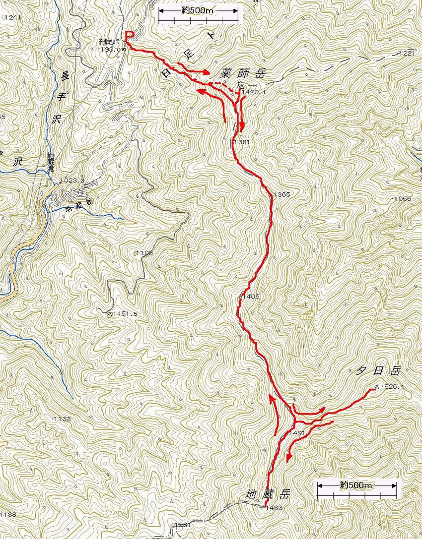 コース概略図 国土地理院1/25000地形図に赤色で付記 戻り