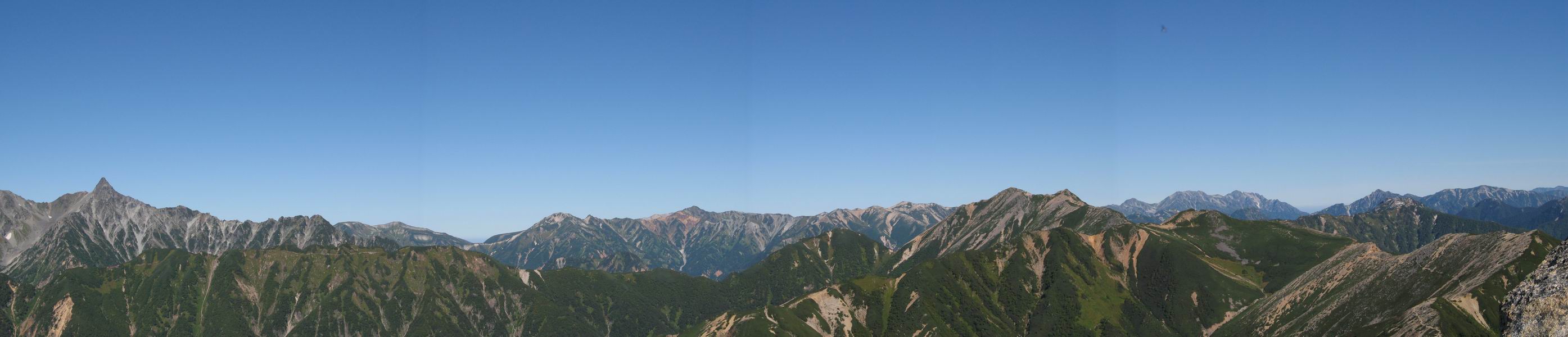 常念岳山頂より槍ヶ岳〜鷲羽岳、水晶岳、野口五郎岳、大天井岳、立山&剱岳、針ノ木岳(手前は燕岳)、蓮華岳