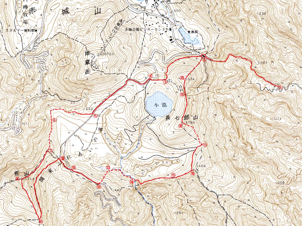 詳細図:国土地理院 1/25000地形図 赤城山に赤色で追記 戻り