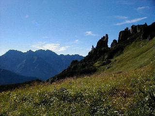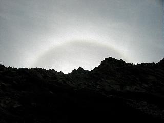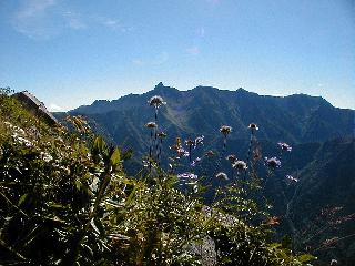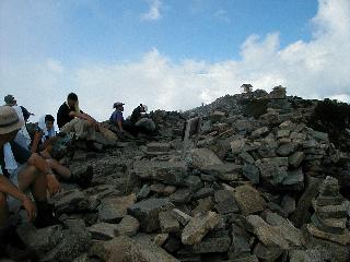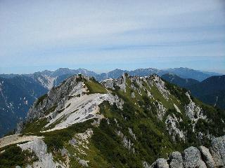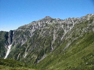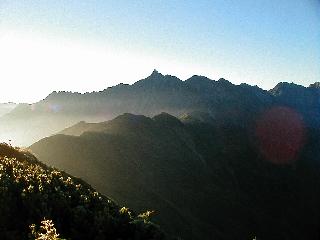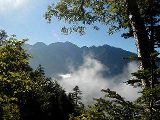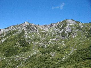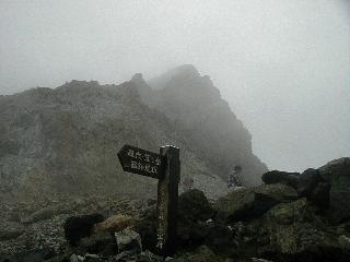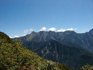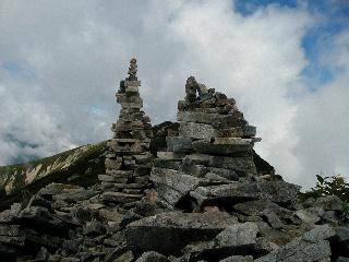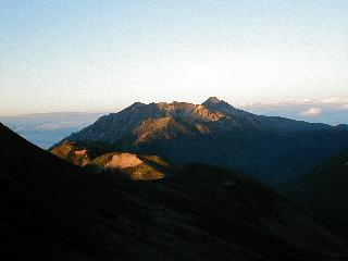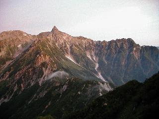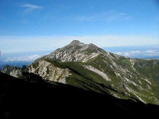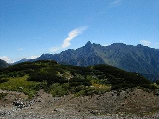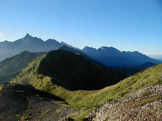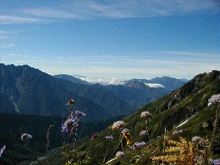 | 山行日 2001/8/17−8/21 晴れ 単独 コース 新穂高温泉→笠新道入口→拭戸岳→縦走路分岐→笠ガ岳山荘→笠ガ岳→笠ガ岳山荘(テント泊) →笠ガ岳→笠ガ岳山荘→秩父平→大ノマ乗越→弓折岳→双六小屋→双六岳→巻道分岐 →(巻道で)双六小屋(テント泊) →樅沢岳→左俣岳→千丈沢乗越→槍岳山荘→槍ガ岳→水俣乗越→ヒュッテ西岳→西岳→ヒュッテ西岳(テント泊) →赤岩岳→大天井ヒュッテ→大下りの頭→燕山荘→燕岳→燕山荘→合戦小屋→中房温泉 記録 1日目 新穂高温泉→笠新道入口→杓子平→ 拭戸岳→縦走路分岐→笠ガ岳山荘 4:30 5:46 10:10 11:51 13:30 笠ガ岳山荘 → 笠ガ岳→笠ガ岳山荘(テント泊) 13:45 15:00 2日目 笠ガ岳山荘→笠ガ岳→笠ガ岳山荘→秩父平→大ノマ乗越→弓折岳 4:45 5:45 9:34 10:00 →鏡平分岐→ 双六小屋 → 三俣双六分岐 →双六岳 →(巻道で)三俣双六分岐→双六小屋(テント泊) 10:30 11:45 12:25 12:45 13:22−13:45 14:30 14:45 3日目 双六小屋 → 樅沢岳 →千丈沢乗越 →槍岳山荘 →槍ガ岳 → 槍岳山荘 4:55 5:30−5:45 8:09−8:17 9:16 9:38−10:00 10:16 槍岳山荘 →ヒュッテ大槍→槍沢分岐 →西岳山荘 → 西岳→西岳山荘(テント泊) 10:35 11:12 12:35 14:15 15:00 15:45 4日目 西岳山荘→赤岩岳→大天井ヒュッテ→大下りの頭→燕山荘→燕岳→燕山荘 →合戦小屋 5:05 7:05−7:15 10:10 11:26 12:03−12:15 →中房温泉 13:50 この山行は、夏の北アルプスをゆっくり見ようということで計画した。大型でゆくりした台風が洋上にあるので気がかりだが注意しながら歩くことを自分に誓って早朝の新穂高温泉をスタートした。一番奥の有料駐車場を過ぎると、路肩に違法駐車した車のワイパーに、大きな赤い駐車違反のステッカーが挟み込んであった。お気の毒とは思うが、お金は取られたくない、道路はできるだけ歩きたくない、の気持ちはわかるけれども、一つのルールであるから守ってもらいたいものだ。笠新道入口で水を補給して、急坂のジグザグした道を登る、あたりはうっそうとした樹林帯の中であるが、ところどころ木の間から山並みを見え疲れを忘れさせてくれる。朝方雲が多かったが、今はすっかり晴れ渡り、槍穂高の主稜線、と焼岳乗鞍岳がくっきりと見えている。森林限界を過ぎると斜面一帯がお花畑となる、ソバナが元気に咲いていた。形を変えていく槍穂高の主稜線につい休憩が多くなる、次々と後続者が先に行く、下山の20代の若い女性に元気づけられる、この女性は単独行で25kgかついで8日目だそうだ、すごーい。出発してから6時間弱で杓子平についた。ドカーンとザックを背負ったまま寝そべる、気持ちいい。ここは笠ガ岳を谷の最深部を介して一望できるポイントだ。 杓子平から稜線に出るルートが持ち合わせの地図とかわっていた、従来は抜戸岳から西方に500,600m寄った所に出たが、現在は抜戸岳の山頂近くに出るようにルート変更されていた。稜線にでると、わき上がる雲で遠望はきかなかった、分岐から1時間弱ほど歩いて抜戸岩へ出た、溶岩ドームの真ん中が大きく避けたのであろうか、左右高さ3mほどの垂直の壁の狭いところを抜けていく。しばらくすると大きな岩がごろごろしたところへで、ここを登りきって笠ガ岳山荘に出た、新穂高温泉からここまで9時間要した。テントを設営して山頂に立つ、時々近場の稜線まで映し出すが、北アルプスの笠ガ岳の足元だけである。初めてここへ来たときは、雨の日で、クリヤ谷を上がってきたが、沢の増水でズボンまで脱いで渡渉し、頂上についても濃霧の中、時々笠ガ岳山荘が見える程度だった。それに比べたら、今日はマシなのだが。アチコチ電話して実況中継を行い天候の回復をまったが、夕日を期待できそうもないのでテント場へ戻る。 ![]() 槍・穂高の主稜線 槍・穂高の主稜線 ![]() 槍・穂高の主稜線 杓子平から笠ヶ岳 ![]() 杓子平から抜戸岳 抜戸岳山頂 ![]() 笠ヶ岳稜線の分岐 笠ヶ岳山頂 2日目、快晴の朝を迎えた、山頂からの展望はすばらしく、特に槍ガ岳と大喰岳の間から御来光は印象的だった。どうしても、槍・穂高の主稜線に目をもって行かれるが、その右の焼岳、乗鞍岳、御嶽山更に右へまわって北俣、黒部五郎、薬師、黒岳、祖父、鷲羽、双六・・・・のパノラマが雄大だ、山の上にいる特権だ。 笠新道の分岐まで来て西方を振り向くと、笠ガ岳が縦走路の正面にドカンとあぐらをかいているように見えた、実に雄大だ。 ![]() 笠ヶ岳山頂で、槍ヶ岳と大喰岳の間から御来光 笠ヶ岳山頂、背後は乗鞍岳 ![]() 縦走路から笠ガ岳 縦走路から穂高 ![]() 縦走路から槍ガ岳 縦走路から、マツムシソウを入れて槍ガ岳 ![]() 縦走路から、マツムシソウを入れて 穂高 縦走路から、マツムシソウを入れて 乗鞍方面 ![]() 鏡平分岐から槍ガ岳、手前が鏡平 鏡平分岐から鏡平のアップ 晴れ渡った空のもと、眺望に堪能しながら双六小屋へ、テント設営後双六岳を一回りした。昼を過ぎると雲があがり山の雄姿も損なわれる感じである。前回は飛ばしてしまった双六岳をゆっくりと散歩した。この