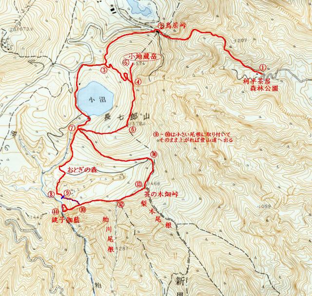 小地蔵岳、長七郎山、おとぎの森、銚子伽藍、茶の木畑峠近辺の地図