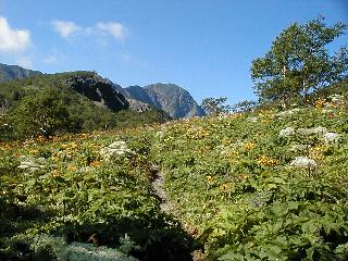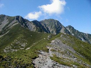 北荒川岳東斜面の巻道 ここまでくれば北俣岳分岐はもうすぐだ、右塩見岳