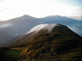 稜線越しに早朝の北岳と間岳 間岳のアップ