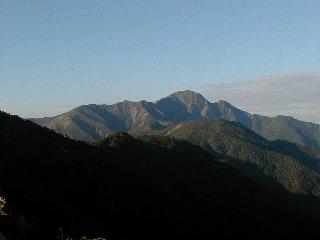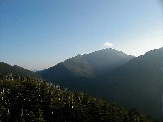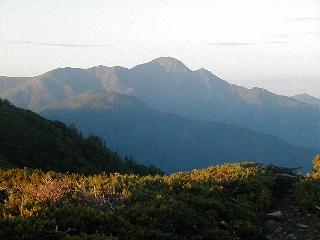 安倍荒倉岳から北荒川岳(手前)と塩見岳 安倍荒倉岳から間ノ岳、左の突起が三峰岳、左遠方の駒ヶ岳