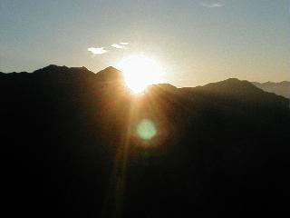 御来光、笠ヶ岳の右下から昇る 赤く染まった、武能岳、茂倉岳から谷川岳