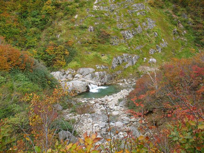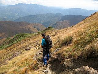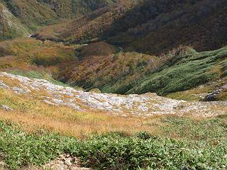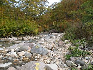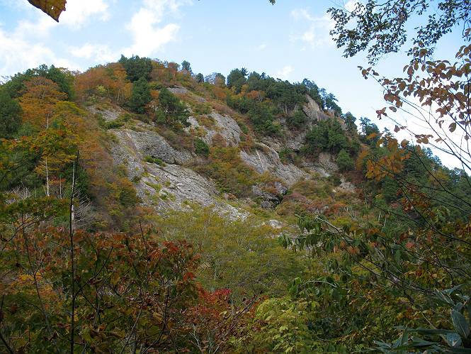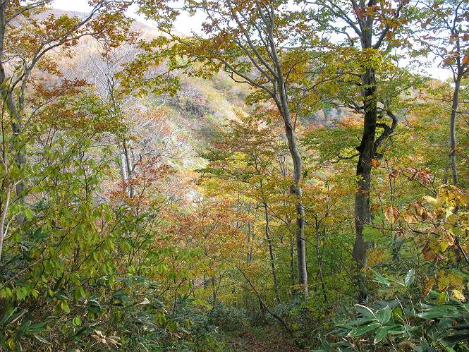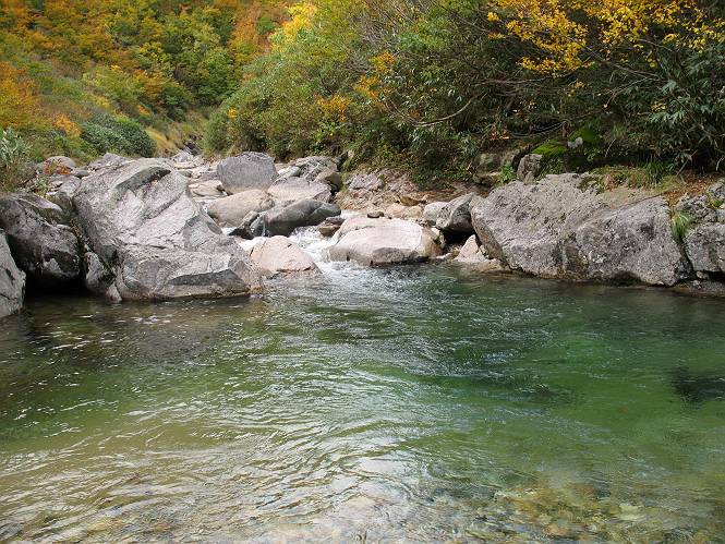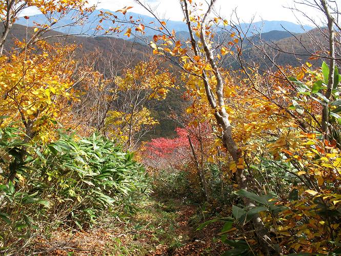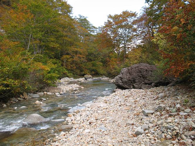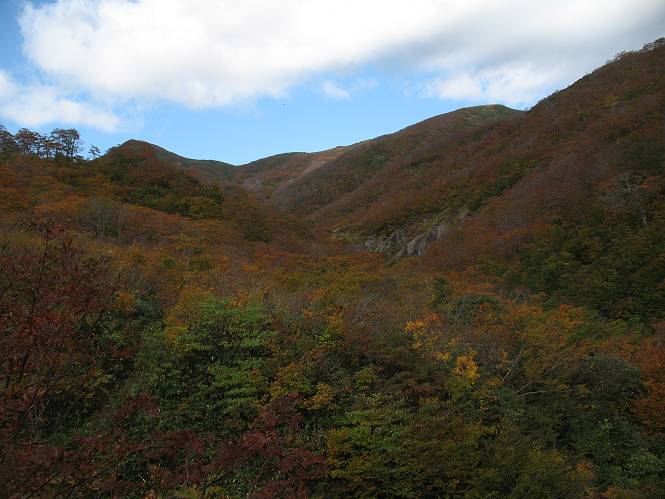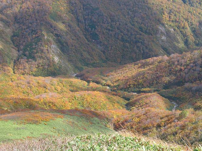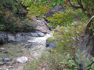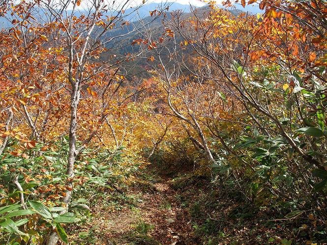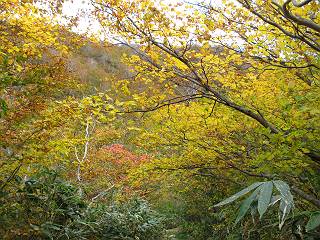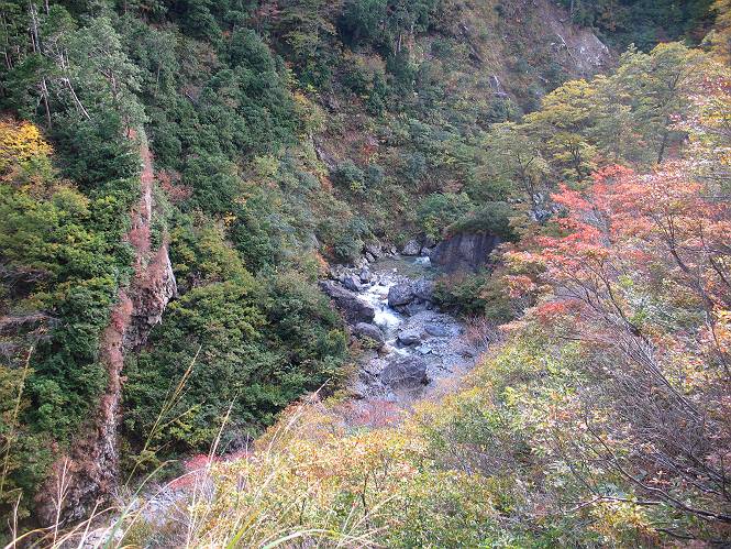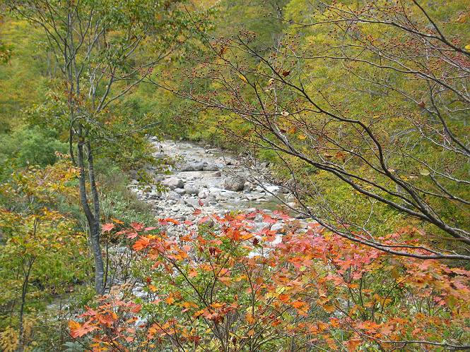 | sub3-467-3 後編:宝川へ下山 前編:土合橋Pから朝日岳へ 今の季節、コンコンと湧く水場を過ぎ、一面の草紅葉に見入る。よく見ると枯葉もあるのだが、そよ風に揺らぐ光景は季節の変わり目を感じさせる。大きな岩場を左に、右に白い削られたような露出した岩盤を見ると、下り坂がきつくなる。笹を刈り込んだ斜面、足元に気をつかう。東方向に張り出した尾根筋に向かうように左に反れながら下り、右に90度曲がって、潅木の間を真っ直ぐ下る。葉を落としたナナカマドやカエデが目立つが、当たれば真っ赤な紅葉の道になるのだとか。でも、残りものだろうか、赤、黄も徐々に濃さを増す、先方の斜面も赤茶色に染まっている。ブナ帯を抜け緩やかに右カーブして大石沢に出る、13:28。 【宝川分岐点〜大石沢出合い】 朝日岳東斜面の草紅葉 東方向に燧ケ岳を遠望 左下方に矢木沢ダム 南方向に上州武尊山 左にゴツゴツした岩場 右に白い大きく削られたような岩盤 紅葉の谷、宝川と大石沢 景鶴山と燧ケ岳、冬枯れの斜面が目立つ紅葉末期の峰 朝日岳山頂部を見上げる 急坂を真っ直ぐ下る、上方向を撮る 下方を撮る 紅葉の残る道 宝川を介した東斜面、右にカーブして 大石沢に出合う 沢筋と紅葉を眺めながら泥濘んだ道がしばらく続き、広河原でウツボギ沢を渡る、14:15。 【大石沢出合い〜広河原】 沢筋と紅葉を眺めながら泥濘んだ道が続く 上は黄色いトンネル 下はグシャグシャな道 イワナが遊ぶ大きな淵 広河原でウツボギ沢を渡る ここまで下ると、浅い紅葉となる。宝川の流れと岩場の紅葉が魅力的だが、渡渉点は要注意である。増水時、上りはあきらめて引き返せるだろうが、下りは難しいのではないだろうか。一昨日か昨日降って増水し、まだ安全にポンポンポンと渡れるほど引けてない。渡渉できそうな場所を探し、幸い靴を濡らさずに渡れたが、雪解けや梅雨時はキケンである。その不幸な証が、2,3箇所あった。渡渉点通過14:32、ここから斜面を上り、ダウン&アップを繰り返して進む、ほどほどの緊張感で見たが大きな滝も2,3ありそうだ。樹間からちらっと見えたが、渓谷をゆっくり見るだけでも価値ありそうな山道である、15:27林道終点、ゲート16:13着で予定のコースを終了する。 【広河原〜シャダンキ】 渡渉点比較的狭い場所 下流も・・・? ここで大石小石を飛び越えて渡った 左岸の渡渉点道標 日光白根山、錫ケ岳が見えると間もなく滝を下方に 林道際の滝 林道ゲート、番小屋が山に向かって左にあり 総所要時間は、10時間58分、天候に恵まれ眺望を堪能でき、紅葉もほどほどに楽しめたし、ペース配分もさすがtomoさん、疲労を感じないでコースを終了できた、感謝である。季節を変え、単独行したいが、ピストンでは? 前編:土合橋Pから朝日岳へ |