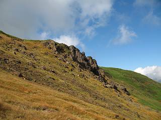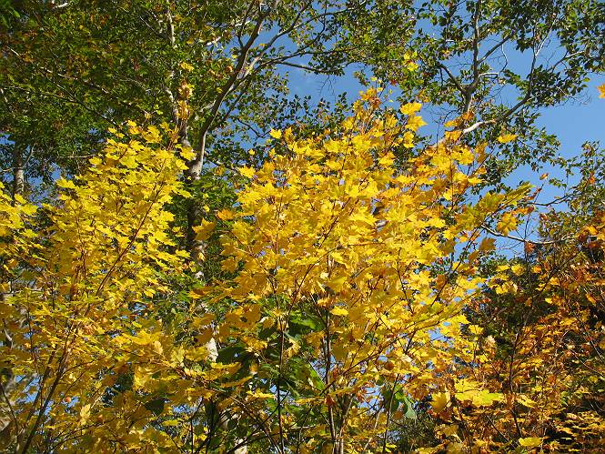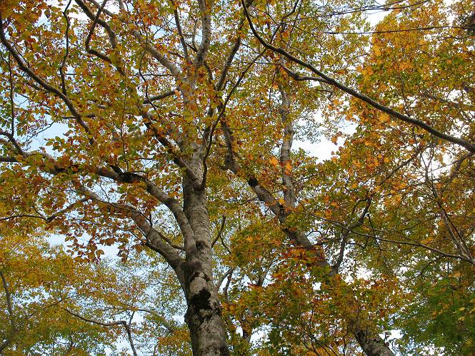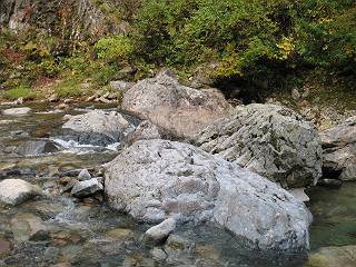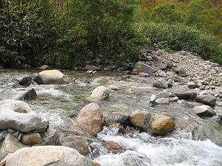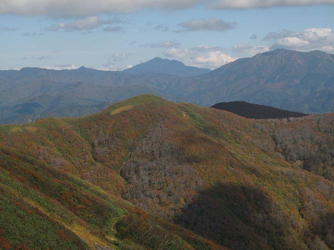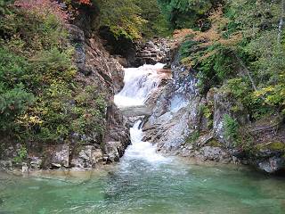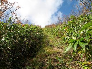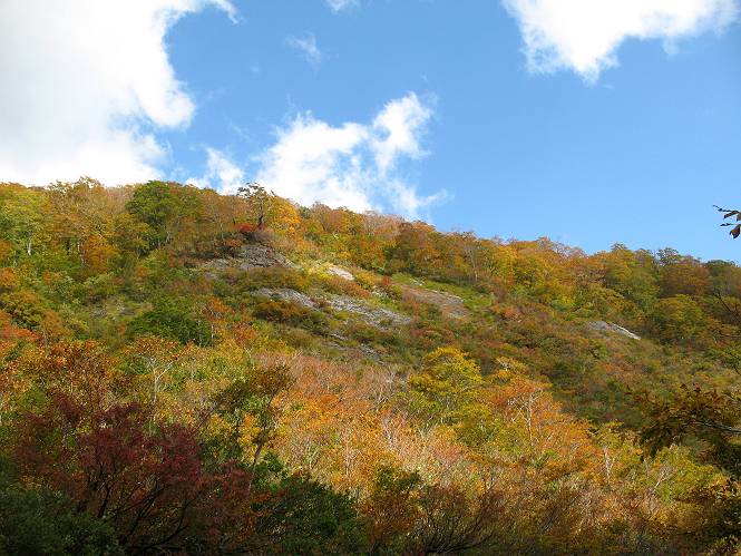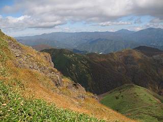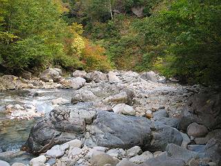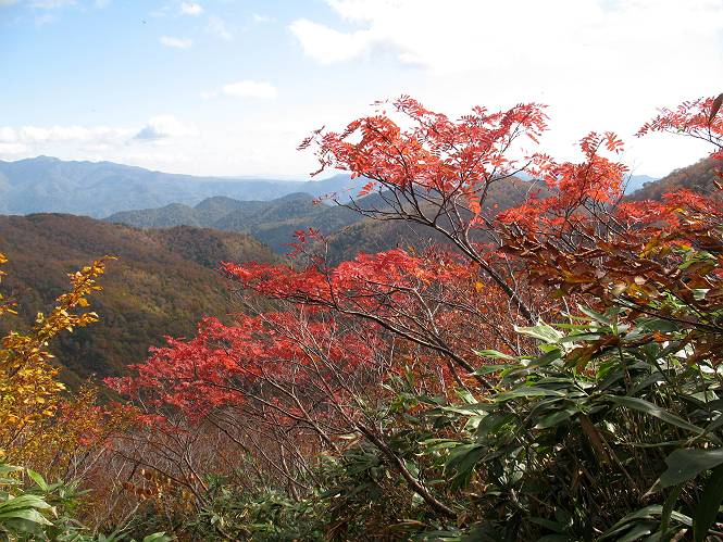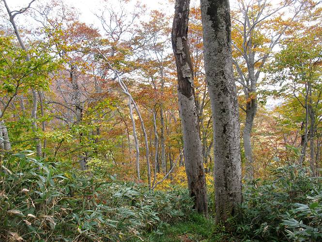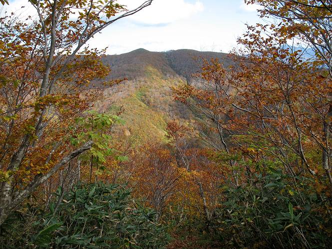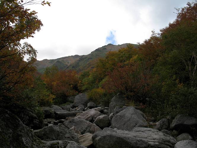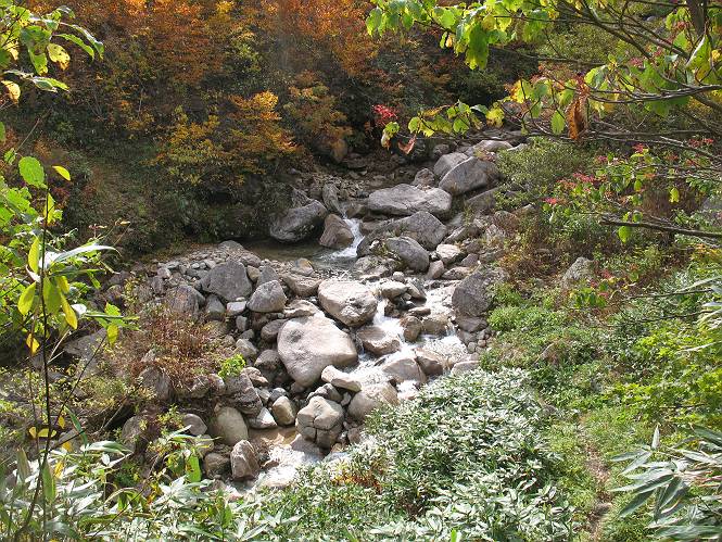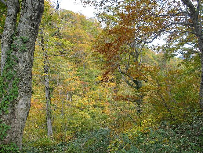 | sub3-467-3 後編:宝川へ下山 前編:土合橋Pから朝日岳へ 今の季節、コンコンと湧く水場を過ぎ、一面の草紅葉に見入る。よく見ると枯葉もあるのだが、そよ風に揺らぐ光景は季節の変わり目を感じさせる。大きな岩場を左に、右に白い削られたような露出した岩盤を見ると、下り坂がきつくなる。笹を刈り込んだ斜面、足元に気をつかう。東方向に張り出した尾根筋に向かうように左に反れながら下り、右に90度曲がって、潅木の間を真っ直ぐ下る。葉を落としたナナカマドやカエデが目立つが、当たれば真っ赤な紅葉の道になるのだとか。でも、残りものだろうか、赤、黄も徐々に濃さを増す、先方の斜面も赤茶色に染まっている。ブナ帯を抜け緩やかに右カーブして大石沢に出る、13:28。 【宝川分岐点〜大石沢出合い】 朝日岳東斜面の草紅葉 東方向に燧ケ岳を遠望 左下方に矢木沢ダム 南方向に上州武尊山 左にゴツゴツした岩場 右に白い大きく削られたような岩盤 紅葉の谷、宝川と大石沢 景鶴山と燧ケ岳、冬枯れの斜面が目立つ紅葉末期の峰 朝日岳山頂部を見上げる 急坂を真っ直ぐ下る、上方向を撮る 下方を撮る 紅葉の残る道 宝川を介した東斜面、右にカーブして 大石沢に出合う 沢筋と紅葉を眺めながら泥濘んだ道がしばらく続き、広河原でウツボギ沢を渡る、14:15。 【大石沢出合い〜広河原】 沢筋と紅葉を眺めながら泥濘んだ道が続く 上は黄色いトンネル 下はグシャグシャな道 イワナが遊ぶ大きな淵 広河原でウツボギ沢を渡る ここまで下ると、浅い紅葉となる。宝川の流れと岩場の紅葉が魅力的だが、渡渉点は要注意である。増水時、上りはあきらめて引き返せるだろうが、下りは難しいのではないだろうか。一昨日か昨日降って増水し、まだ安全にポンポンポンと渡れるほど引けてない。渡渉できそうな場所を探し、幸い靴を濡らさずに渡れたが、雪解けや梅雨時はキケンである。その不幸な証が、2,3箇所あった。渡渉点通過14:32、ここから斜面を上り、ダウン&アップを繰り返して進む、ほどほどの緊張感で見たが大きな滝も2,3ありそうだ。樹間からちらっと見えたが、渓谷をゆっくり見るだけでも価値ありそうな山道である、15:27林道終点、ゲート16:13着で予定のコースを終了する。 【広河原〜シャダンキ】 渡渉点比較的狭い場所 下流も・・・? ここで大石小石を飛び越えて渡った 左岸の渡渉点道標 日光白根山、錫ケ岳が見えると間もなく滝を下方に 林道際の滝 林道ゲート、番小屋が山に向かって左にあり 総所要時間は、10時間58分、天候に恵まれ眺望を堪能でき、紅葉もほどほどに楽しめたし、ペース配分もさすがtomoさん、疲労を感じないでコースを終了できた、感謝である。季節を変え、単独行したいが、ピストンでは? 前編:土合橋Pから朝日岳へ |