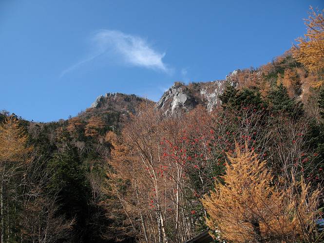 【後編:地蔵ケ岳〜鳳凰小屋〜青木鉱泉P】 【前編:青木鉱泉P〜薬師ケ岳〜観音ケ岳〜地蔵ケ岳】へ 山頂をあとに砂走り(?)を下る、このジグザグした砂道を上るのはきつそうだ、下りで良かった。急坂が終ると樹林帯に入る、間もなく鳳凰小屋着、11:43。五色滝12:18−30、白糸の滝12:48、鳳凰の滝13:20−40、南精進ケ滝14:06を眺め、幾分山際をアップダウンしながら紅葉見物、落葉して空いた中、赤&黄、若い黄緑の映える紅葉を眺めながら下り、ドンドコ沢付近に下る。ここから沢沿いのコースをとったが、道が荒れて長時間の歩行がキイタ、朝方見た案内板15:05、終着P15:10、総所要時間、丁度11時間の鳳凰三山一周を終えた。 ![]() 見上げればオベリスク 砂道の下りは楽だが、上りはね・・・・ 見下ろせば岩場の紅葉したカラマツ この辺がオベリスク見納めか 下ってきた実感、観音岳を見上げる、間もなく樹林帯に入る 明るいシラビソの樹林帯を抜ける、良い感じ 左手上方にカラマツが見頃の大きな岩場 小橋を渡り カラマツを見上げ 鳳凰小屋着 ナナカマドの赤い実もしっかりと 周辺のカラマツの紅葉、もう少し見られます ドンドコ沢滝見コースへ 沢の上流方向を見る カラマツの紅葉を楽しみながら 平坦な道もあったが・・・・・ オベリスクが見えた、これが最後だろう 思わず立ち止まりたくなる、美しいシラビソの森 五色滝 白糸滝 岩場とカラマツ 鳳凰滝 南精進ケ滝 【道すがらの紅葉】 ドンドコ沢と周辺山腹の紅葉 朝往路で見た案内板 ほぼ期待通りの景色を堪能でき上々だった。一周11時間は、そう甘くはないと思います、どこかで一泊するのが賢明、主稜線のコースタイムは2時間そこそこ、累積標高差2000mが重い山行である。右回り、左周り、あるいは通過等、コ−スが考えられるが青木鉱泉〜薬師ケ岳を除けば、当コース良いと思う。 追記:国道20号線から青木鉱泉までのアクセスですが、青木鉱泉公式サイトに従って、R20の桐沢橋東詰交差点を曲り、 桐沢橋を渡る⇒突き当たり右折⇒射撃場を過ぎる⇒突き当たりを左折⇒原山神社を右折⇒そのまま約30分で青木鉱泉へ (途中要所要所に看板あり、原山神社を曲がって約500m、林道が終って青木鉱泉までの約1kmは未舗装、他は舗装) 【前編:青木鉱泉P〜薬師ケ岳〜観音ケ岳〜地蔵ケ岳】へ |