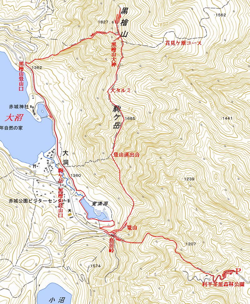コース概略図  国土地理院1/25000地形図に赤色で付記  戻り