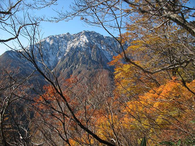 | 【後編:笠ケ岳-白毛門-土合橋駐車場】 【前編】へ戻る 去りがたい笠ケ岳山頂、二度と同じ感動は遇えない光景だろう。紅葉の谷を見下ろし、北の巻機山に目を転じる、気合を入れて帰路に着く。時々立ち止まっては、振り向き、左右の眺望を目に焼き付ける。小ピークを2つ、3つ越え白毛門に戻る、9:49-9:56。陽が回って、遠望する山々がくっきりしてきた、また一回りカメラに収める。誰も来る様子がない、もったいないなあ。 笠ケ岳から巻機山 苗場山、武能岳、紅葉の谷を介して霧氷の笠ケ岳西斜面 紅葉の谷、上部横に這っている線は旧国道291号線 同、紅葉の谷 帰路小ピークから谷川岳 同、白毛門 同、笠ケ岳 ![]() 帰路、白毛門山頂から平ケ岳〜袈裟丸山遠望 画像クリック拡大 ここからしばらく往路慎重を期した場所、しかし要所の露岩の雪氷は解け、アイゼンの必要性はなかった。凍結していたクサリも、簡単に岩から離れた。松ノ木沢の頭の少し手前で初めて男性に会う、「アイゼンを持ってないのですが・・・」、「大丈夫ですよ、注意して・・・」、間もなく往路で装着した場所で外す。松ノ木沢の頭10:35-10:55、3名休憩中のGrあり、果物をご馳走になり、つい長話をしてしまう。絶景に興奮気味であった、誰しも同じである。 帰路、松ノ木沢の頭から谷川岳 帰路、松ノ木沢の頭から谷川岳 クサリ場を下って、あとは足場の良くない急降下の道である。1300m付近から陽だまりの小低木、ツツジ、カエデ類の紅葉が出てくる。その下の層では橙に色づいたブナの森が、「早くおいでよ」待っている。谷川岳とブナ、カエデの紅葉を楽しみながら、急坂を下る、11:31桧のウロ着。 桧のウロ ここからのブナ紅葉が素晴らしかった。新雪の谷川岳、青空、橙色に輝く葉っぱ、時々見える濃緑のゴヨウマツ、良い目の保養になる。下るに連れて、葉数を増し、色合いも少しずつ黄色、黄緑へと変化してくる。つい、わが身の屋根を思い浮かべてしまう。沢の音が右に、左に、音量を上げていく。麓に近づくや、紅葉真っ只中にハナゲ沢の滝、ハナゲノ滝を見る。紅葉が一段と映える、山並と一緒で持ちつ持たれつの光景である、12:10急坂の始まる道標まで戻る。 ハナゲノ滝 ハナゲノ滝 道標から平坦地をに入る、一変して森が浅い紅葉、黄緑色の装いになる。ここもあと数日で大きく変わってしまうだろう。そして、白毛門も人を簡単には寄せ付けない山に変るだろう、また雪が解け、芽吹きの季節を迎えるまで。紅葉の末期〜初期を抜け、間もなく橋を渡って土合橋駐車場に着く、12:15。 土合橋駐車場の道標、白毛門まで3.1km 谷川連峰馬蹄形概念図 土合橋駐車場から紅葉真っ盛りの白毛門下方 総所要時間は、8時間15分、天候に恵まれ、新雪を頂いた谷川岳を白毛門、笠ケ岳から眺め、帰路は紅葉真っ盛りの中を抜けてきた。ラッキーな一日であった。私の過去データからすると、あと2週間ほど天気と相談すれば、谷川連峰へ入るチャンスがある。これからの時期、装備には気をつかいましょう。 【前編】へ戻る |