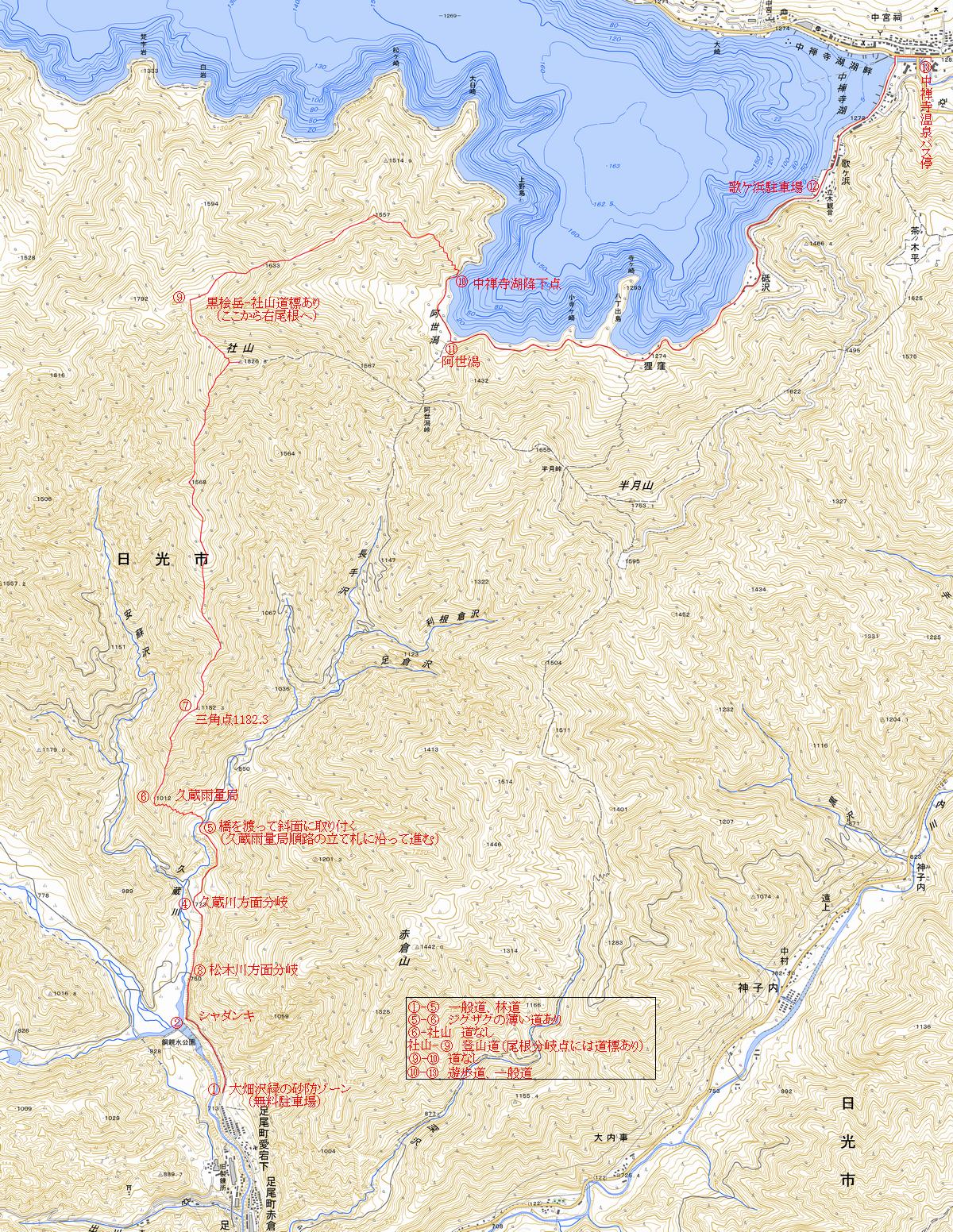 参考:累積標高は1276m(足尾を起点とする場合)、E-社山、H-I間には目印(ペイント、テープ等)は全くありません。