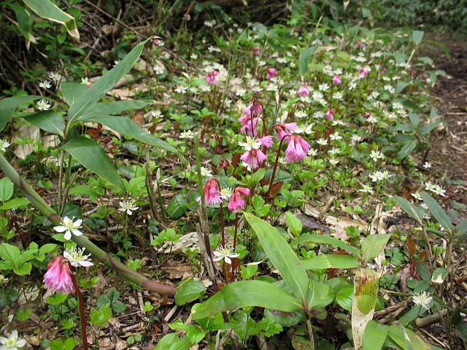 | 帝釈山・田代山&台倉山の花編 戻り 【樹床付近で逢った花】 ◆オサバグサ 散り始めてます。 ◆ゴゼンタチバナ ◆ギンリョウソウ(蕾) ◆ミヤマカタバミ ◆サンカヨウとツバメオモト ◆ミツバオウレン 【山頂付近の潅木帯で逢った花】 戻り ◆ベニサラサドウダン 帝釈山山頂にて 田代湿原にて 台倉山山頂にて ◆イワナシ 全開 蕾 ◆アズマシャクナゲ 咲き残りです ◆ハクサンシャクナゲ 咲き始めです。 ◆コヨウラクツツジとオオバスノキ ◆ムラサキヤシオ ◆オオカメノキ 【高層湿原で逢った花】 戻り ◆ヒメシャクナゲ ◆ワタスゲ(これは綿毛のついた実です) ◆タテヤマリンドウ ◆コイワカガミ ◆チングルマ・・・・咲き残りに近かったですね。 ◆オネエラン ◆ミズバショウとツマトリソウ 咲き遅れた一輪 真ん中がとんでシマッタ 戻り |