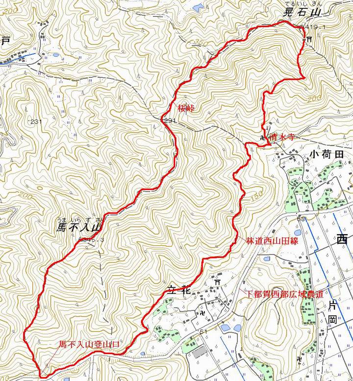 コース概略図  国土地理院1/25000地形図に赤色で付記  戻る