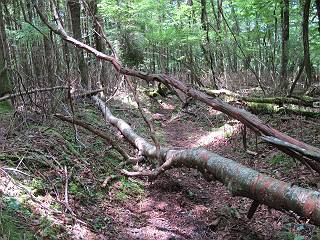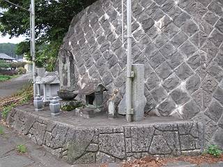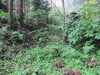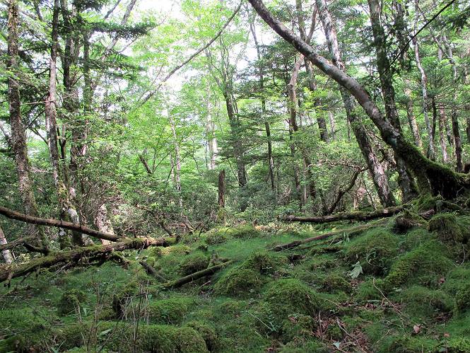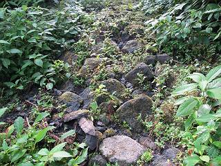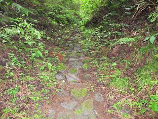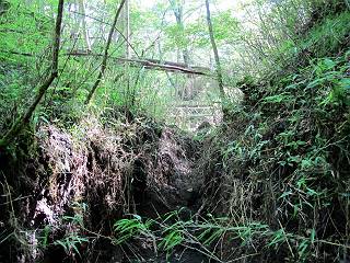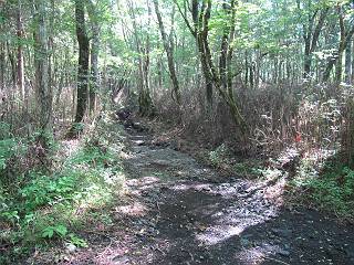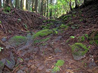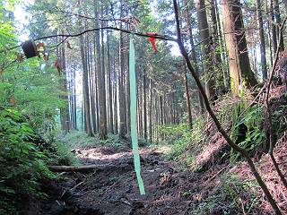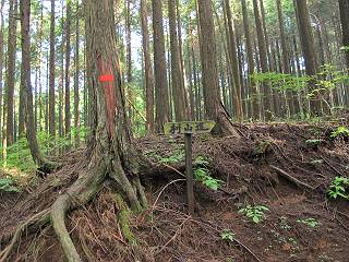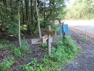 | 日本橋⇒富士山 7日目(富士市大淵→富士山スカイライン高鉢P付近) ページTOPに戻る 8日目へ 1日目へ 2日目へ 3日目へ 4日目へ 5日目へ 6日目へ 歩行日 2012年7月19日(木) 晴れ 単独 コース 富士市大淵→富士根本宮村山浅間神社→富士山スカイライン高鉢P付近 15.6km (地図:日本橋⇒富士山 7日目(予定) 実歩行ルート) 大分延びてしまった当計画、ブッチギリとなっても完遂を目指す。6日目の富士市大淵三社氏神社(千貫バス停付近)を4:00、ヘッドランプをつけてスタートする。現在はどんよりと曇っているが日中は晴れ予想、地図を片手に、目標物を見失わないように歩く。出発点の標高は200m、予定では新6合目は2484m(実歩行は高鉢P付近で標高1600m)と標高差が約2300mある。村山古道の不明箇所の多いルート、机上のシュミレーションを繰り返してきたが、最後は行き当たりバッタリで臨む、これがスリリングで面白いところだ。平坦地、とは言っても富士の裾野の話、緩い勾配が続く、村山浅間神社まではスニーカー履きとした。地図に従って、道しるべを通過、村山浅間神社着、5:25-5:55、標高500m。歴史が語る鎮守の森、大杉、大銀杏の風格、村山浅間神社は典型的な神仏習合、右手に興法寺大日堂がある。今は複数の五合目から山頂を目指すが、その昔の富士修験と村山口登山道、ここがその中心だったのだ。 三社氏神社(千貫バス停付近) 道しるべ3 道しるべ4 道しるべ5 自販機の向こう側を 右折する コンクリートの農道(?)を通り 梅雨っぽい草道を抜け 富士宮市境界を左に見て直進して 石仏群を右折 ヤマユリが道沿いに植えてある 正面の急坂を上る 道なりに進むと水神の碑 沢は涸れていた 異形四差路を進む 四差路正面に道しるべ6がはめ込んである、左村山 右に曲ると Y字路 正面に道しるべ7 道標の説明 間もなく右手に石神を見て R469の下を通り村山浅間神社の大きな杉に突き当たる 左に曲り、富士根本宮 村山浅間神社 富士修験と村山口登山道の歴史 大杉 画像クリック拡大 樹高47m、目通し909m、樹齢推定1000年とか 村山浅間神社は典型的な神仏習合 拝殿、奥に本殿 右に興法寺大日堂 西側の道からいよいよ山頂へと進んで行く、一歩一歩。舗装道路を少し進み、小高い神社を巻いた所で、往時を語る石畳を踏む、明け方雨が少し降ったようだ、スパッツをつけてきたが、腰まで濡れてきた感じ。最奥の家を過ぎ、山間へと入って行く。コンクリートの作業道を歩き杉林の中に入る、地図を見ながら一つ一つ“馬頭観音を左にチェーンをくぐり・・・”、こういうことか。そして赤いテープの場所に来た、ここまではOKとみた。 富士山への道標旧、新 集落の出外れに残る、石畳 最奥の人家手前の村山道の道標 地図を見ながら一つ一つ ここから入ったが山中をさまよい ここから濡れた山間に入り、そのまましばらく進むと、道は細くなり平坦になって行止まった。見上げると高圧線の鉄塔が左手少し上にある。東に150-200m反れたようだ。鉄塔作業用の泥濘んだ道を這い上がる、ズボンはビショビショ、泥だらけ、野バラを思いきり掴んで痛かった。幸いかな薄日が差してきた、鉄塔から正規ルートの方向の先を狙って、本格的な藪漕ぎだ。杉、雑木、低木の混じった低勾配の斜面を上って行くと林道に出た。林道を上って行くと二又に別れ、上に上って、コンクリートの枝道へ、 間もなくこの道は終わり、川状の道となり石垣を組んだ道を通り、杉林に入りついに村山道の道標を見つけた。汗を拭きながらの奮闘、正規のルートに出られたようだ、6:50-7:28.入り込んだ赤いテープから40分、この間ルートは外れたが、時間的には20分もロスしてないだろう。 林道からい川状の道、石垣を組んだ道を通り 多分天照教社の西側の斜面だろう、林中には陽が差し込んでいた。苔むした道を上って行くうちに、赤いテープと緑の紐に気づく、そして新しそうな踏み跡が、今朝かな、昨日かな。道標から道も明瞭になり、天照教社を枝間から右手に見て林道へ出る、7:58、小休止。林道から村山道は天照奥ノ院を向いていたが、地図に従ってテープのあった右手に入る。V字の道(川?)を進むと間もなく、吊橋と導管、先を行く男性を見たが、這い上がっている間にどこかへ消えた。後から来る様子も無い、踏み後もなくなった、しかし道は明瞭、道なりに進み富士山麓山の村、緑陰広場に出た、8:26、小休止。しぼったタオルの汗は、300ccを超えるだろう、採った水分は700ccあまり、汗で地図も滲んでしまって・・・・。 村山道の正規ルートに出た 杉林の中の苔むした道 気づくと赤いテープと緑の紐が道沿いについていた 天照教社の施設を右手に林道に出る 林道から村山道は天照奥ノ院を向いていたが、 地図の従ってテープのあった右手に入る 吊橋と導管、先を行く男性を見たが、・・・ 道なりに進み富士山麓山の村、緑陰広場を横切って右手に 富士山麓山の村、緑陰広場を横切って右手に山の村施設があり、左は散策路が迷路のようになっていたが、目印