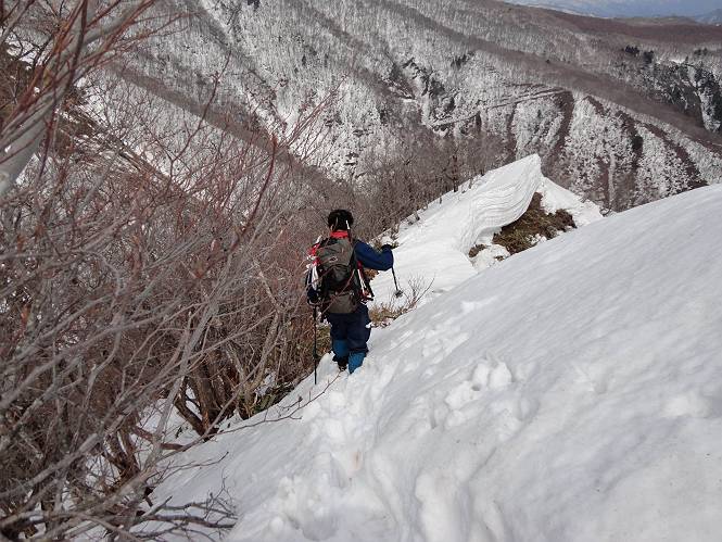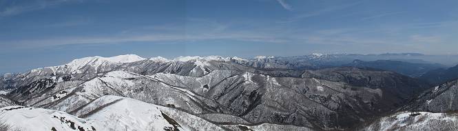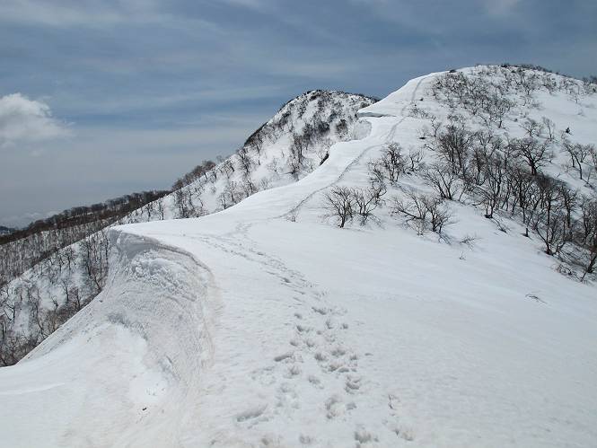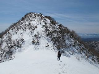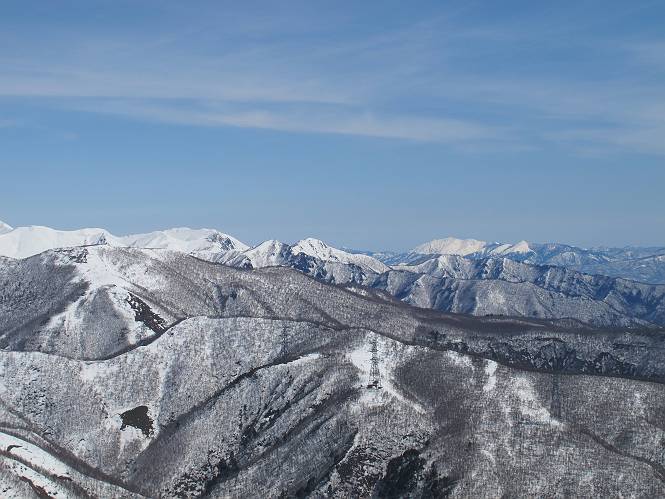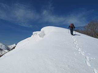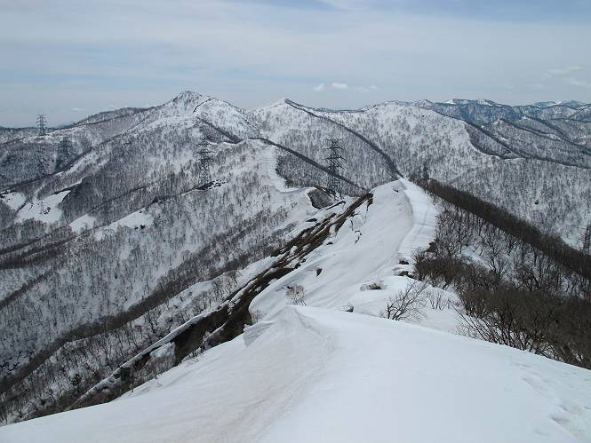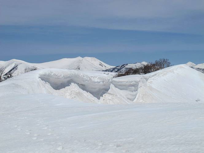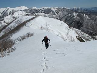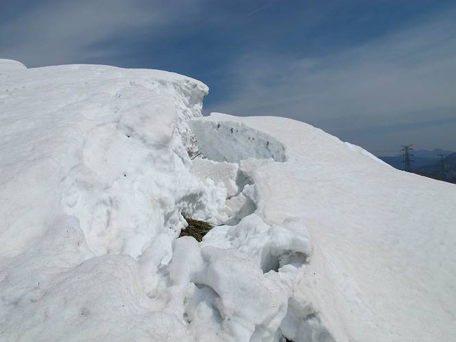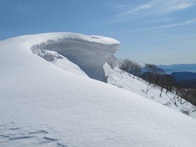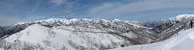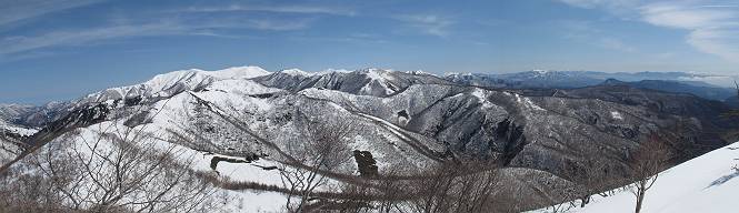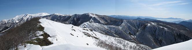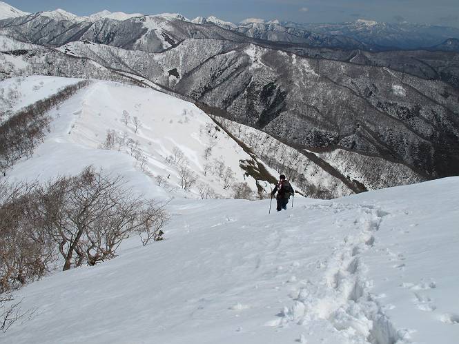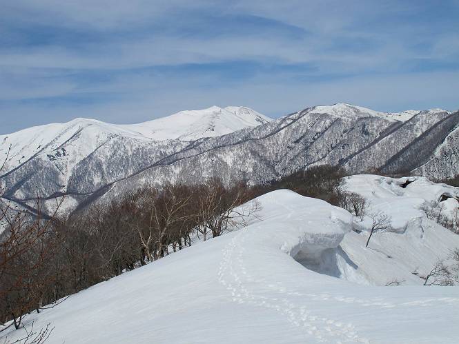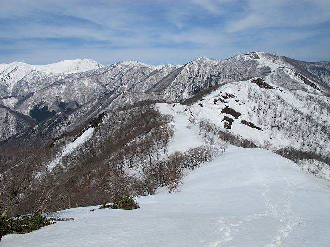 | 後編 前編へ戻る キワノ平ノ頭からしばらく雪庇の道をアップダウンを繰り返し進み、送電線の鉄塔目指して下る。送電線はほぼ鞍部にあり、三国峠から3番目と4番目の鉄塔である。1/25000地形図で山歩きする場合、送電線の位置が目印となり便利である(電子国土には記載されてない)、が反面、特にこの2系統の送電線と鉄塔は景観を阻害している。写真を避けてみたが、まともに入ったものもあった、コベックラ沢分岐(3番目の鉄塔)8:56通過、No.180鉄塔分岐(4番目鉄塔)9:06通過。P1461を下った所で先頭の交代、といっても私が先を歩きたかっただけ。気温が上がり雪が緩んできたせいか、最後の登りで、ズボズボはまってしまった、10:26稲包山山頂着。 キワノ平ノ頭から進む斜面には大きな雪庇ができていた、 雪庇と榛名山 雪庇と赤城山 大きな雪面には風紋が残っていた、 雪面の模様@ 雪面の模様A ![]() 見渡す西側の峰々、白砂山、筍山、苗場山 画像クリック拡大 ![]() 北〜東の峰々、平標山〜赤城山、と歩いてきた尾根筋、 画像クリック拡大 ![]() 南東方向の峰を遠望、錫ケ岳〜子持山 画像クリック拡大 緩やかに上る雪庇、稲包山と西稲包山の間に浅間山が顔を出す 稲包山と西稲包山の間に浅間山、3番目の鉄塔近し 雪庇から落ちた雪だるま、雪庇崩落のメカニズムか 榛名山遠望、左から二ツ岳、相馬山、少しあいて榛名富士、鬢櫛山、掃部ケ岳 雪庇が大きく発達していた 恐る恐る先まで行ってきた 雪庇と赤城山遠望 下り 大きな崩落がこれから? 登り返す また下る、手前が3番目、奥が4番目の鉄塔 北側斜面は樹林帯 巡視路分岐、 3番目の鉄塔通過 少しおいて4番目の鉄塔通過 4番目の鉄塔から武尊山、日光白根山、錫ケ岳、左下は3の系統 ![]() 鉄塔を過ぎて鞍部付近から稲包山〜袈裟丸山 画像クリック拡大 ![]() 同、平標山〜袈裟丸山 画像クリック拡大 小稲包山(稲包山手前のピーク)登りに入り先頭タッチ 後方からtomoさん 稲包山山頂直下 あと一息で山頂 稲包山山頂到着 山頂からの眺望@ 浅間山〜苗場山 画像クリック拡大 以下5枚は関連 浅間山周辺 浅間山、黒斑山 白砂山周辺 忠次郎山、上ノ倉山周辺 苗場山、筍山周辺 山頂からの眺望A 平標山〜日光白根山 画像クリック拡大 ![]() 山頂からの眺望B 平標山〜袈裟丸山 画像クリック拡大 以下4枚は関連 平標山、仙ノ倉山周辺 大源太山、エビス大黒ノ頭、万太郎山周辺 谷川岳、至仏山周辺 武尊山、日光白根山 ![]() 山頂からの眺望C 榛名山〜浅間山周辺 画像クリック拡大 以下4枚は関連 榛名山周辺 四万湖周辺 浅間隠山周辺 浅間山周辺 好天下、二人だけの稲包山、大気が大分ガスって視界が落ちてきた、帰路の道も長いので、11:11山頂を後にする。12:09コベックラ沢分岐、キワノ平ノ頭12:48-12:57、ここを出てクッキリした靴跡を発見、後から来た方が折り返したようだ。長倉山13:54-14:03、三国峠14:33小休止、どこからか人声がする、見上げると三国山の2名、峠の周りには歩き回った複数の跡、三国トンネルの群馬側から上ってきたトレースもあった。ジグザグしたルートをショートカットを繰り返し、三国トンネル(新潟側)駐車点14:59着。総所要時間は、10時間3分だった。 【帰り道】 山頂を後に細い尾根を下るのだが、 靴がズボズボ入っちゃって 平標山、仙ノ倉山、エビス大黒ノ頭、万太郎山、一ノ倉岳、谷川岳 武尊山、日光白根山、錫ケ岳 至仏山、笠ケ岳 苗場山周辺 画像クリック拡大 絶景を眺めながらのアップ & 絶景を眺めながらのダウン 雪庇、往路で見たときより多少丸くなったかな、後ろは平標山、仙ノ倉山 雪庇 稲包山を振り返る 稲包山を振り返る 雪庇の道が続く 鉄塔も気にすれば気になるが・・・・・・ 三国峠から4番目の送電系統 三国峠から3番目の送電系統 雪庇 雪庇 雪庇、崩落近し? 稲包山を振り返る、キワノ平ノ頭付近から キワノ平ノ頭まで戻る、小休止 キワノ平ノ頭の南斜面、滑り落ちてボコボコしていた キワノ平ノ頭付近から三国山までを見通す、左から平標山、仙ノ倉山、大源太山、三国山 雪庇と平標山、仙ノ倉山、大源太山 雪庇と三国山 丸くなってしまった雪庇、間のクラックあったかな? このクラック、往路はなかったような気がする 三国山を一望する 画像クリック拡大 三国峠から2番目の送電系統まで戻る ヒッコラ上って、 長倉山 崩落の進んだ道が続く、ヤブに入ったり出たり ここも、ヤブに入らないと? 三国峠を真下に見る、後ろは三国山 三国峠から1番目の送電系統と三国峠 三国権現到着 シリセードの2名、楽しそう 三国峠からジグザグの登山道をショートカットして下る 旧三国街道沿いの道祖神に迎えられて無事ゴール 天候に恵まれ、朝のうちは少し風があったが、暖かく、快適な山行ができた。コースとしては距離とアップダウンの連続、雪庇を気にしながらの山歩きで、決してラクではなかったが、写真を撮るのに立ち止まっていた時間が長かったので、疲労感はあまり感じない。日に焼けた顔と目、が少々気になる。2007年11月3日に、こ